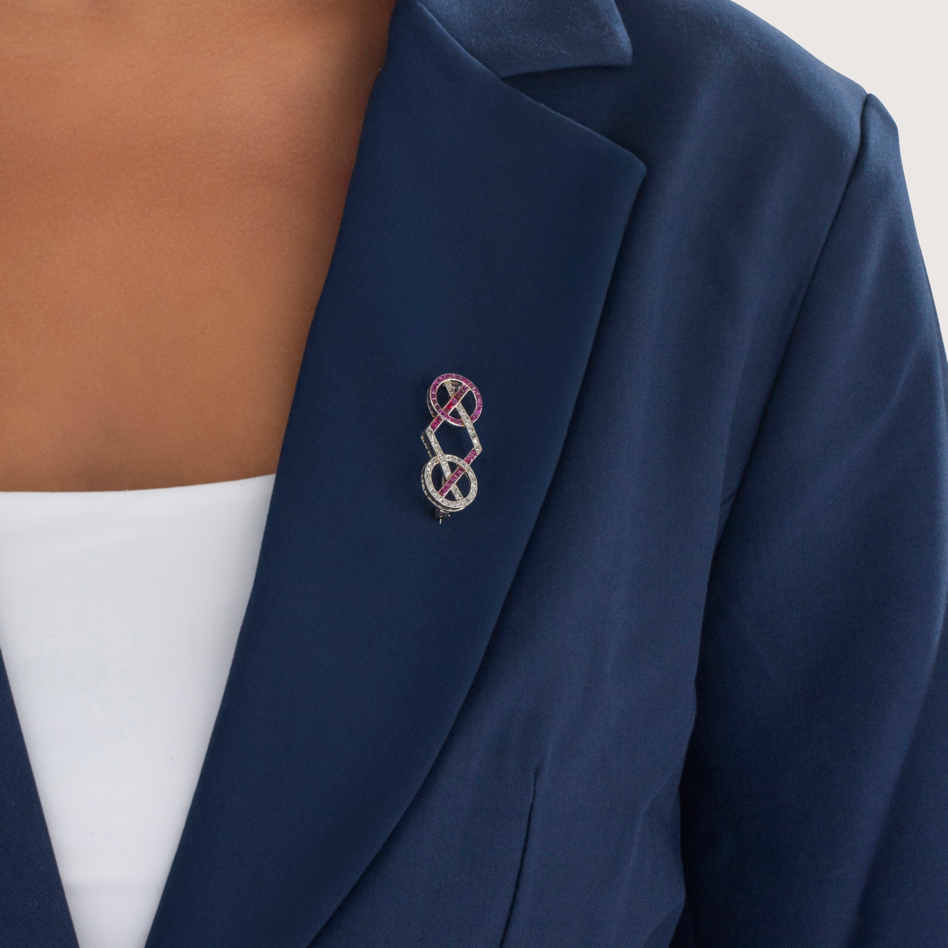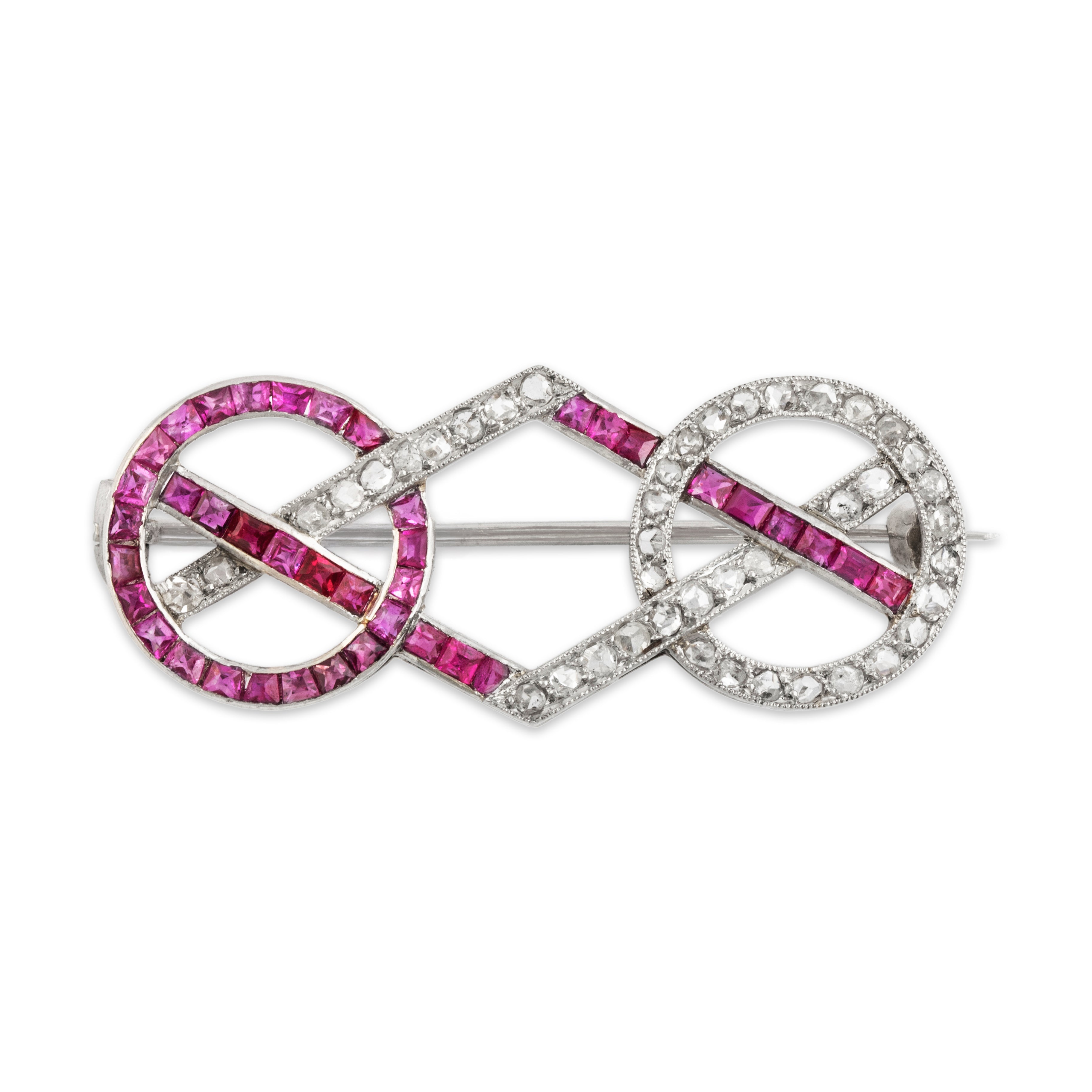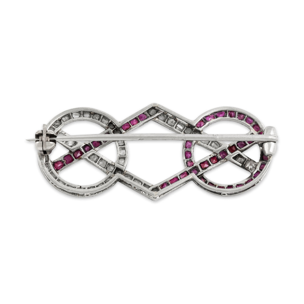 Condition: Very good condition, not eye-visible, seen under 10x magnification: some nicks to several diamonds, rubies; minor wear to platinum settings