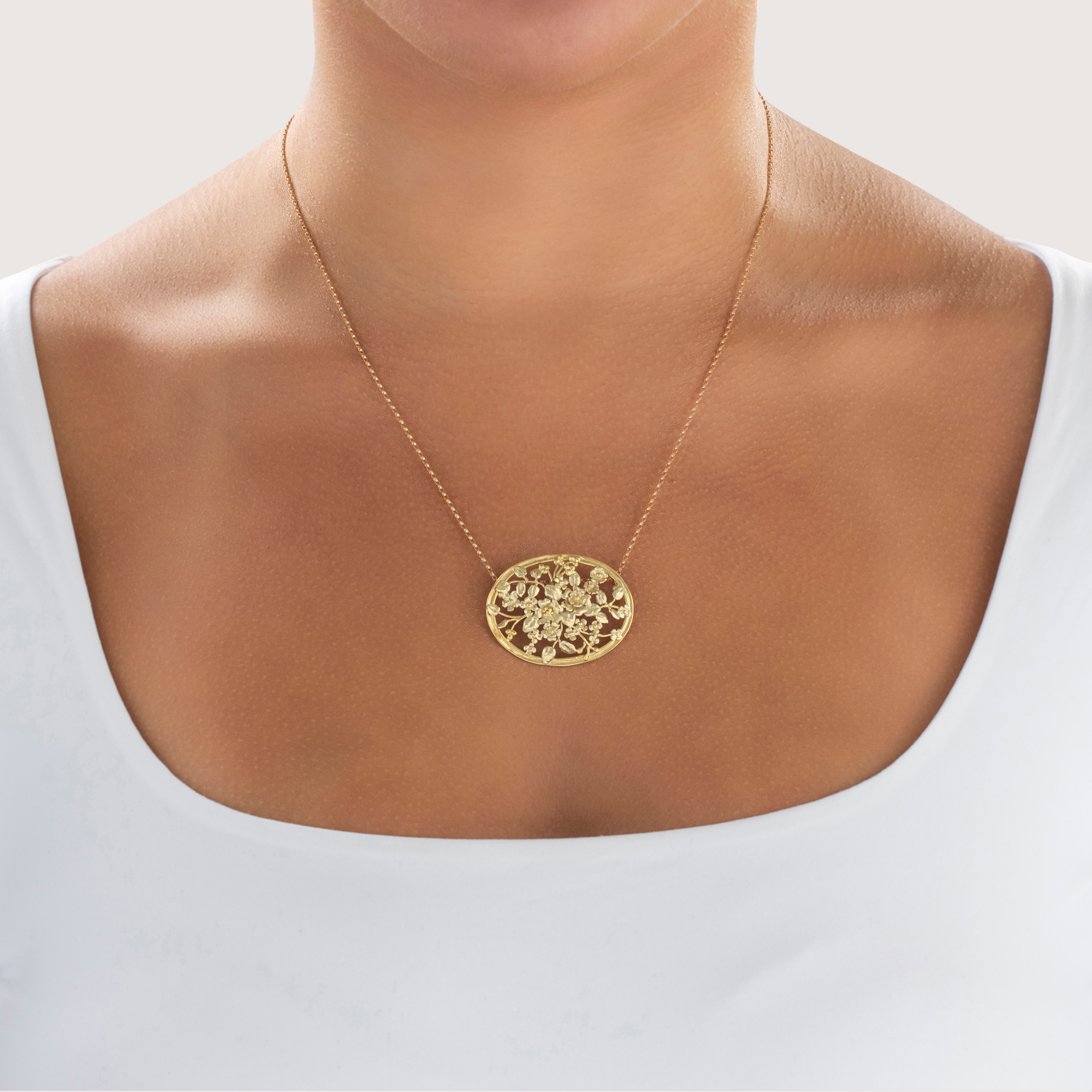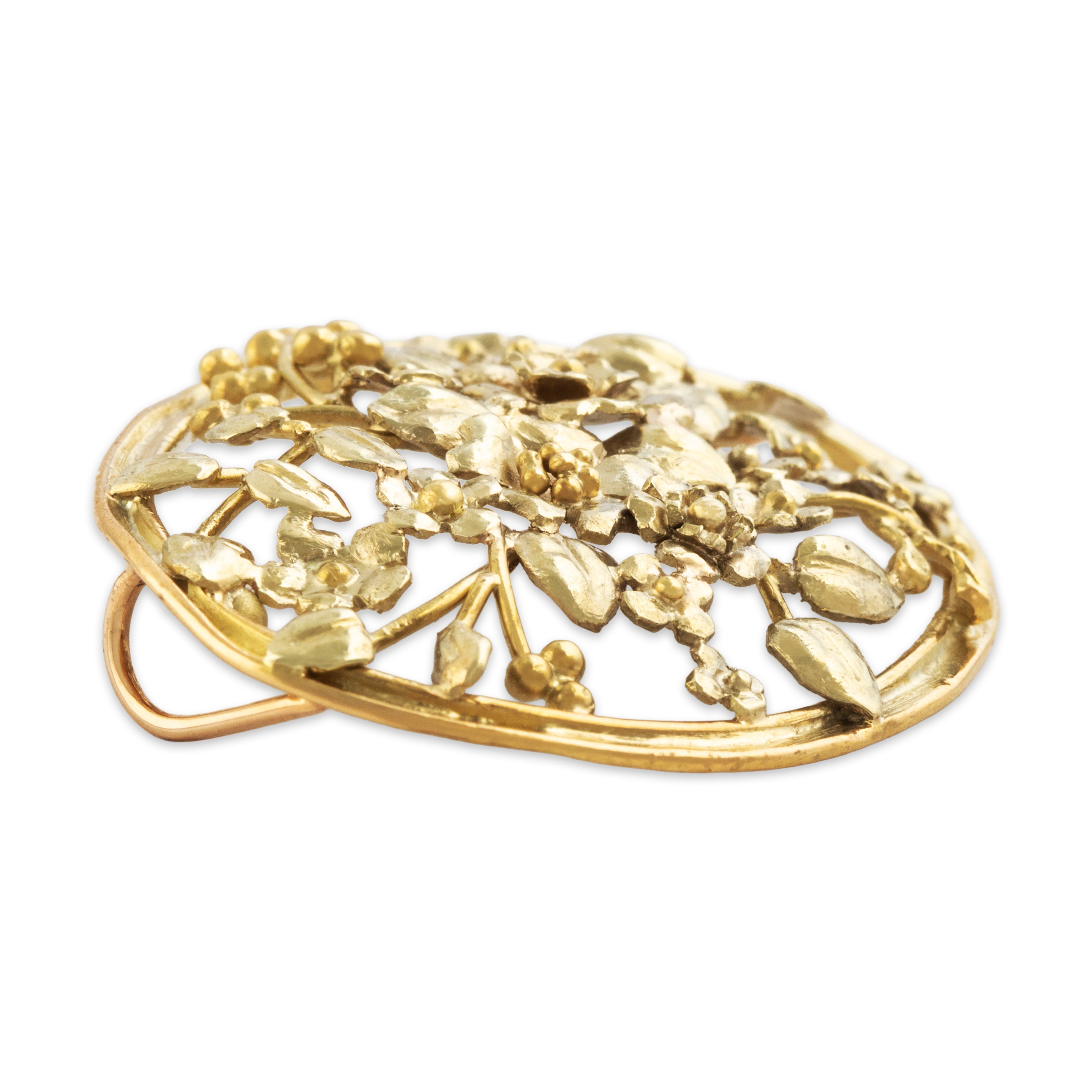 Discover this large 18k yellow gold slide pendant crafted by an antique maker in a wonderful flower bouquet design.