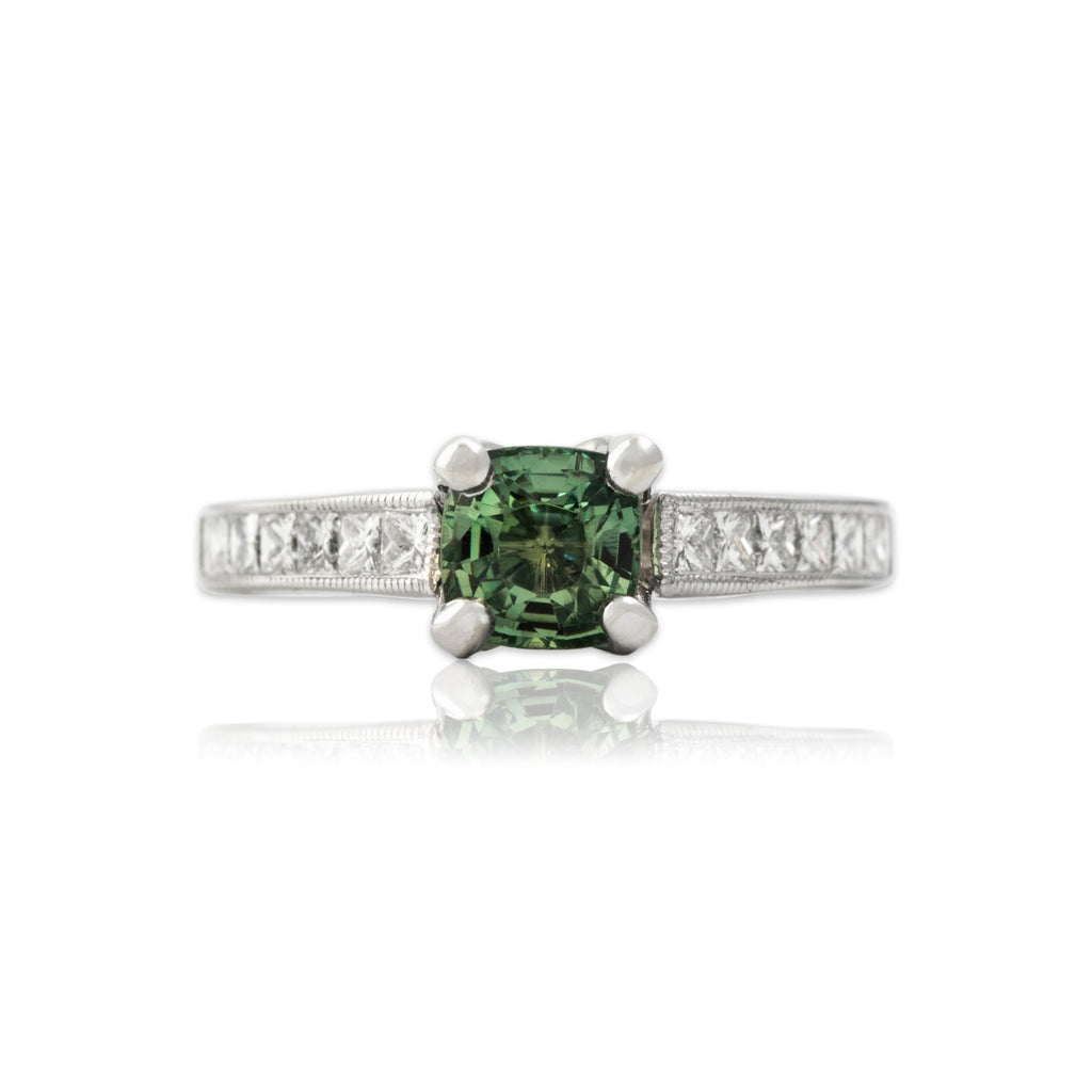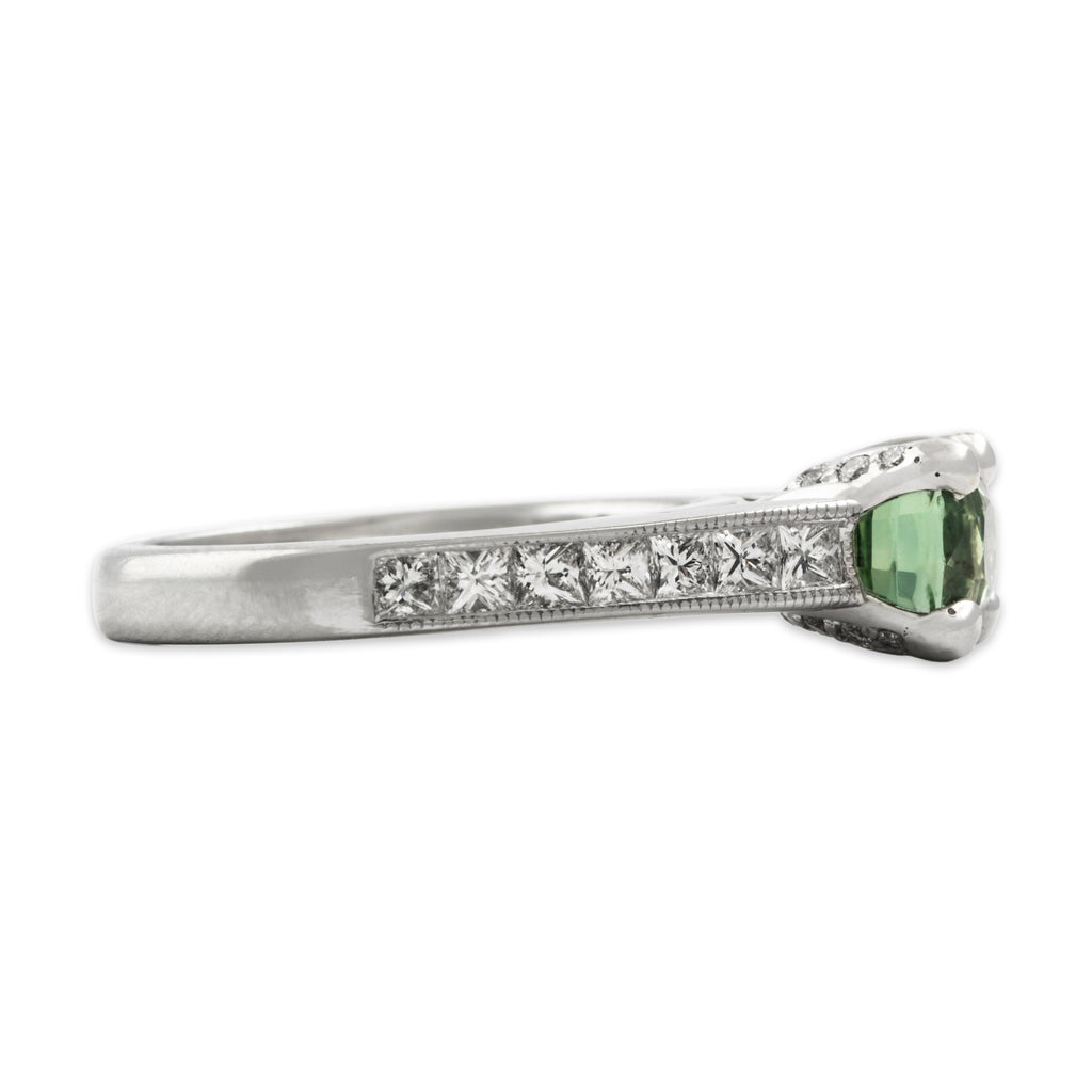 Discover this 14k white gold ring crafted by a vintage maker in a wonderful dazzling adorned cathedral design featuring green sapphire and diamond. All gemstones are natural, earth-mined stones, unless stated otherwise.