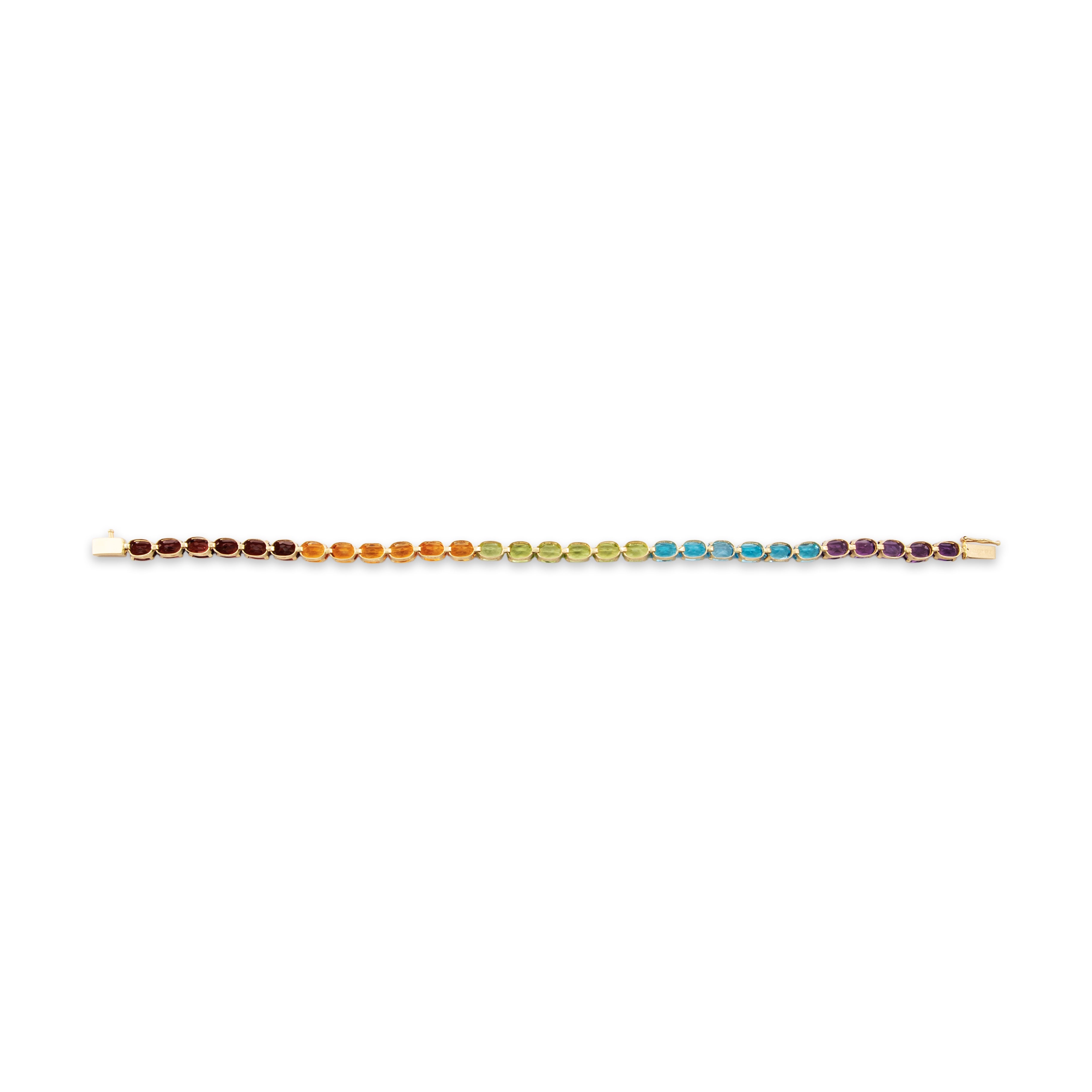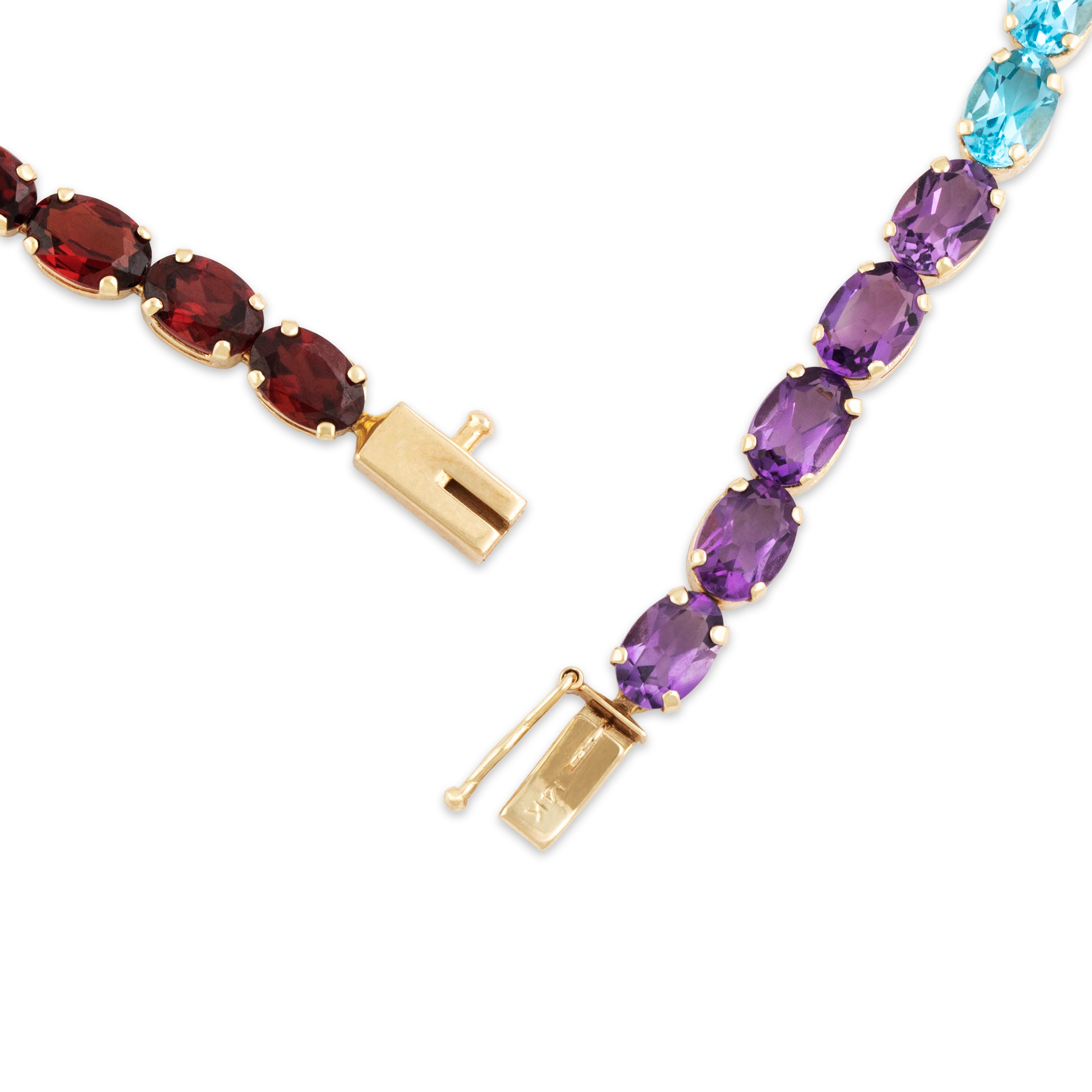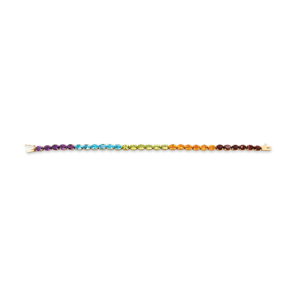 Discover this 14k yellow gold line bracelet crafted by a vintage maker in a wonderful rainbow design featuring garnet, citrine, peridot, blue topaz, and amethyst. All gemstones are natural, earth-mined stones, unless stated otherwise.