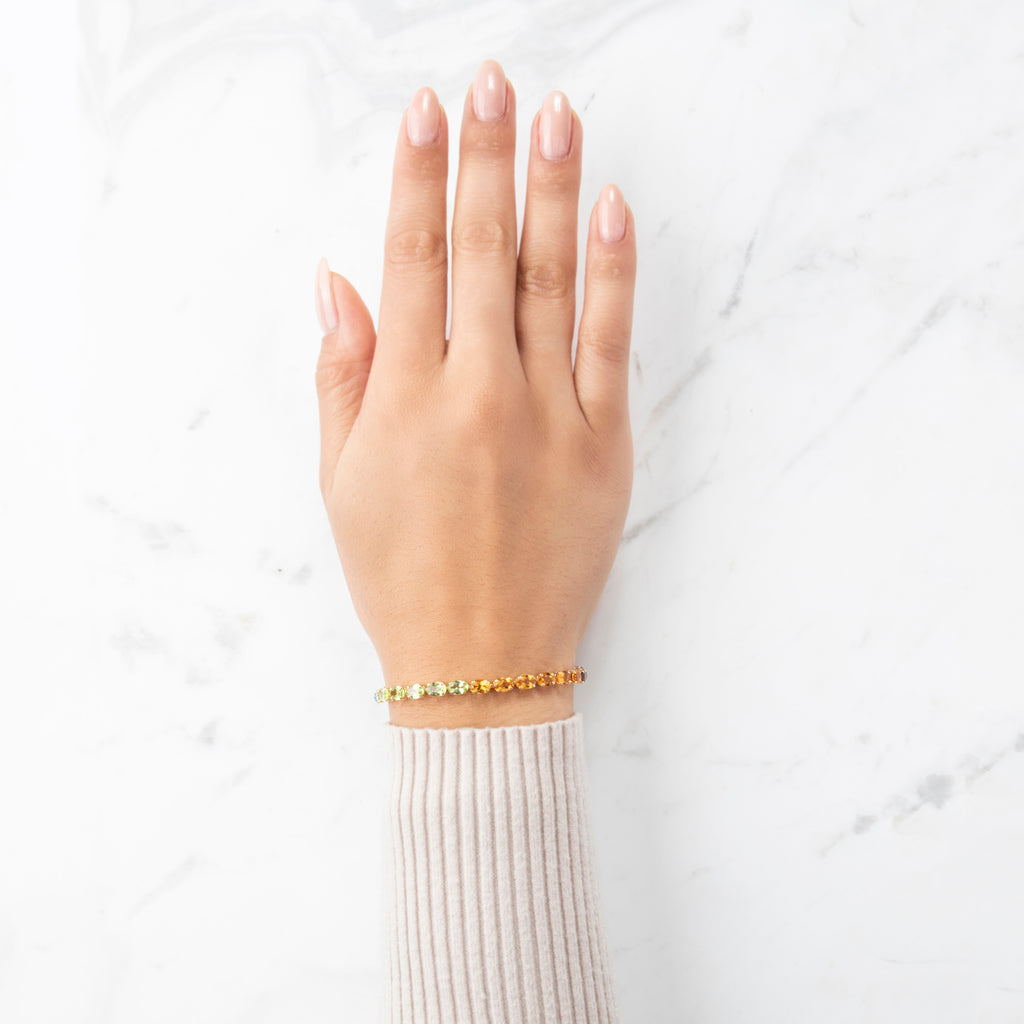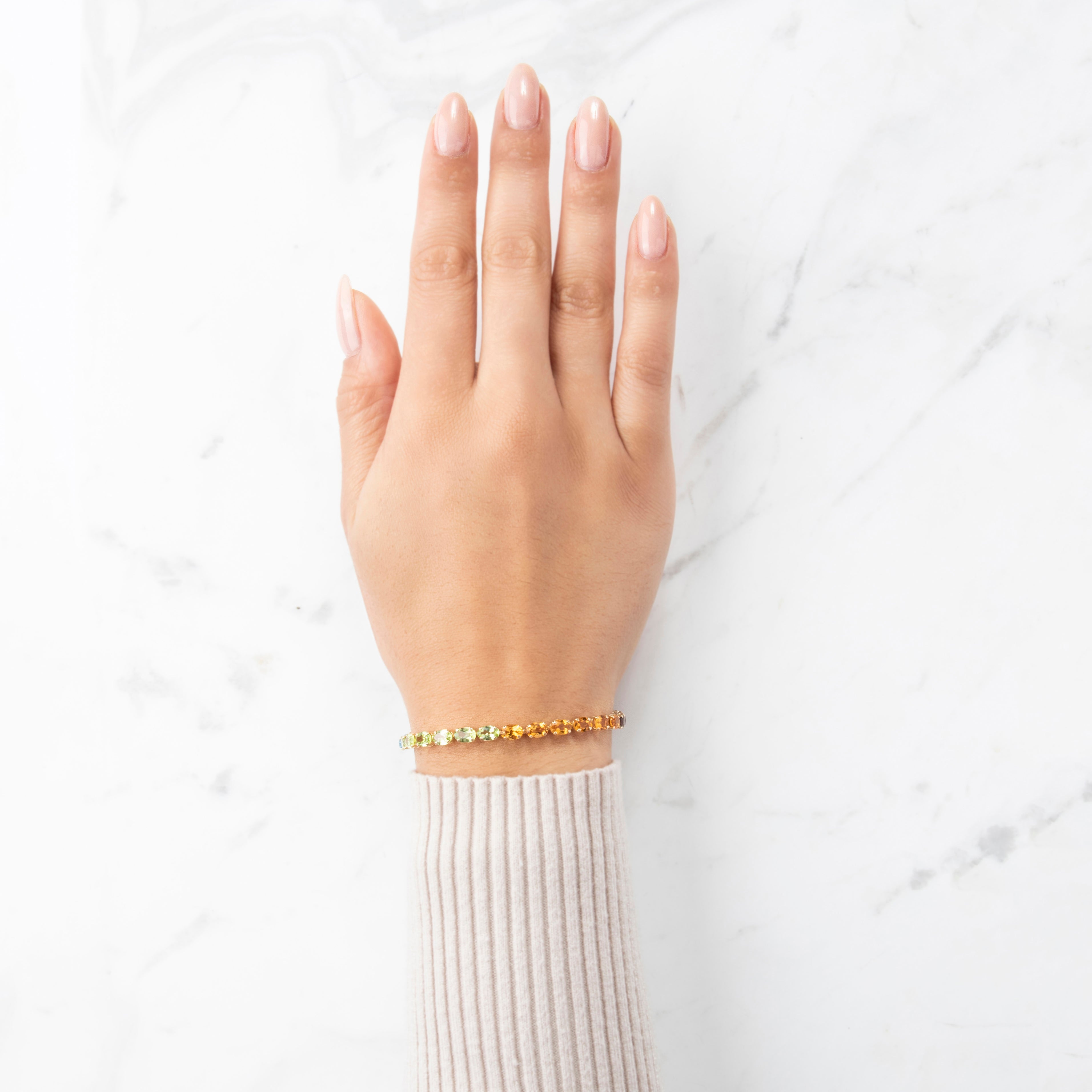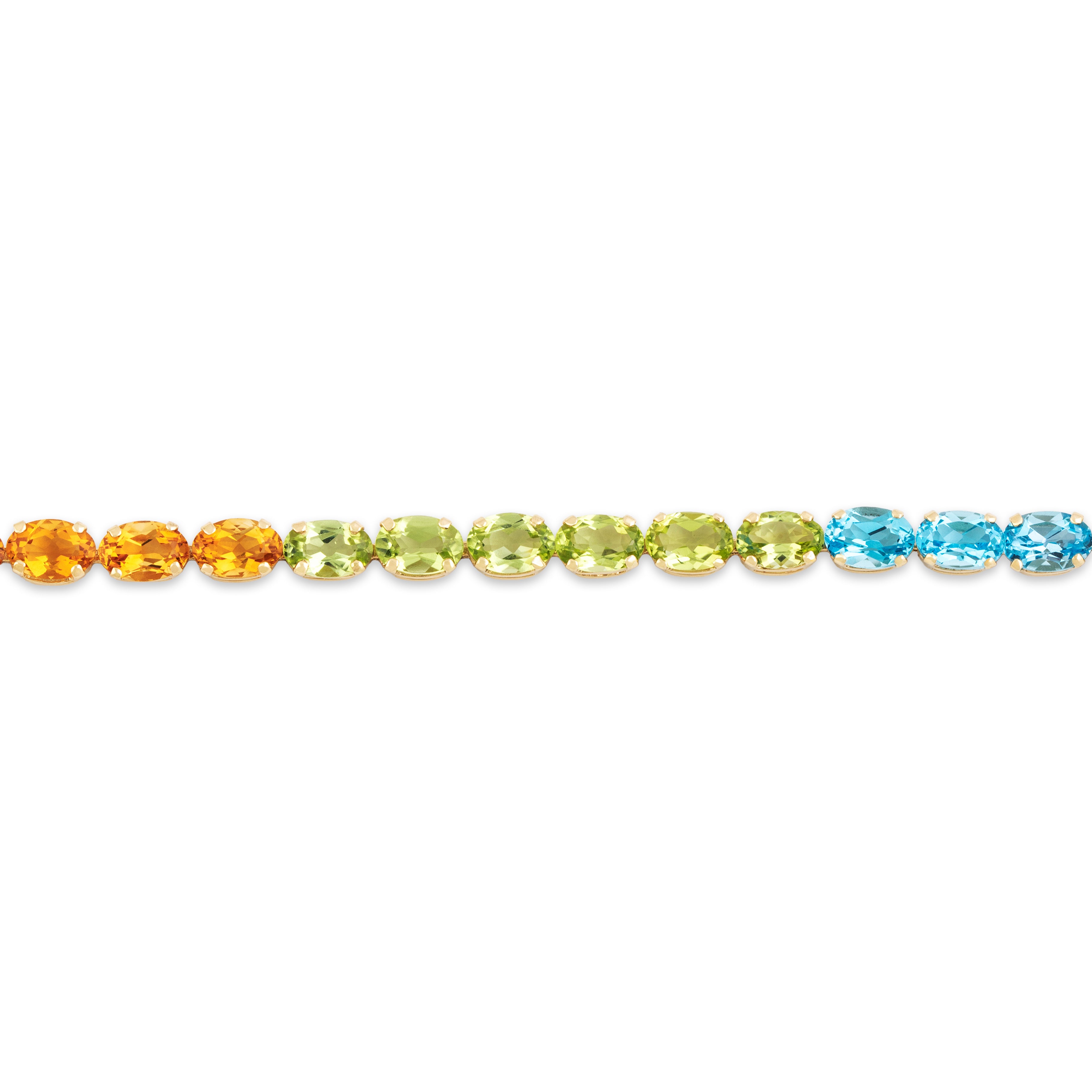 Discover this 14k yellow gold line bracelet crafted by a vintage maker in a wonderful rainbow design featuring garnet, citrine, peridot, blue topaz, and amethyst. All gemstones are natural, earth-mined stones, unless stated otherwise.
