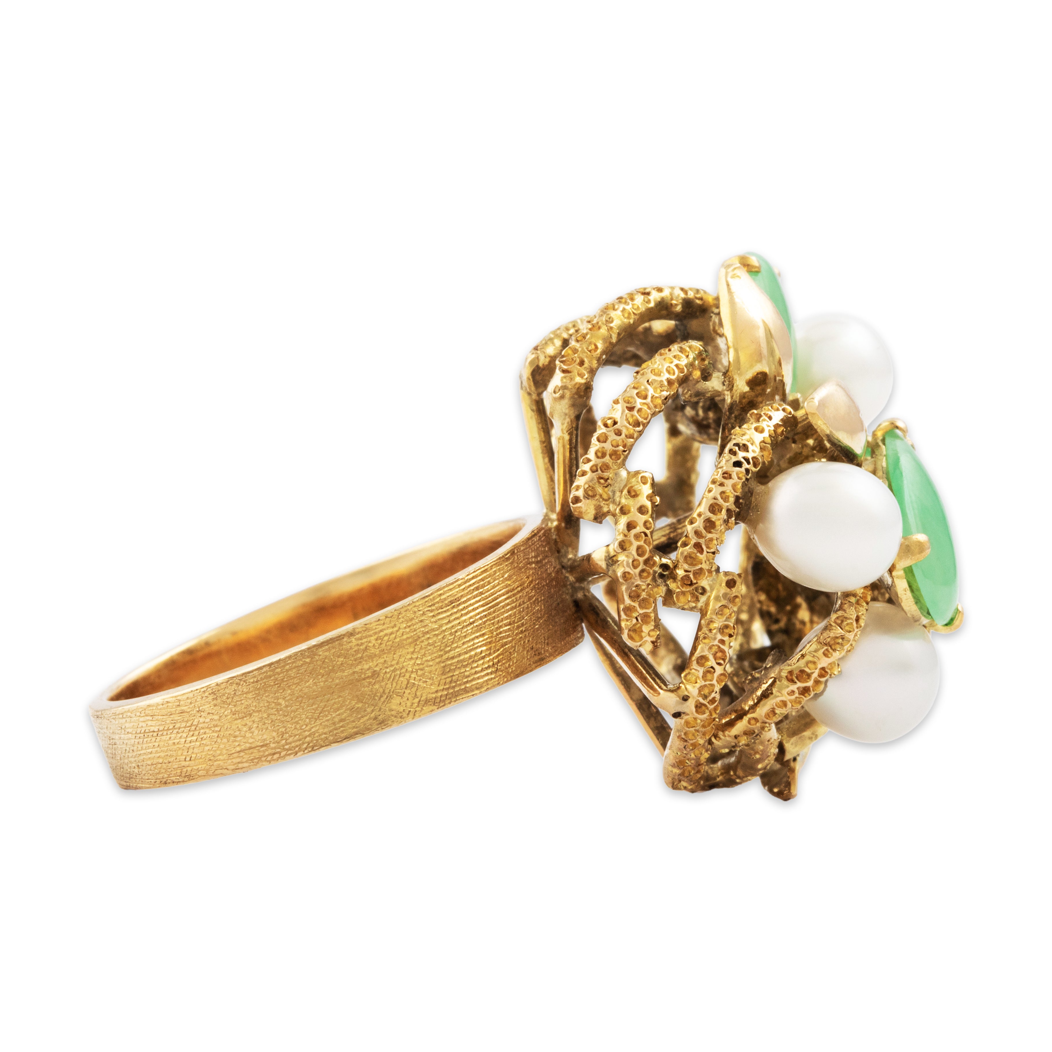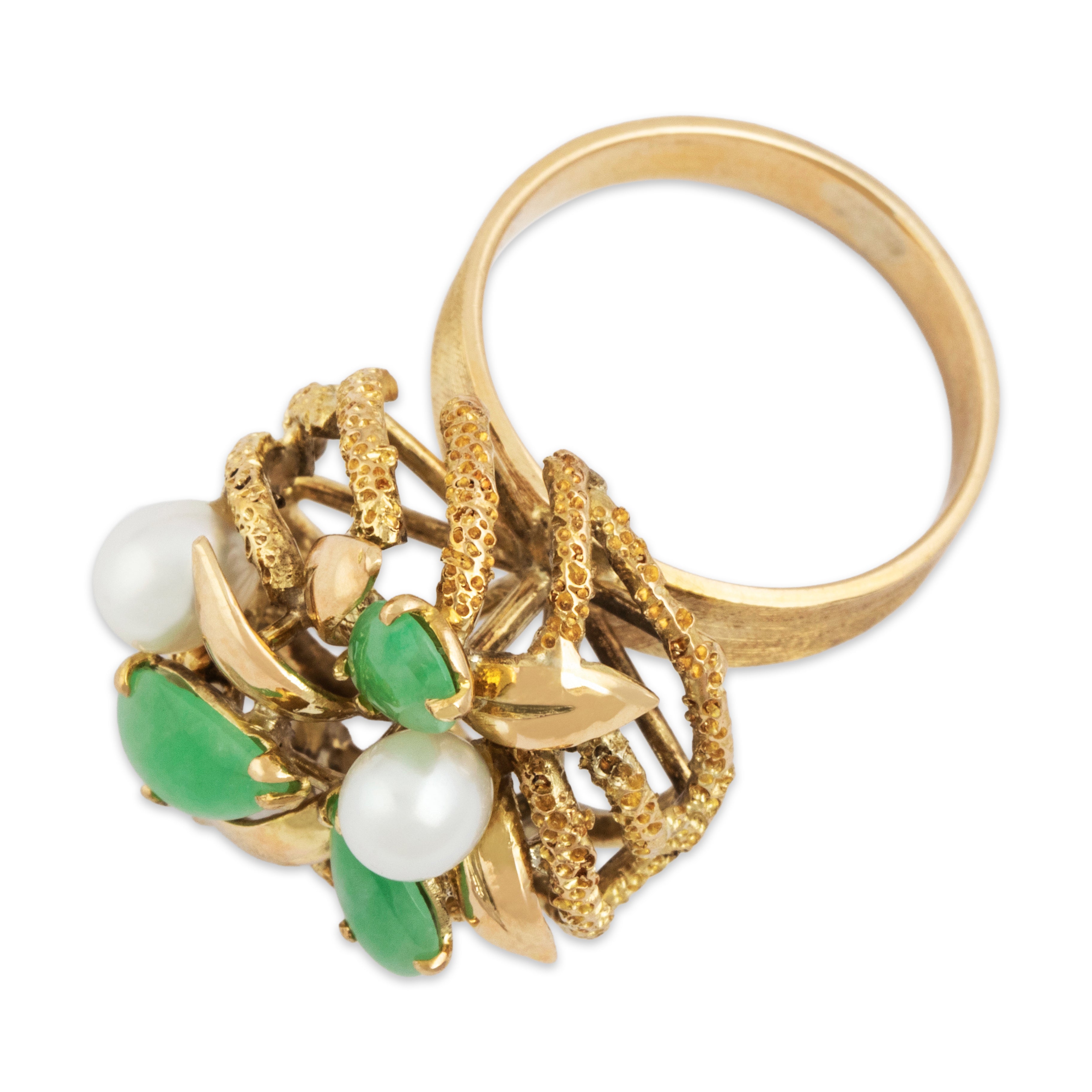 Discover this 14k yellow gold ring crafted by a vintage maker in a wonderful textured foliate design featuring jade and pearl. All gemstones are natural, earth-mined stones, unless stated otherwise.