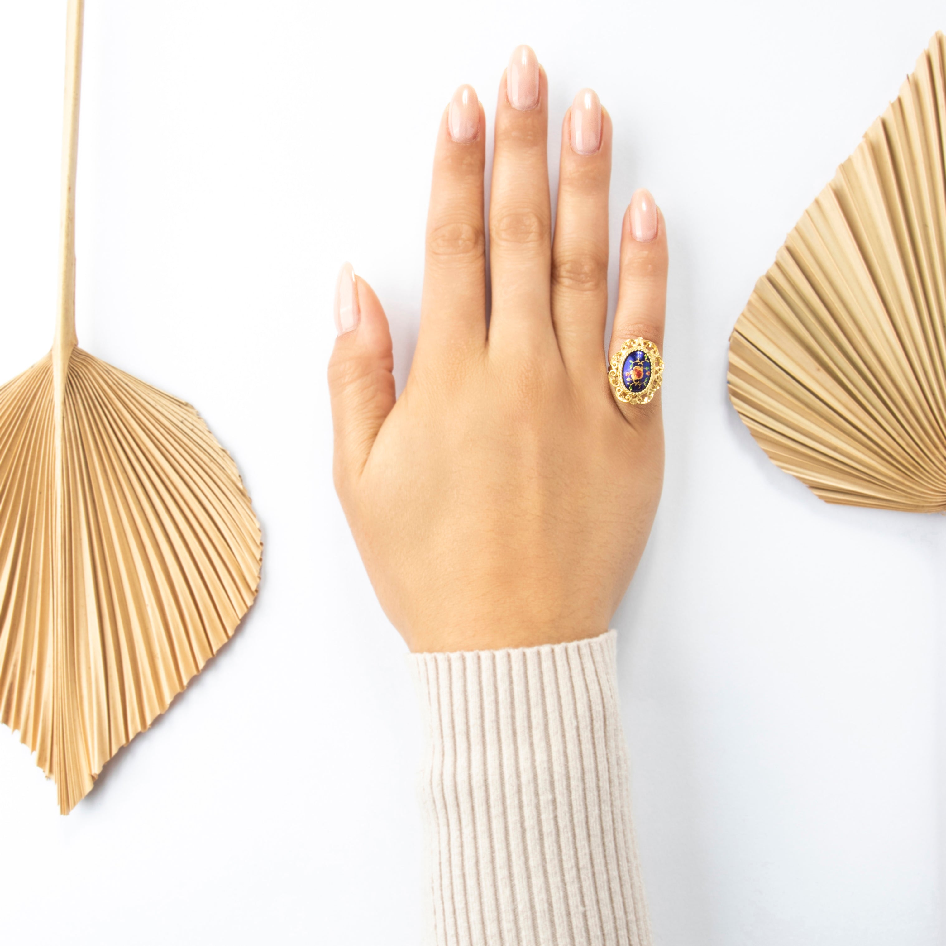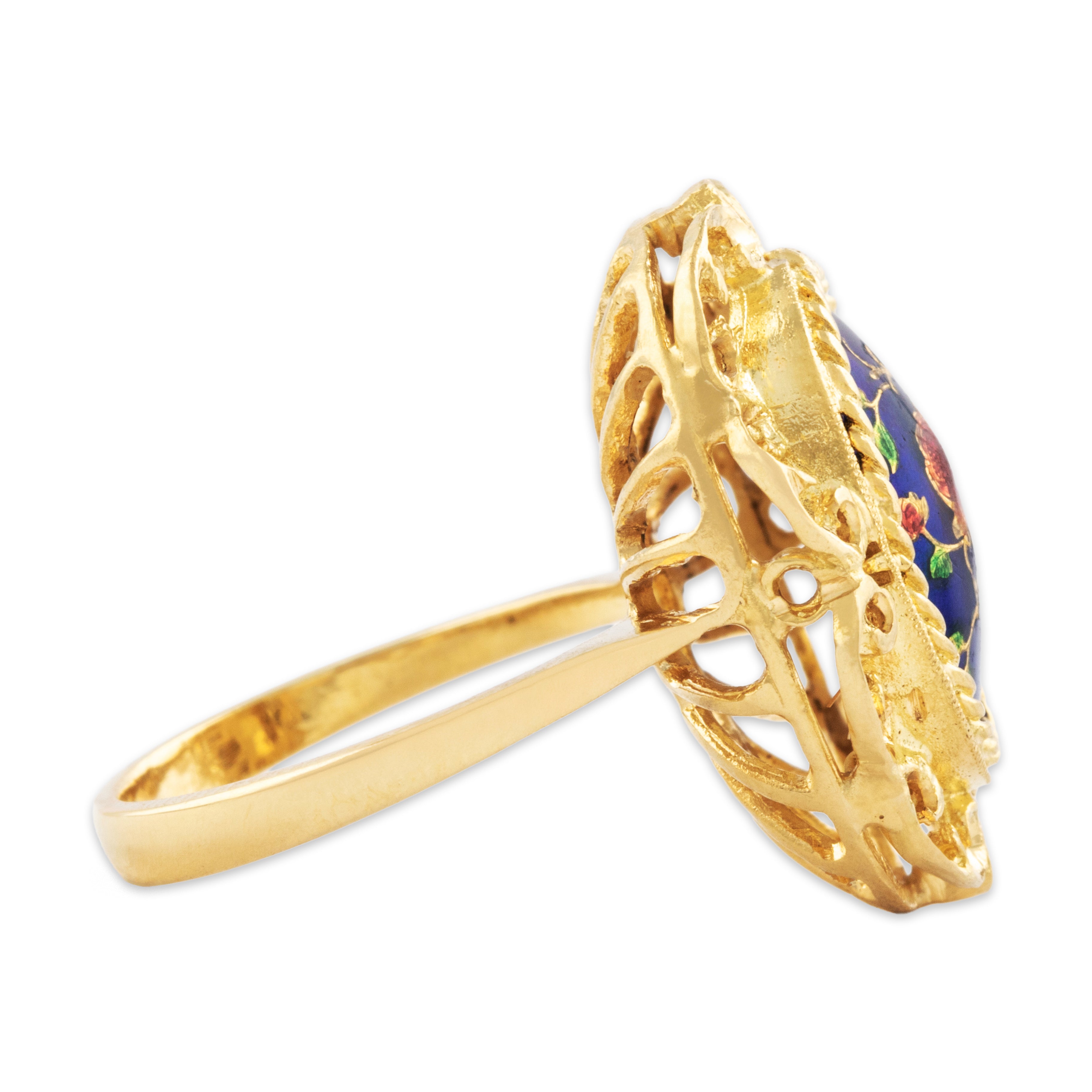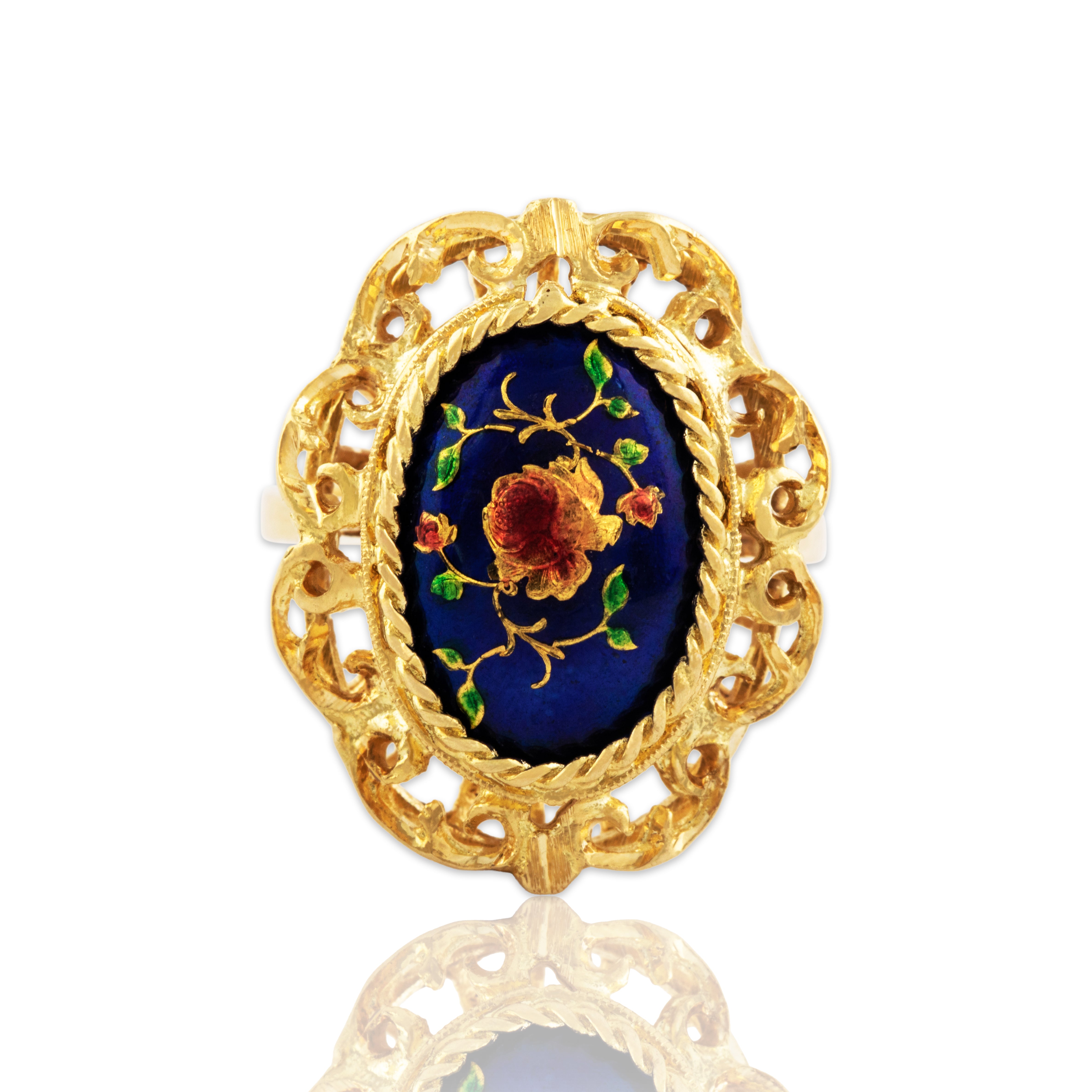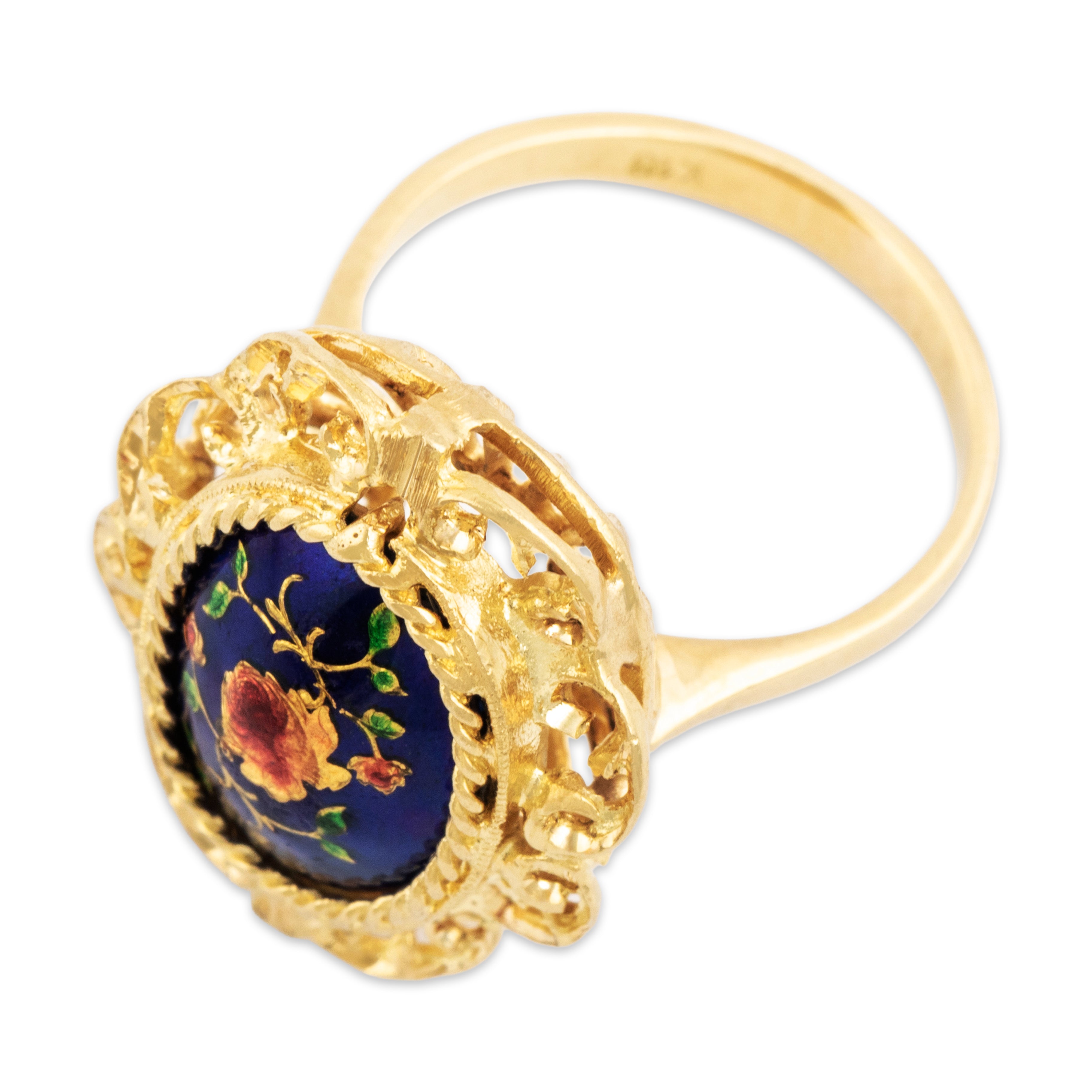 Discover this 18k yellow gold ring crafted by a vintage maker in a wonderful enamel rose design. All gemstones are natural, earth-mined stones unless stated otherwise.