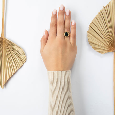 Vintage Heavy 14k Yellow Gold Onyx Opal Dramatic Brutalist Statement Ring 7.00