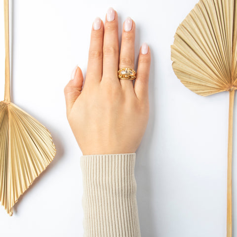Vintage Heavy 14k Yellow Gold Diamond Ribbed Foliate Wide Ring 6.25