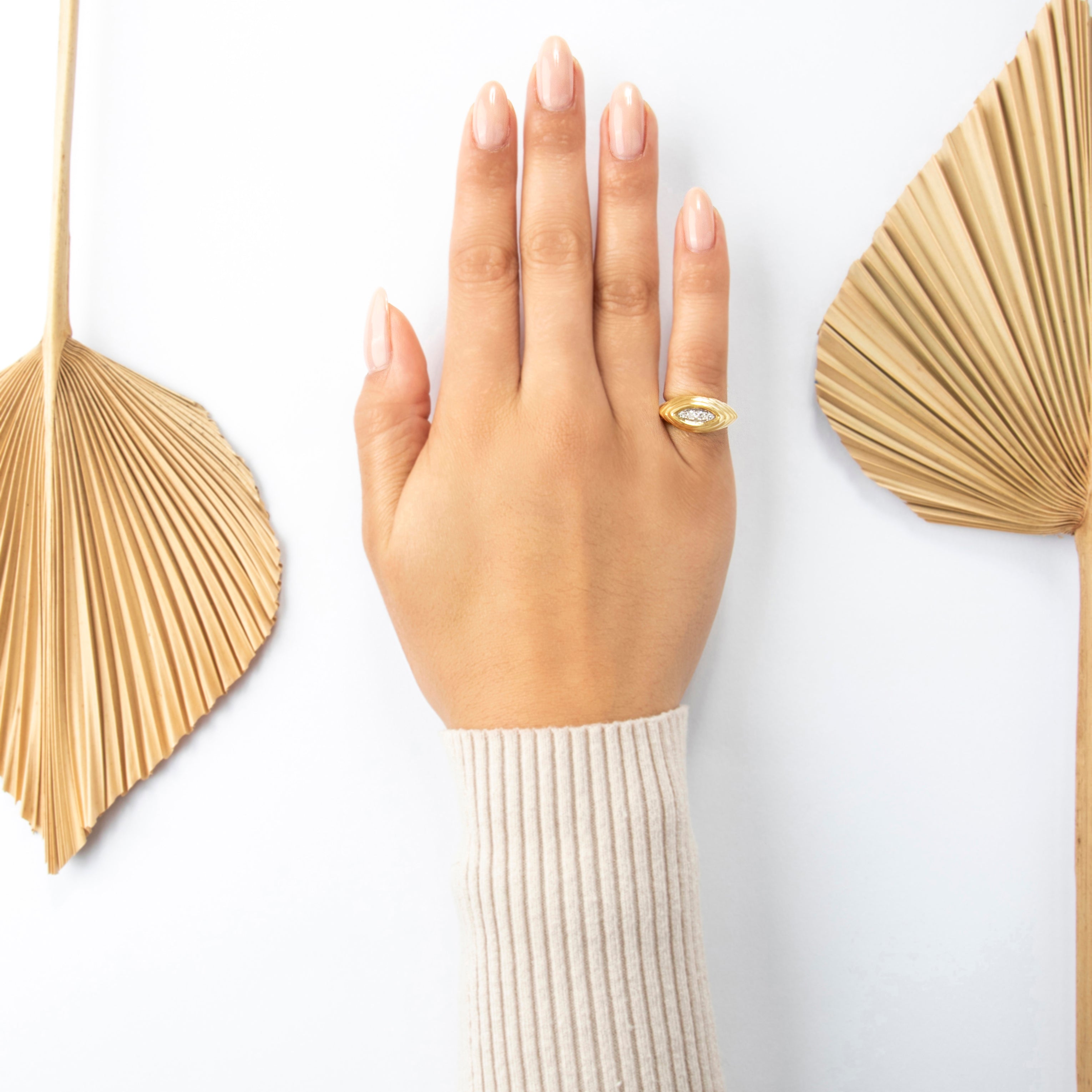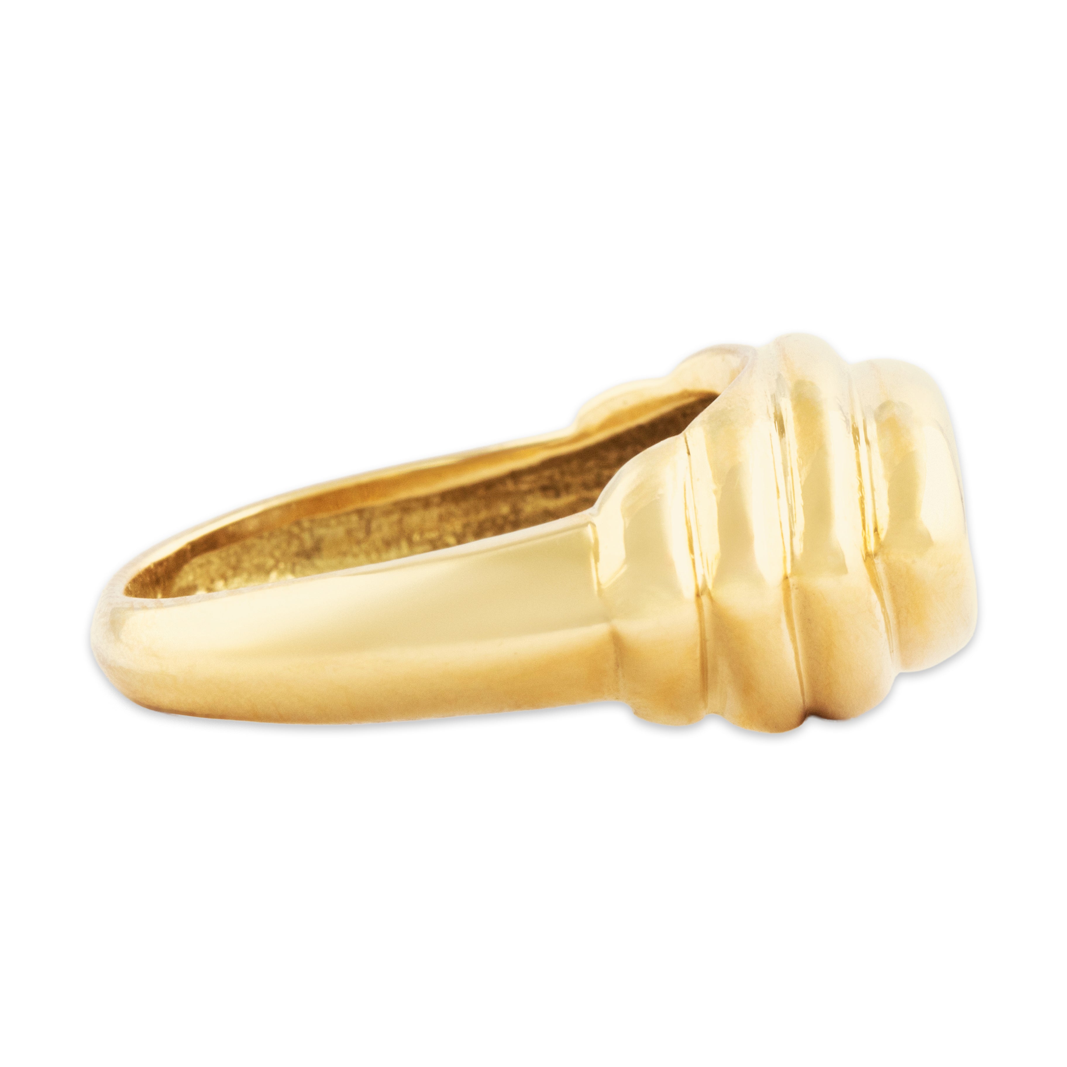 Discover this heavy 18k yellow gold ring crafted by a vintage maker in a wonderful chic east-west ribbed design featuring diamond. All gemstones are natural, earth-mined stones, unless stated otherwise.