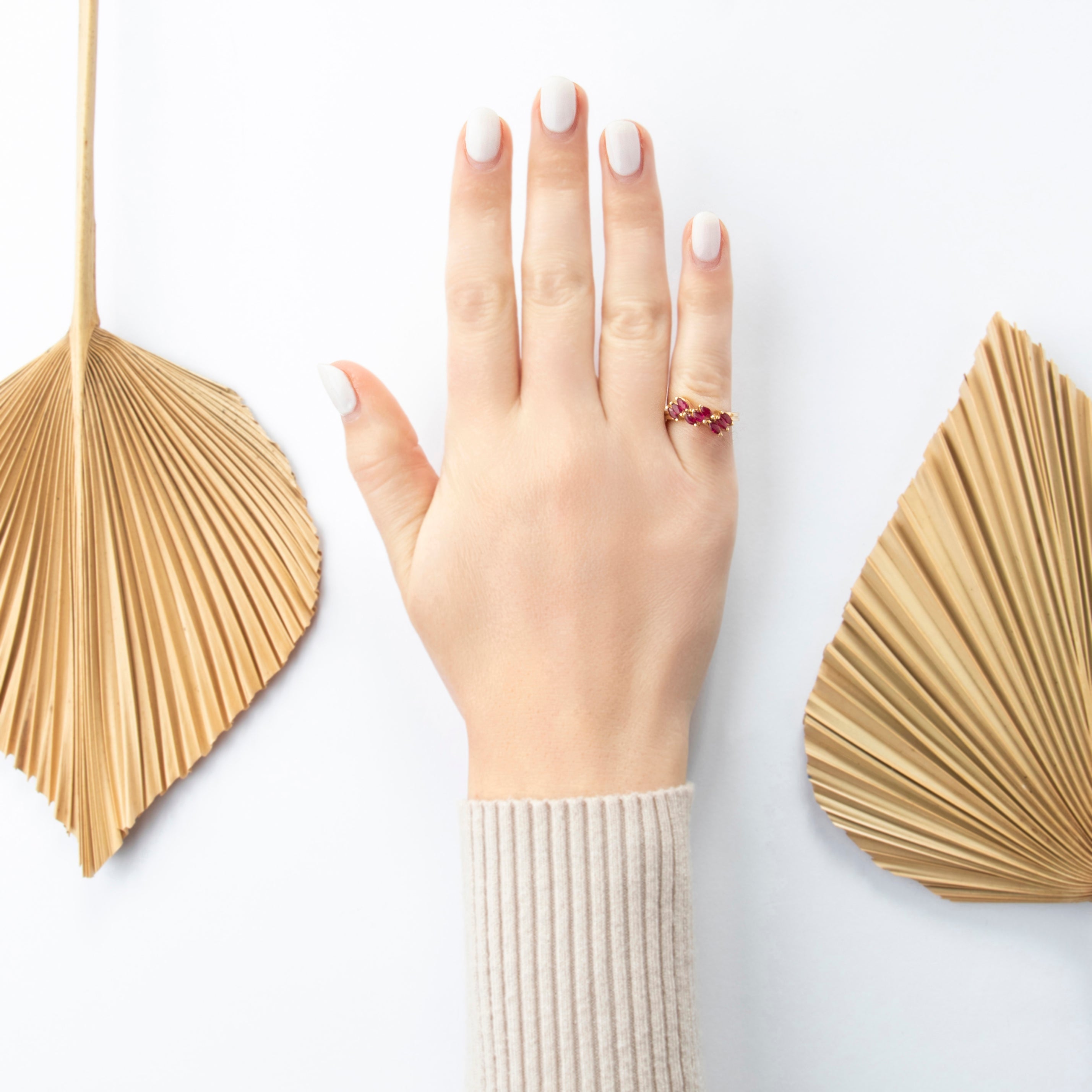 Discover this 10k yellow gold ring crafted by a vintage maker in a fluttering marquise cluster design featuring ruby. All gemstones are natural, earth mined stones, unless stated otherwise.