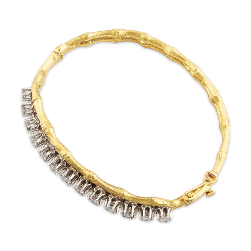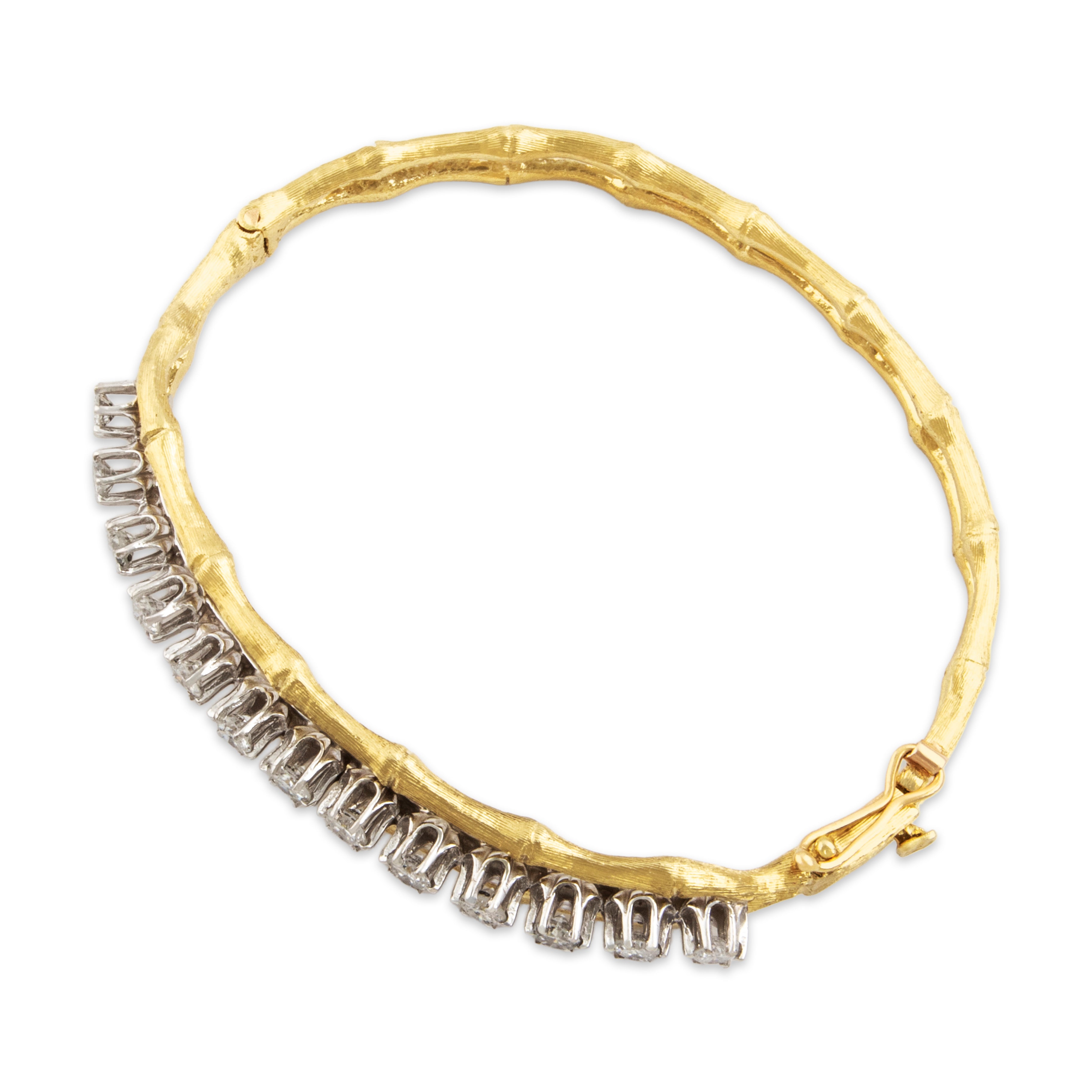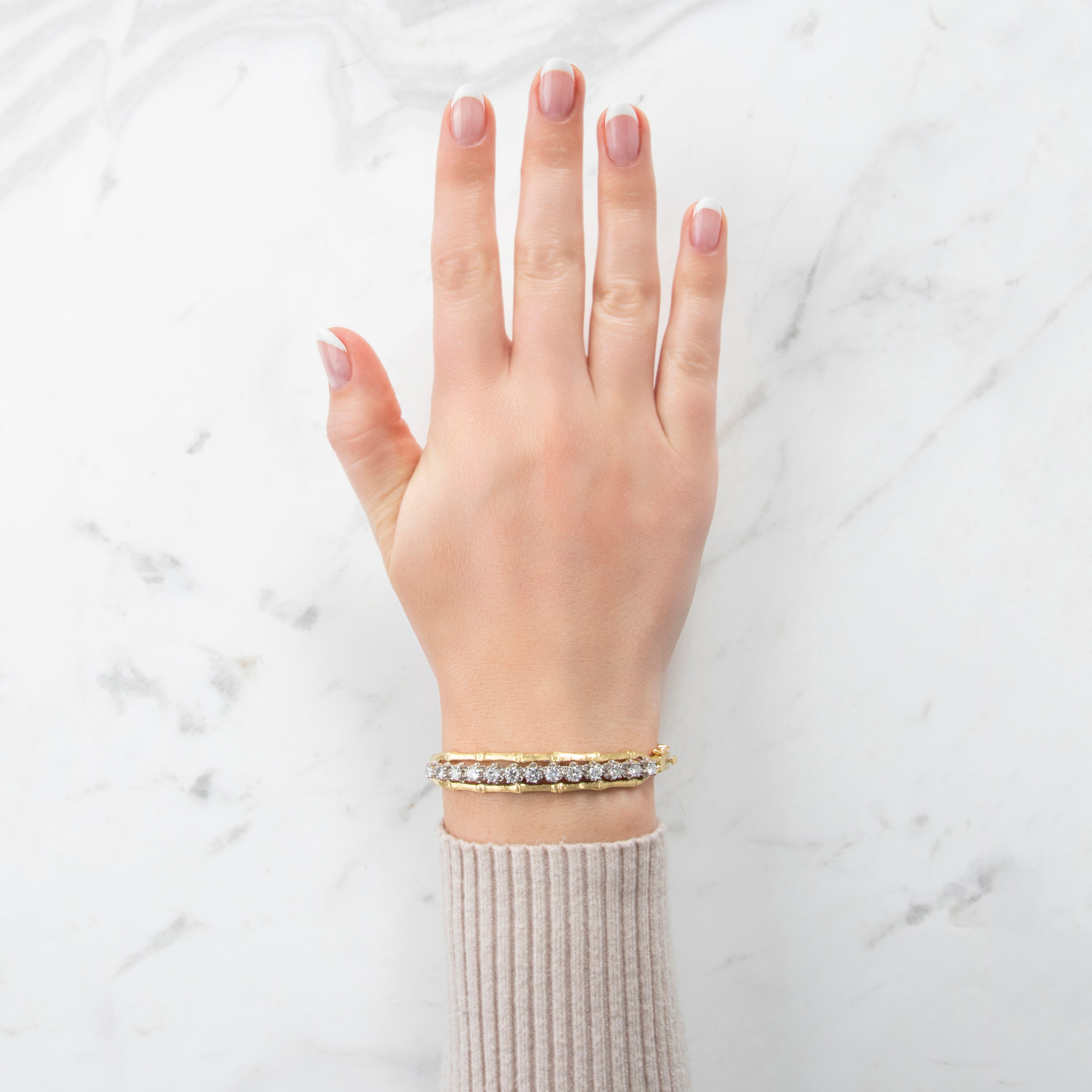 Discover this heavy 18k yellow gold bracelet crafted by a vintage maker in a wonderful textured bamboo bangle design featuring diamonds. All gemstones are natural, earth-mined stones, unless stated otherwise.