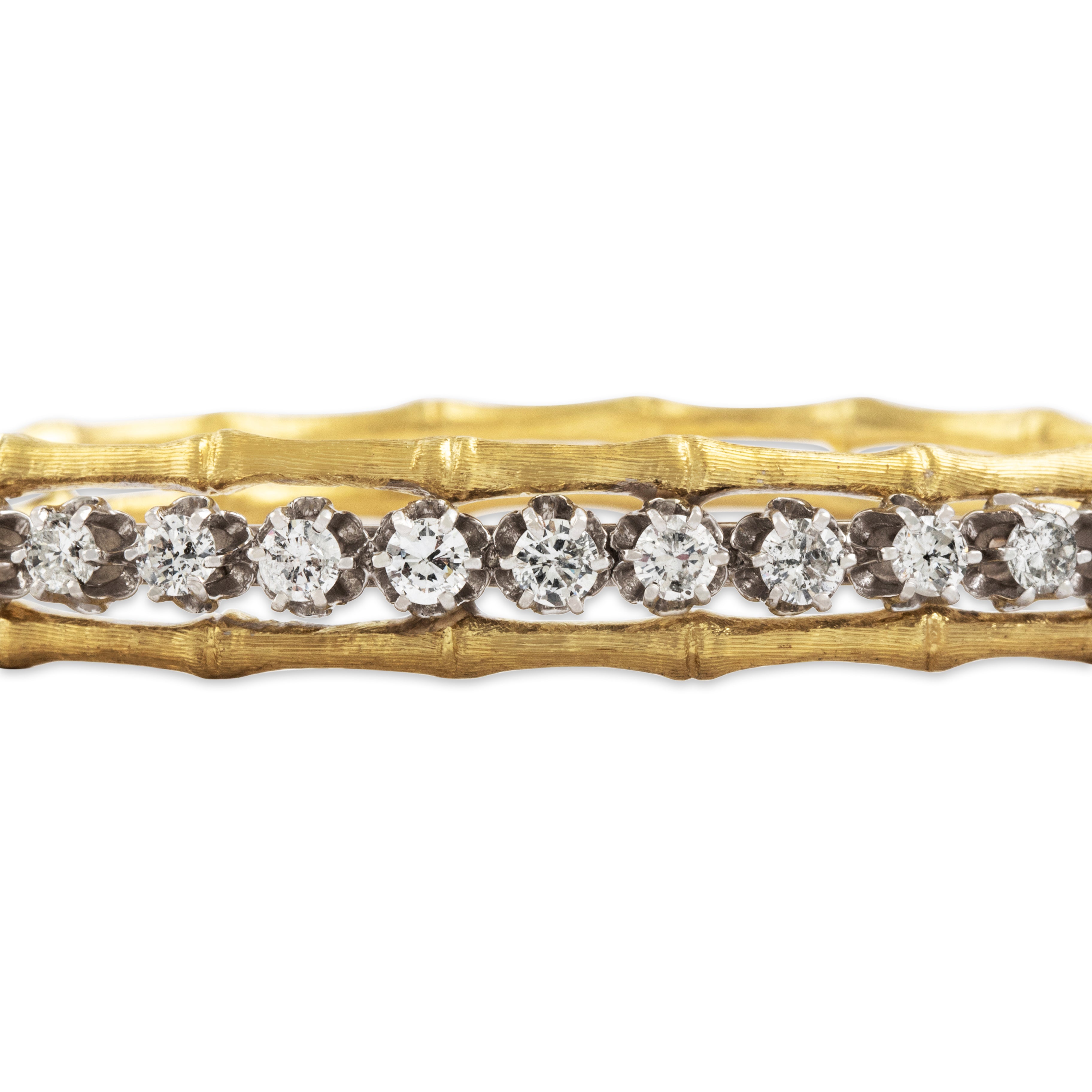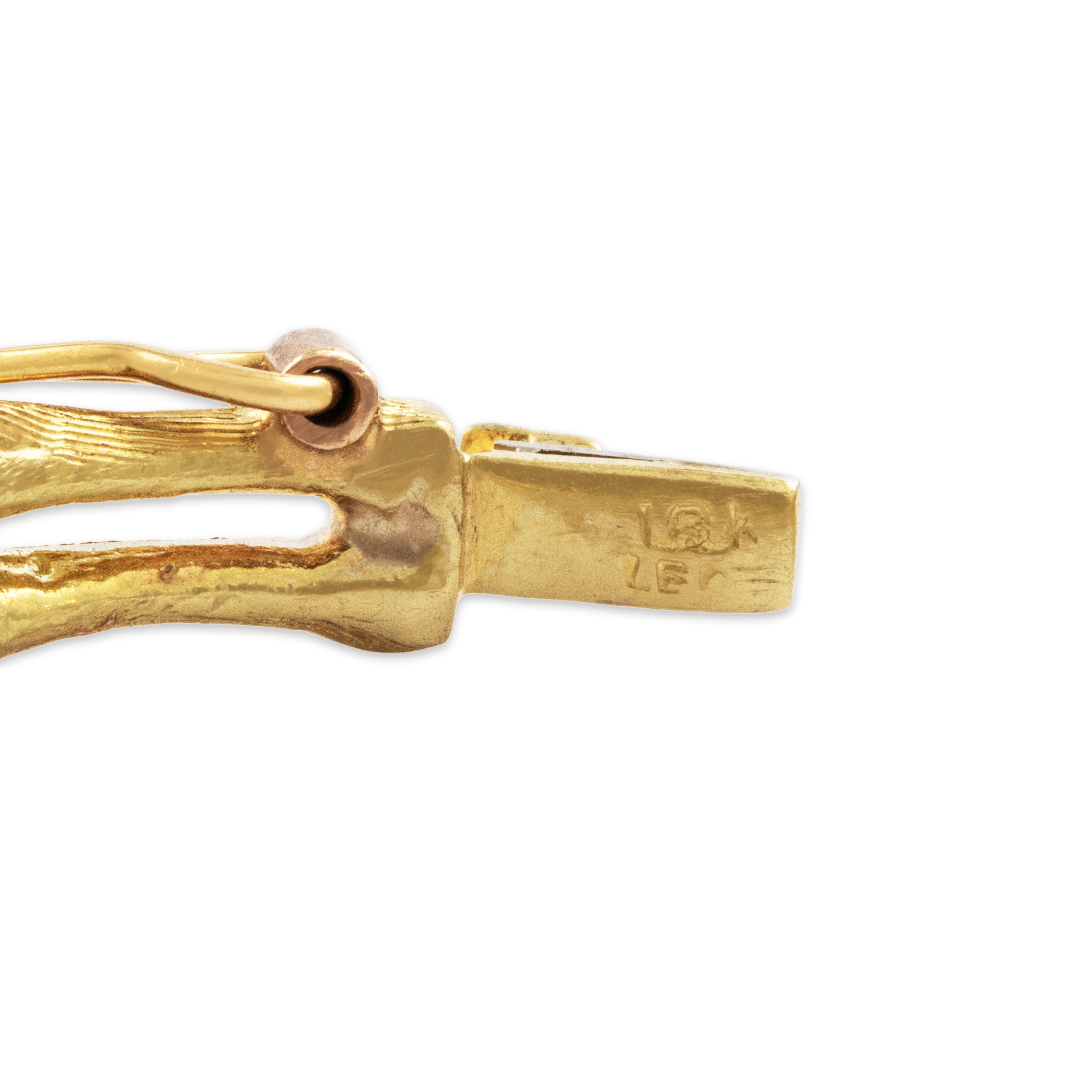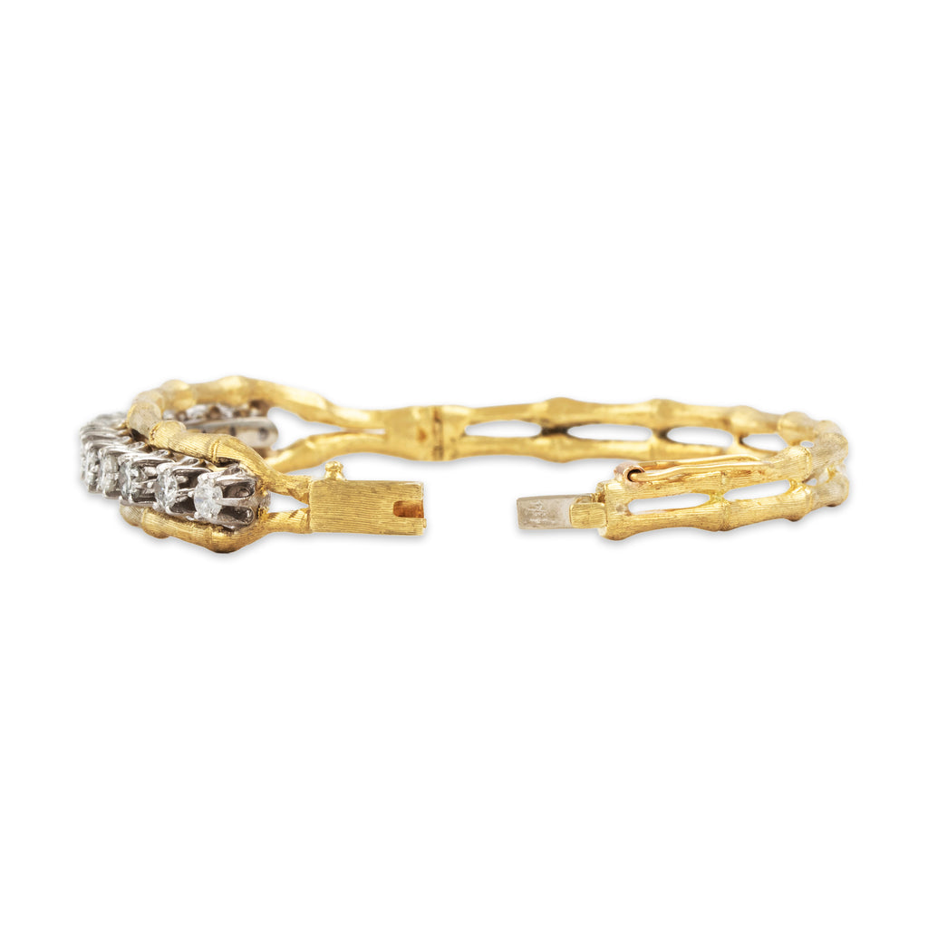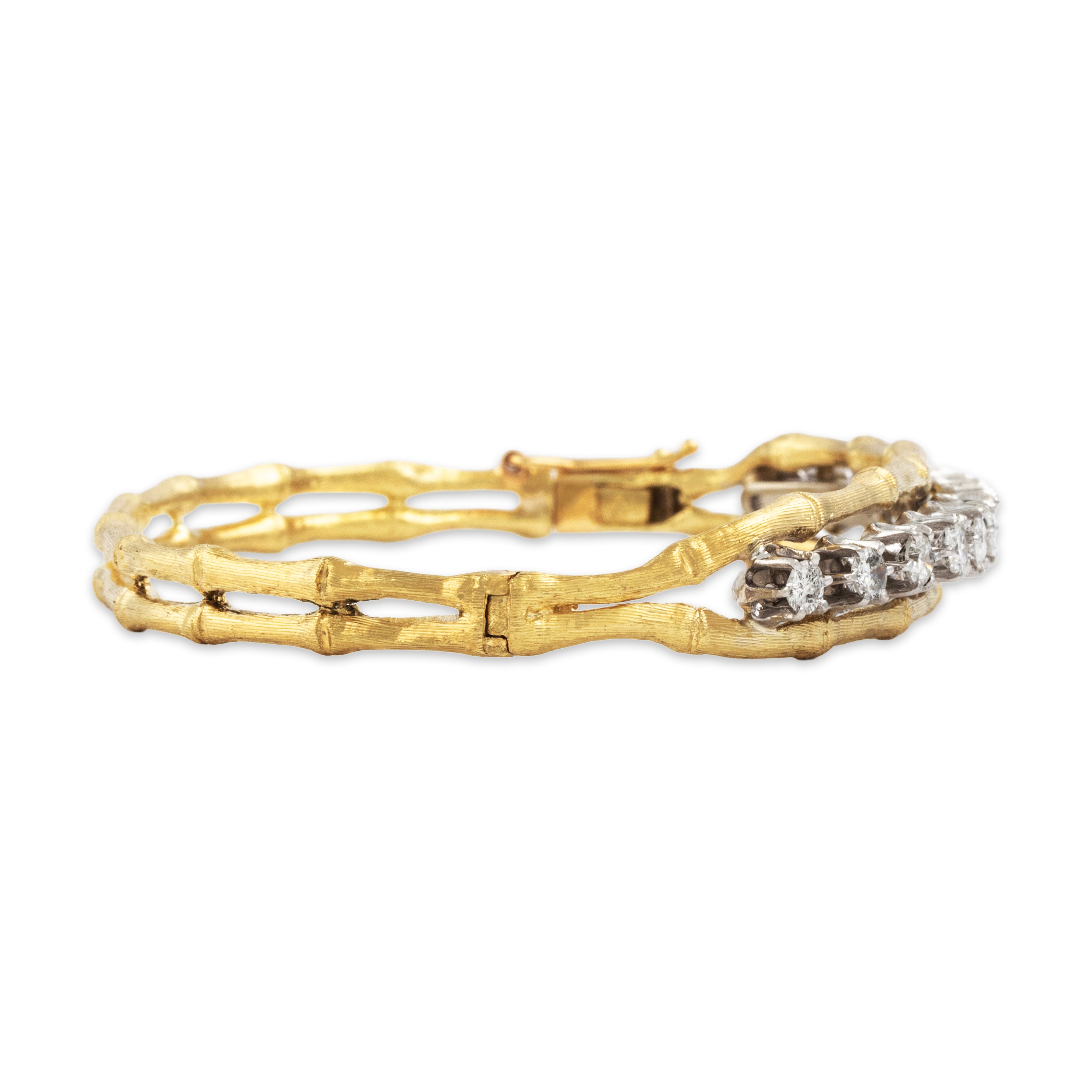Discover this heavy 18k yellow gold bracelet crafted by a vintage maker in a wonderful textured bamboo bangle design featuring diamonds. All gemstones are natural, earth-mined stones, unless stated otherwise.
