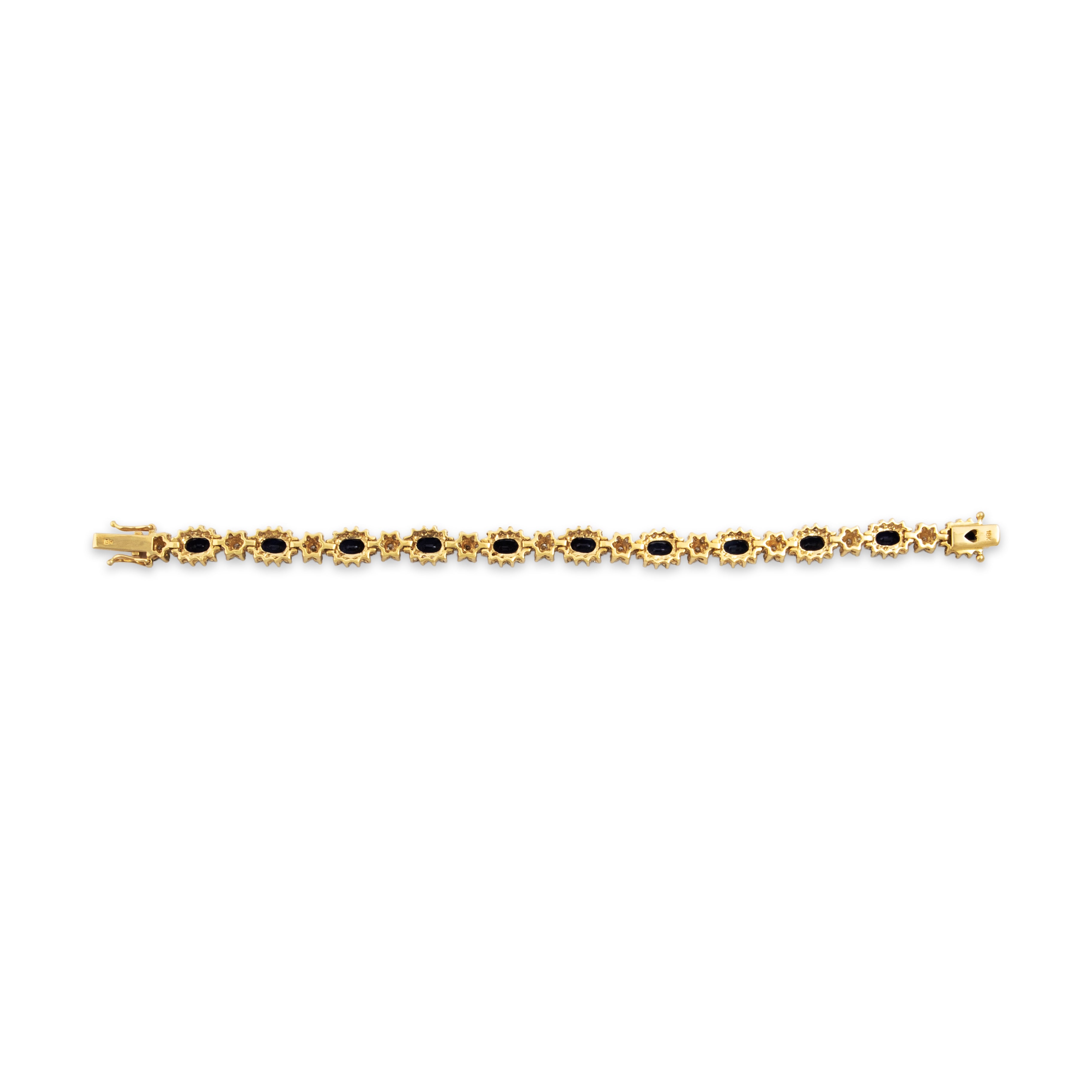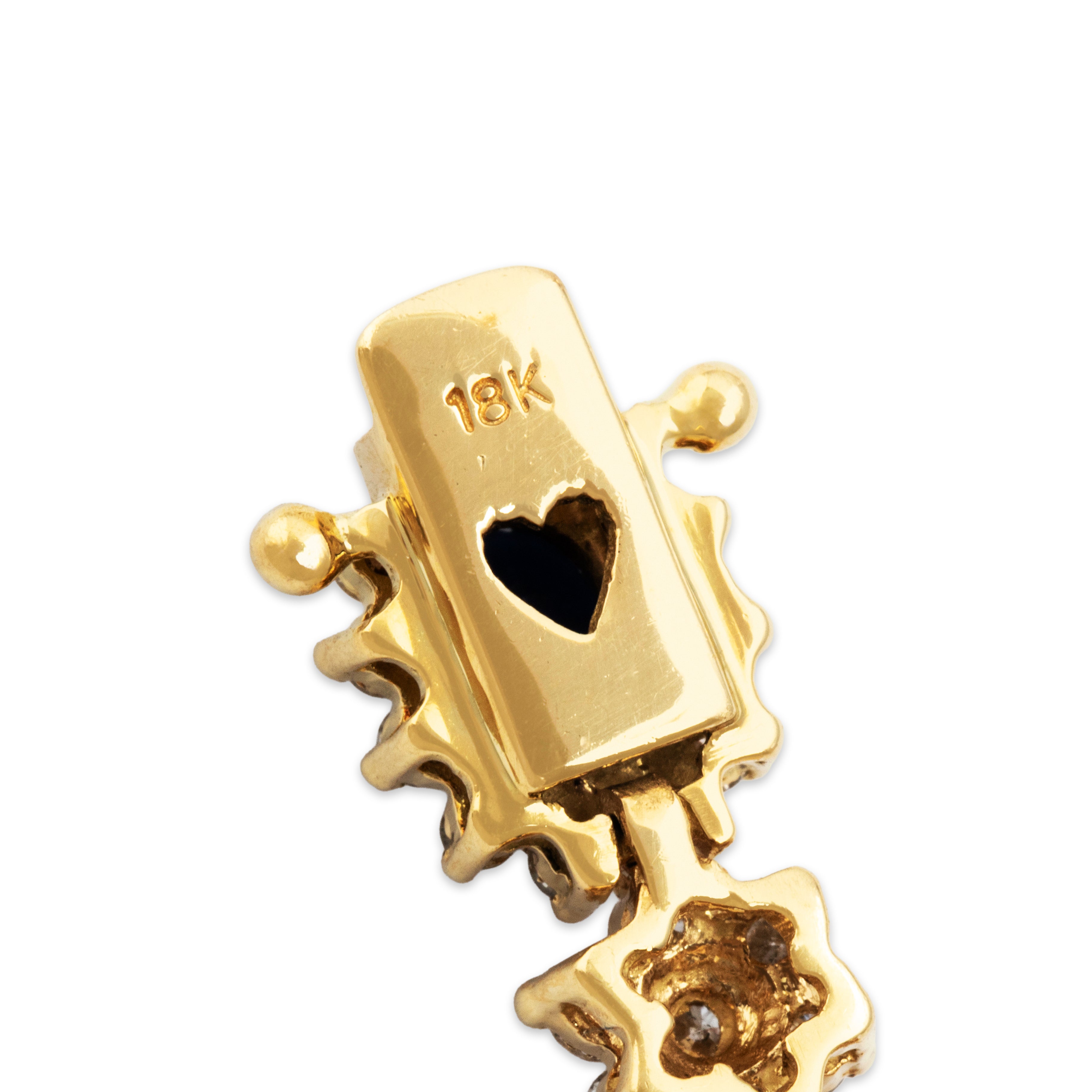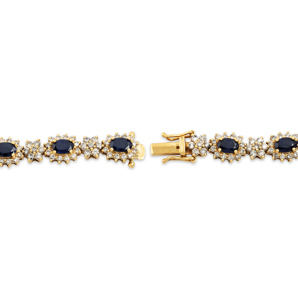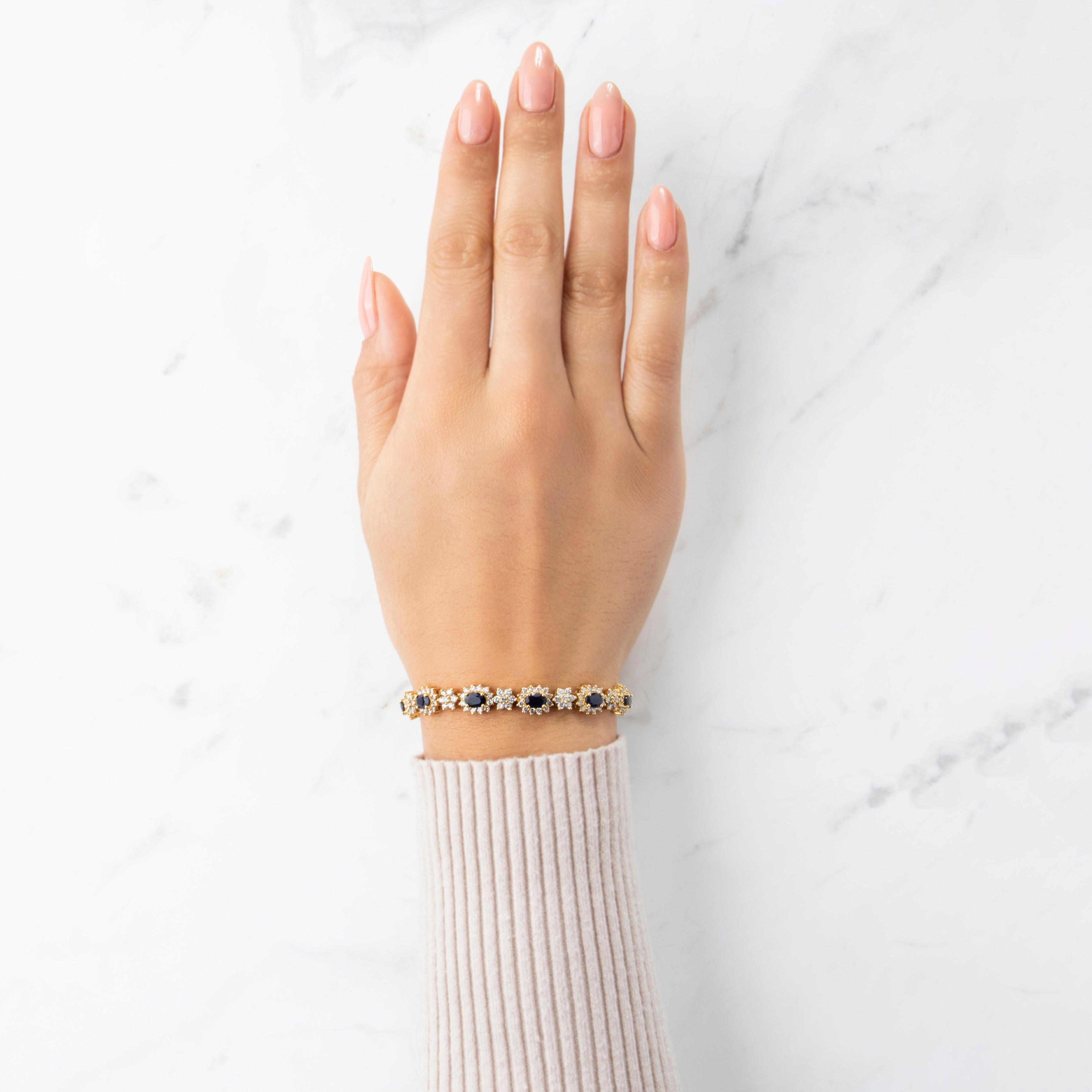 Discover this stunning heavy 18k yellow gold bracelet crafted by a vintage maker in a sparkling halo link design featuring blue sapphire and diamond. All gemstones are natural, earth-mined stones, unless stated otherwise.