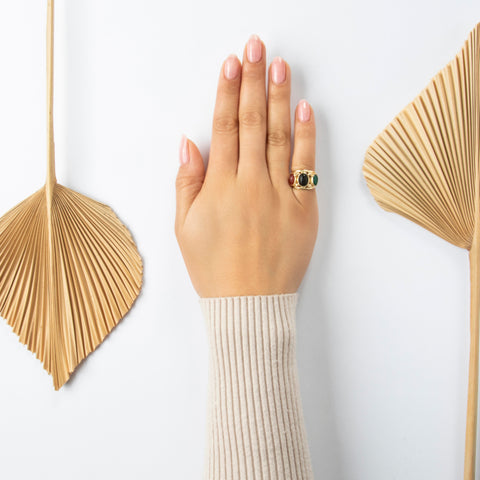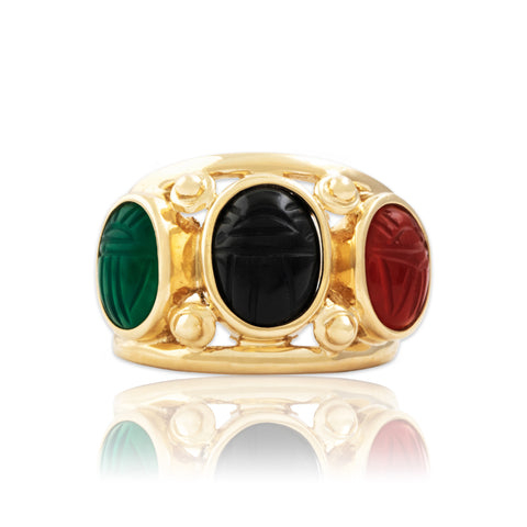 Vintage 14k Yellow Gold Onyx Carnelian Green Chalcedony Carved Scarab Ring 4.75