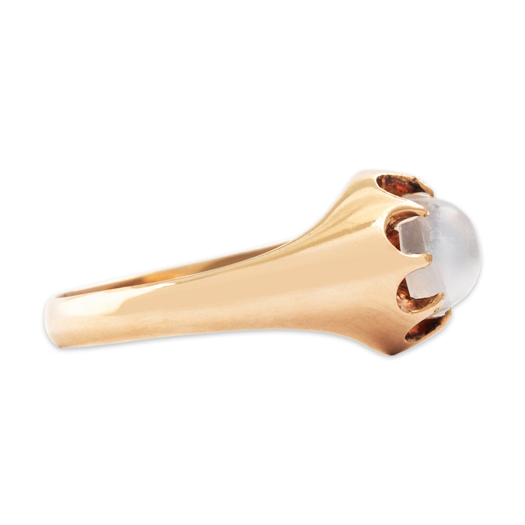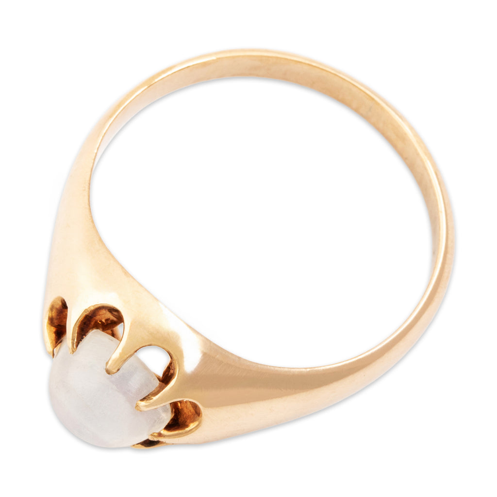 Condition: Very good condition, not eye-visible, seen under 10x magnification: some surface abrasions to moonstone; minor surface wear to gold, minor mark to shank from previous resizing