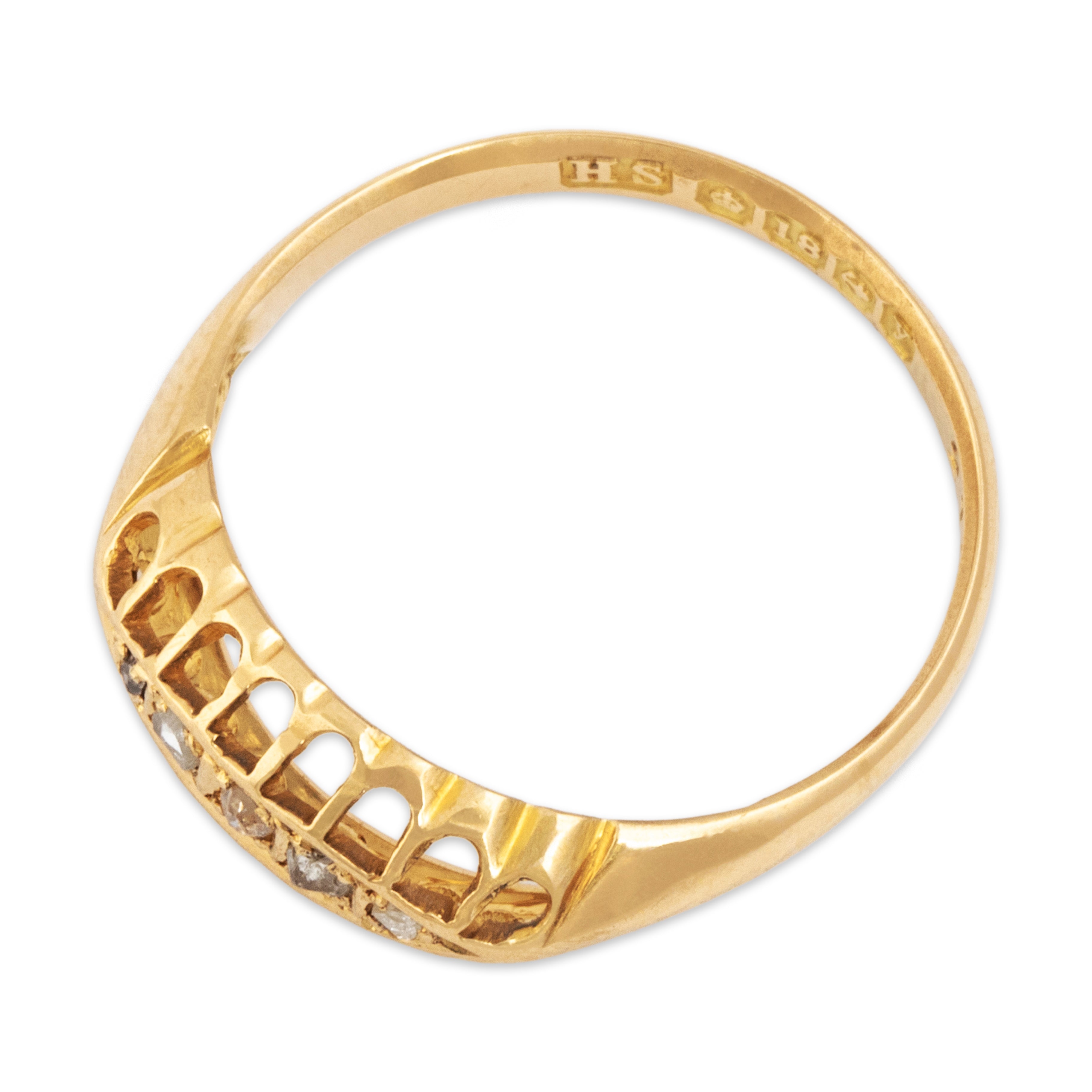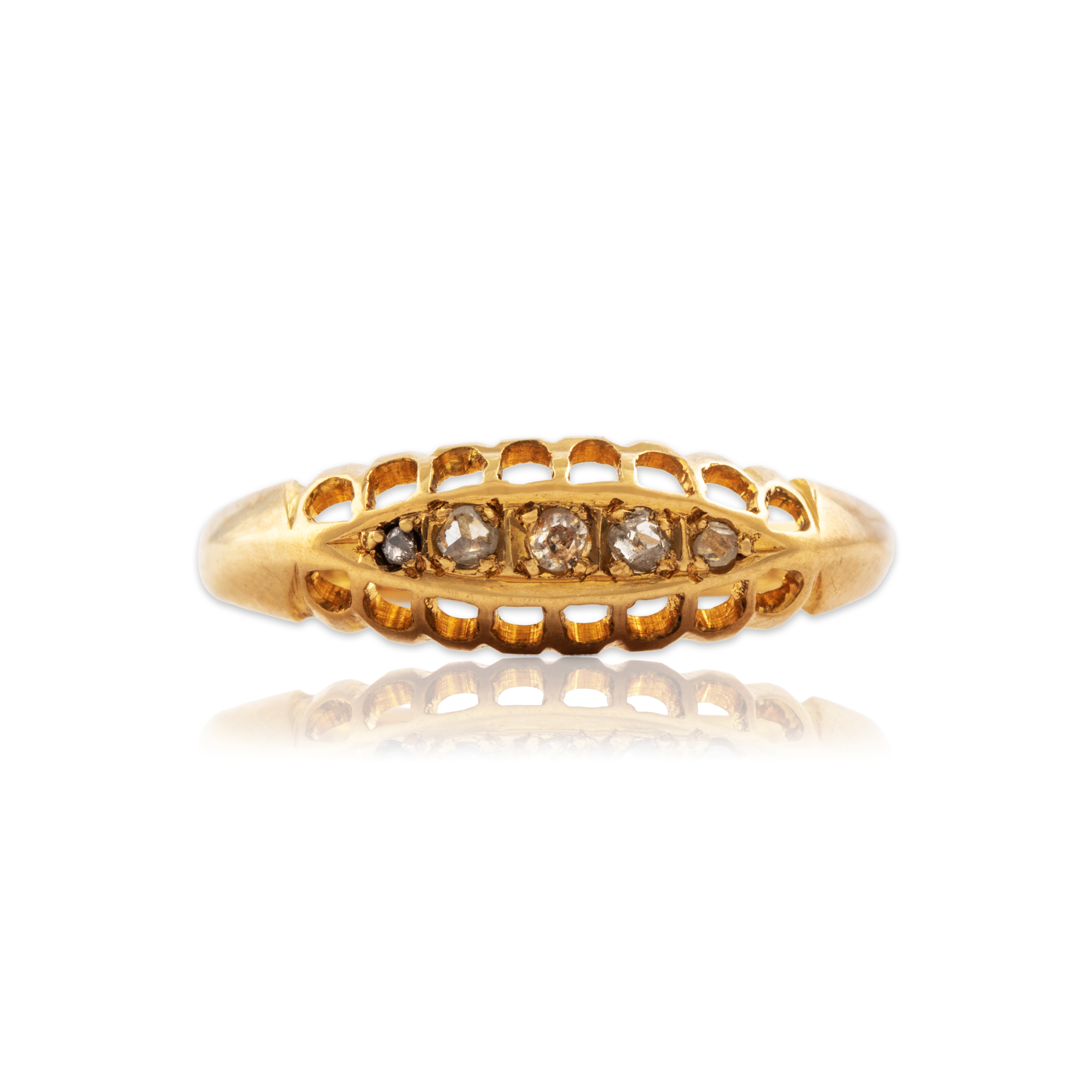Discover this 18k yellow gold ring crafted by an antique maker in a wonderful 5-stone rose-cut design featuring diamond. All gemstones are natural, earth-mined stones, unless stated otherwise.