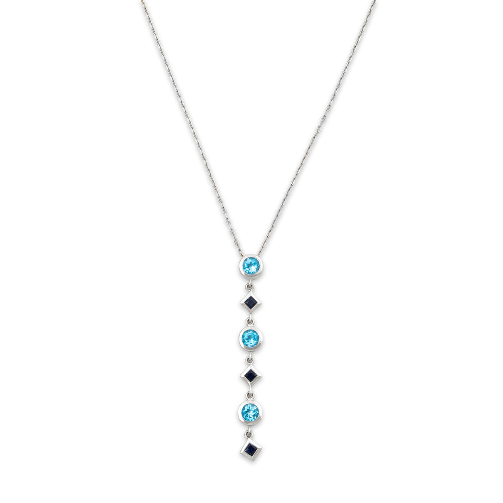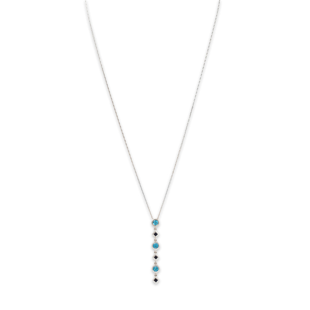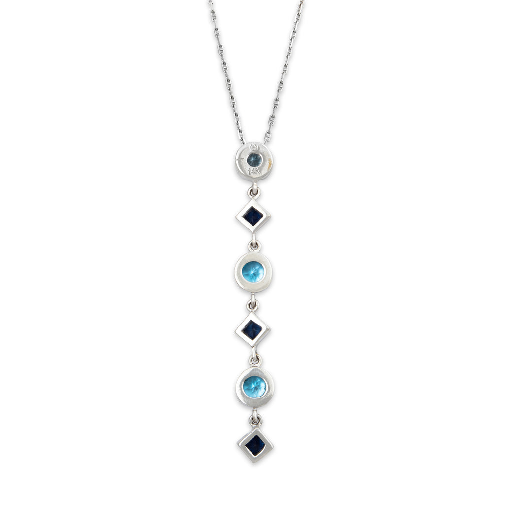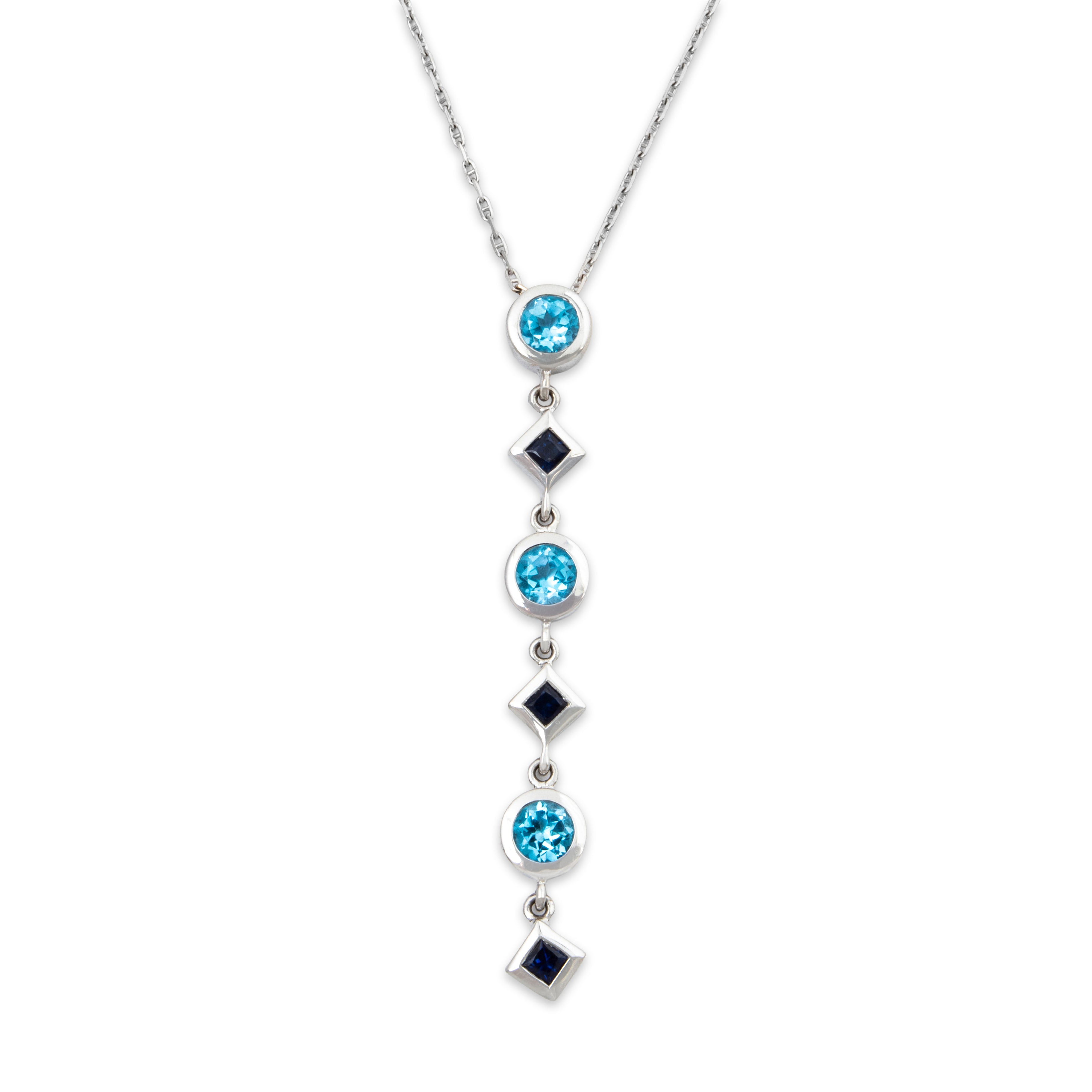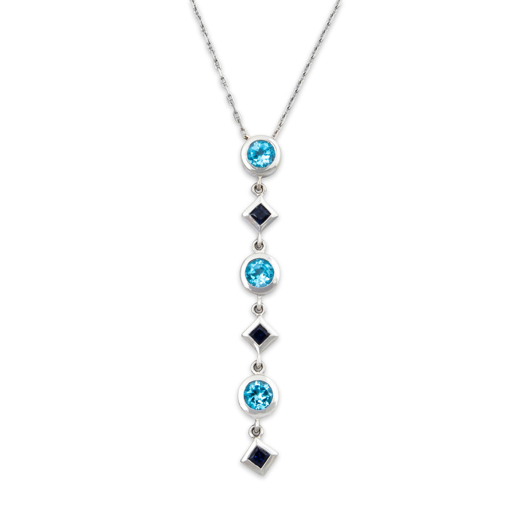 Discover this 14k white gold pendant/necklace crafted by a vintage maker in a wonderful geometric cascade design featuring natural blue topaz and synthetic sapphire. All gemstones are natural, earth-mined stones, unless stated otherwise.