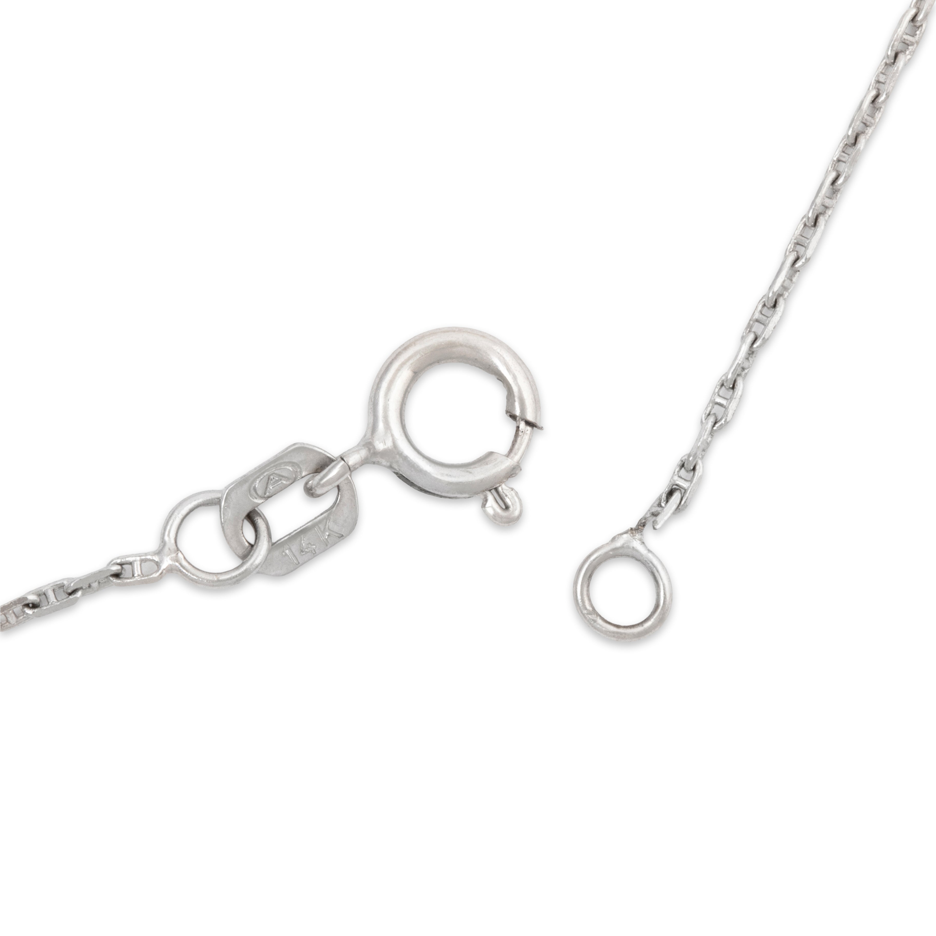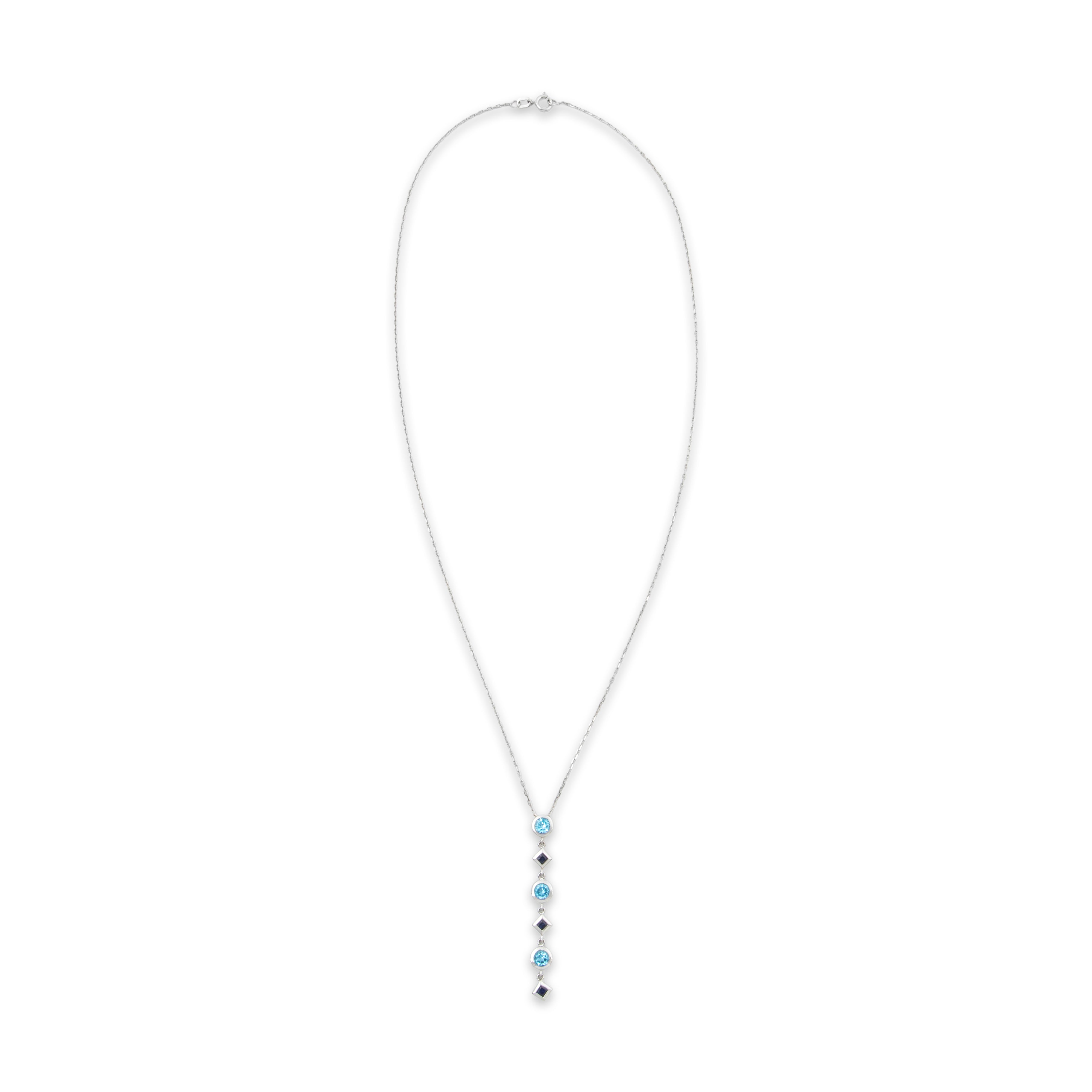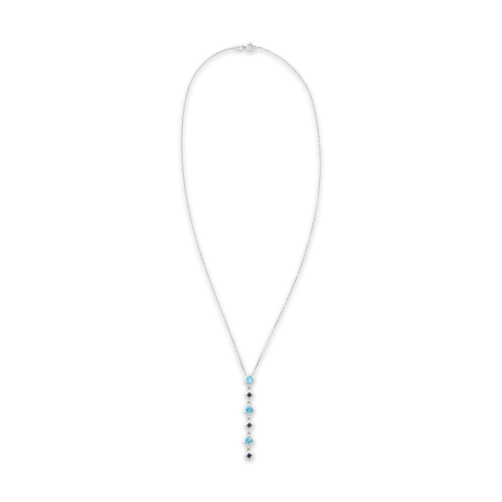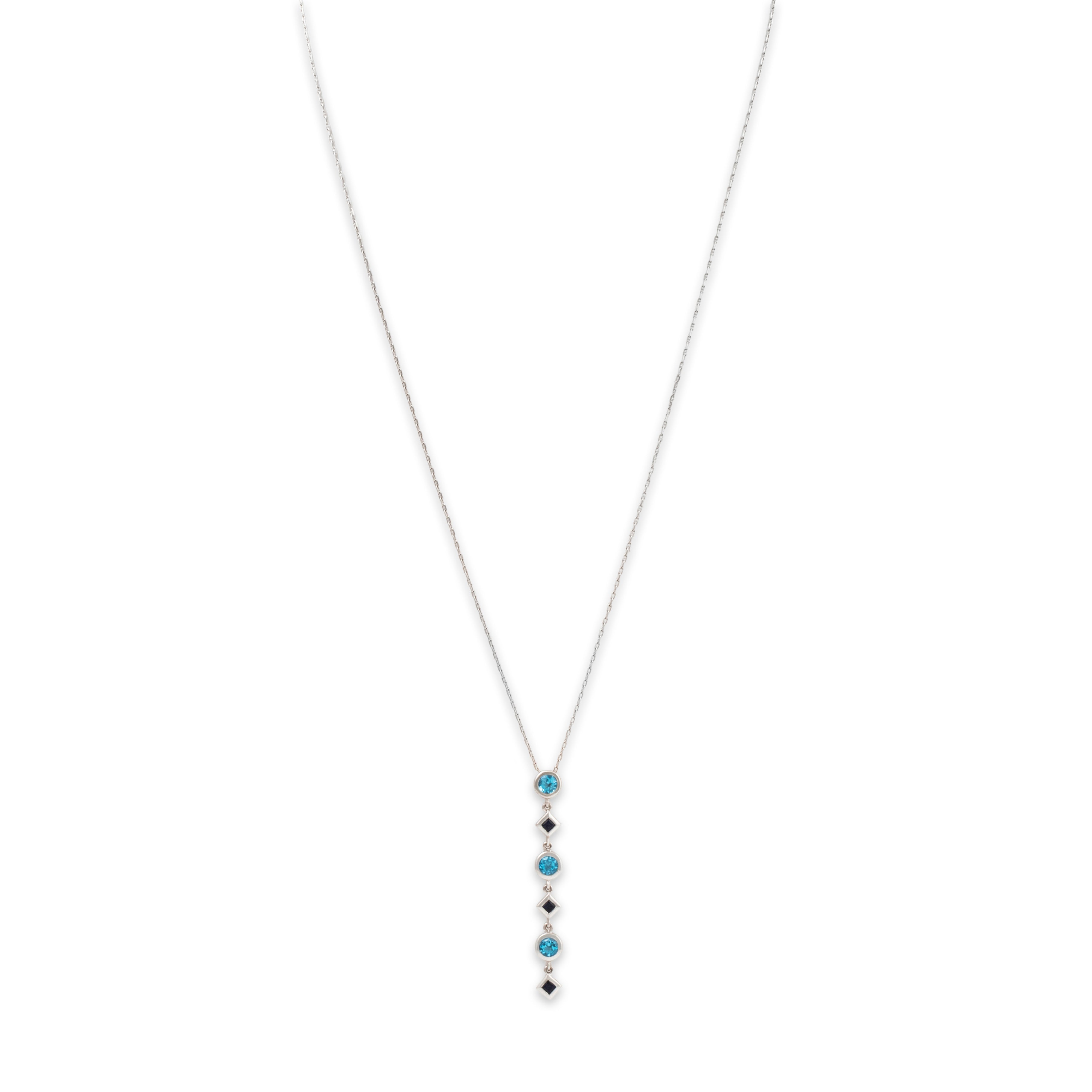 Discover this 14k white gold pendant/necklace crafted by a vintage maker in a wonderful geometric cascade design featuring natural blue topaz and synthetic sapphire. All gemstones are natural, earth-mined stones, unless stated otherwise.