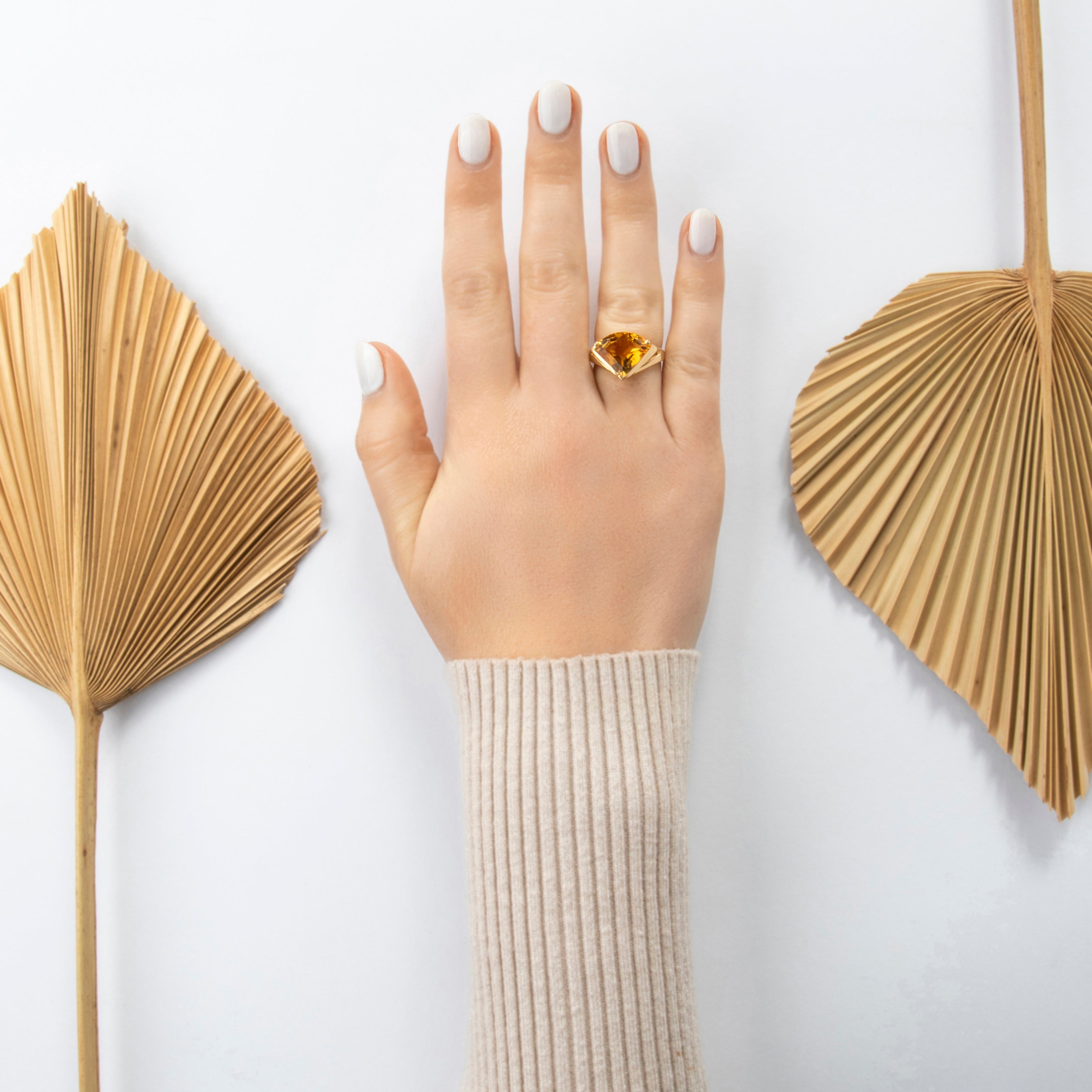 Discover this 14k yellow gold ring crafted by a vintage maker in a wonderful rounded triangle design featuring citrine. All gemstones are natural, earth mined stones, unless stated otherwise.