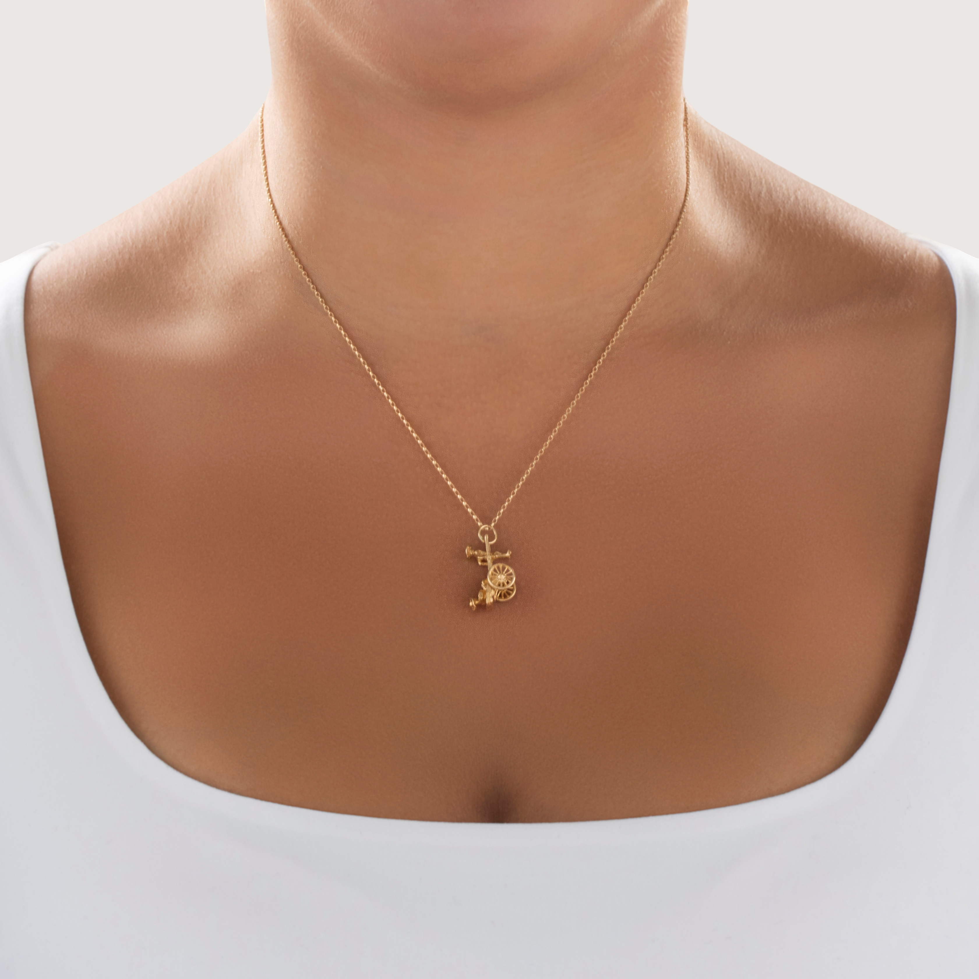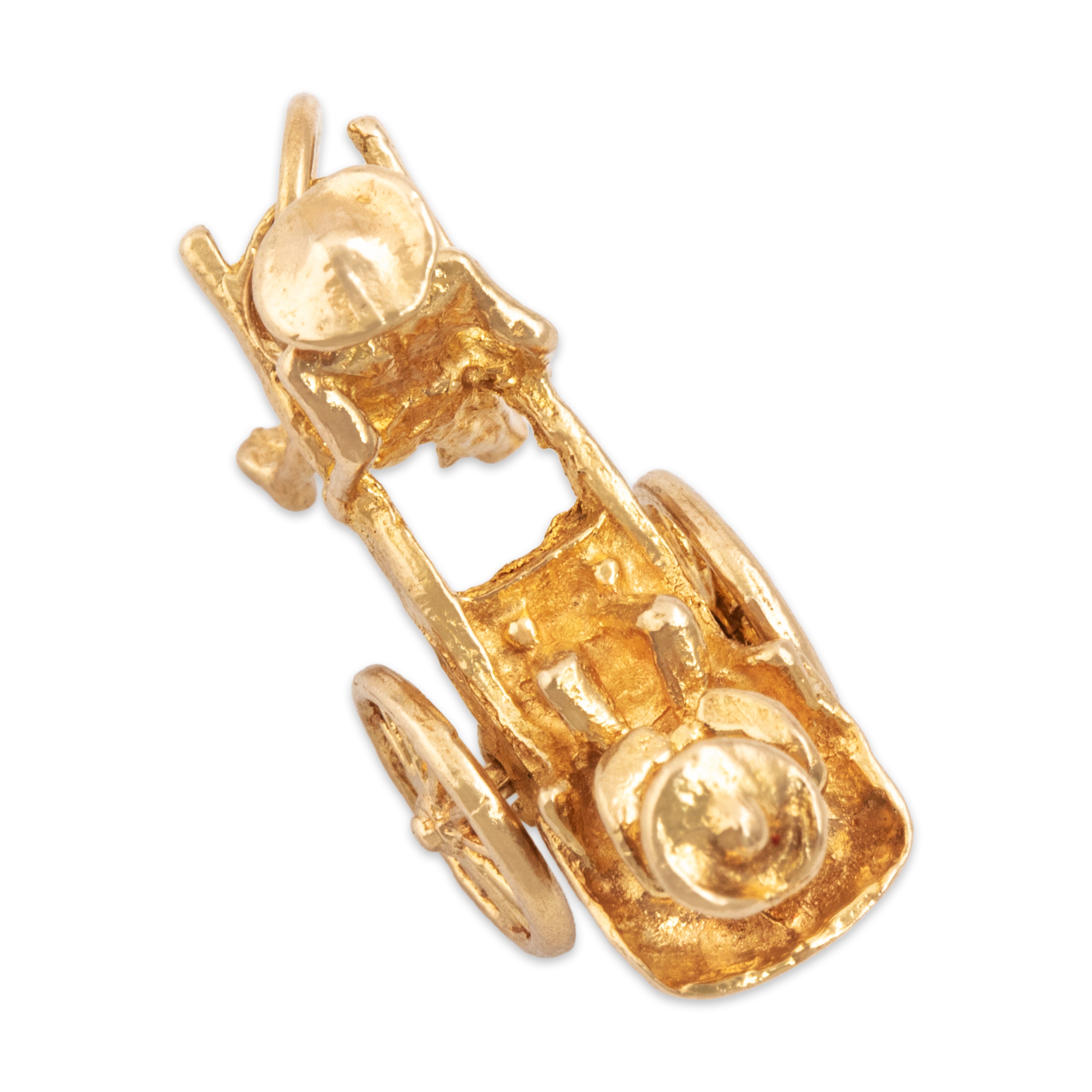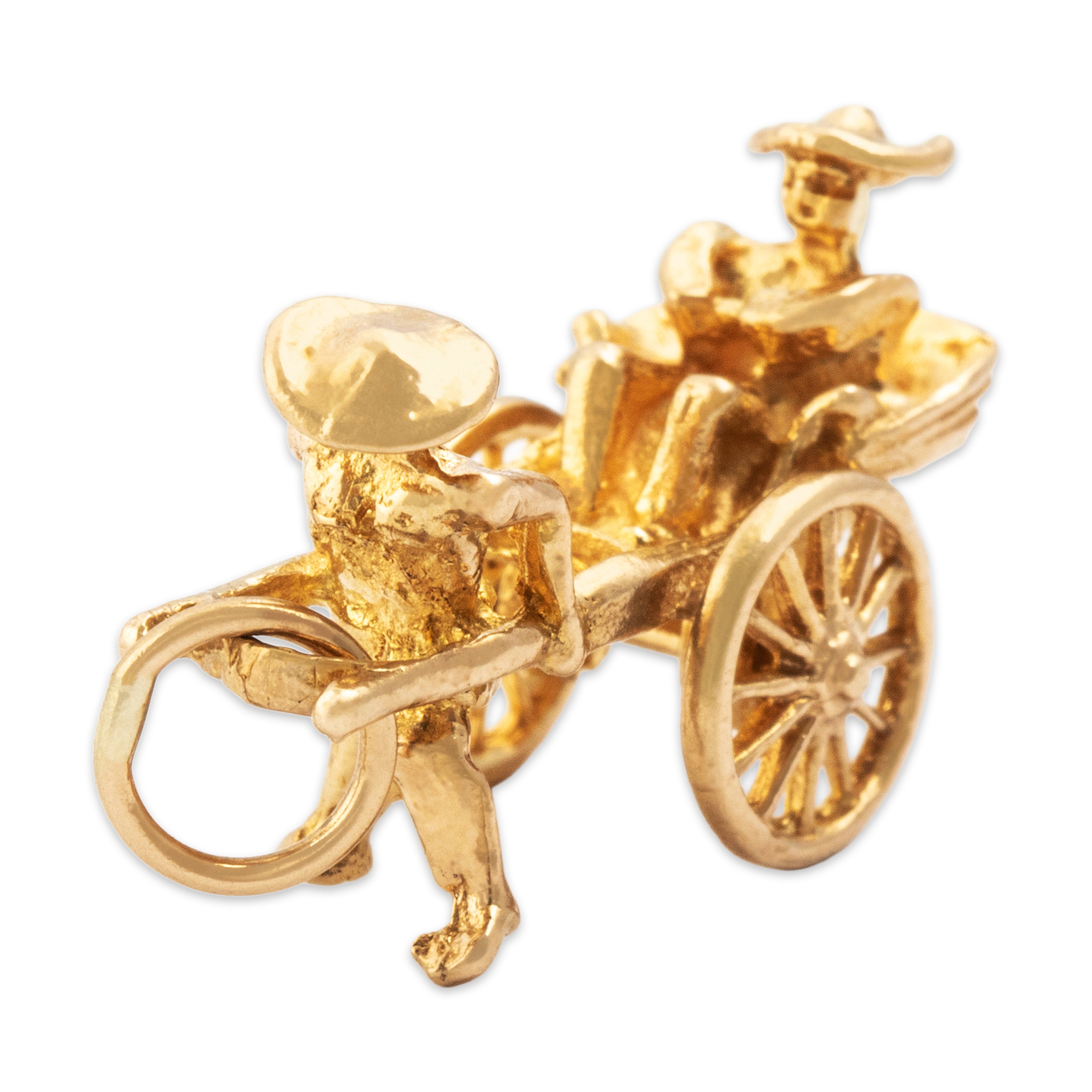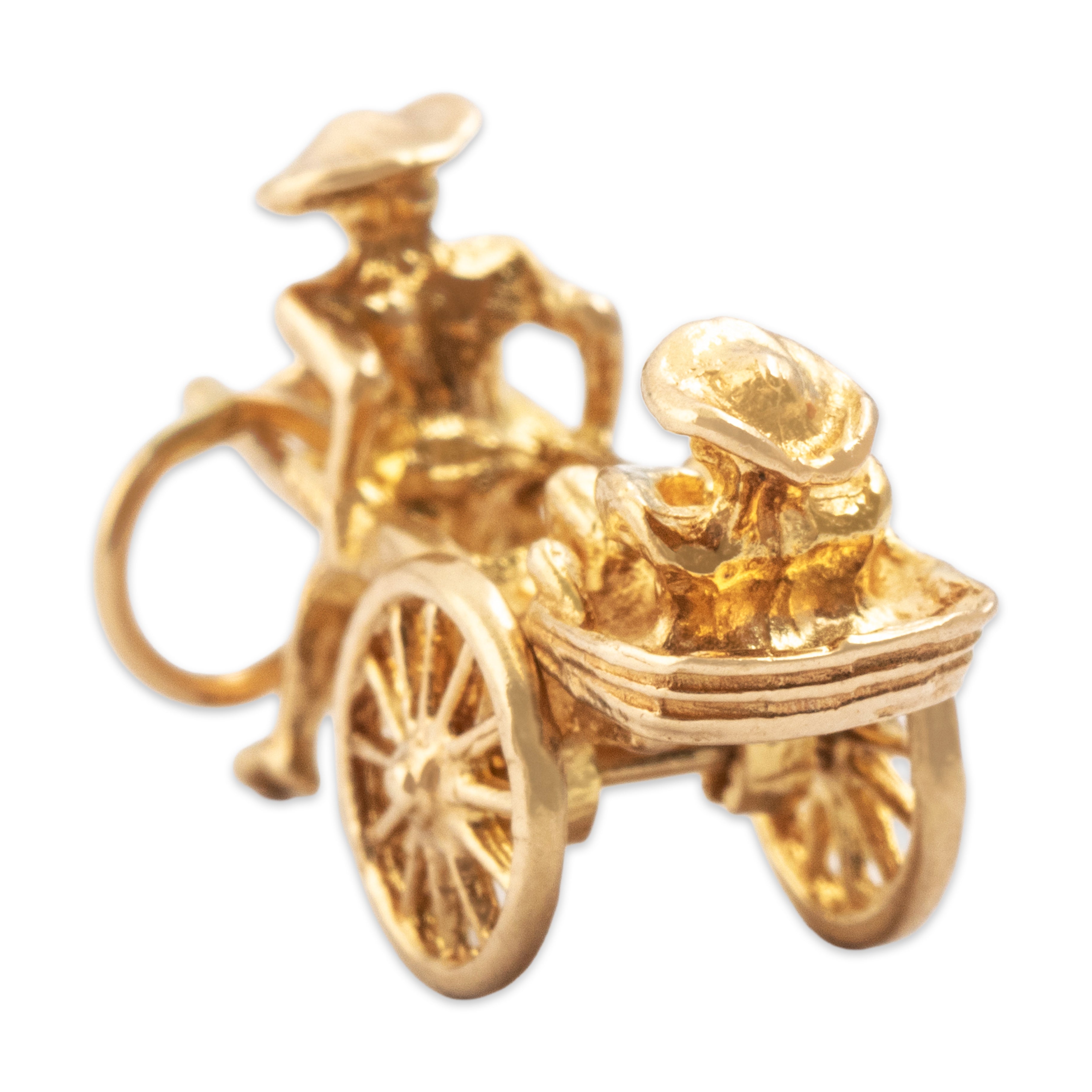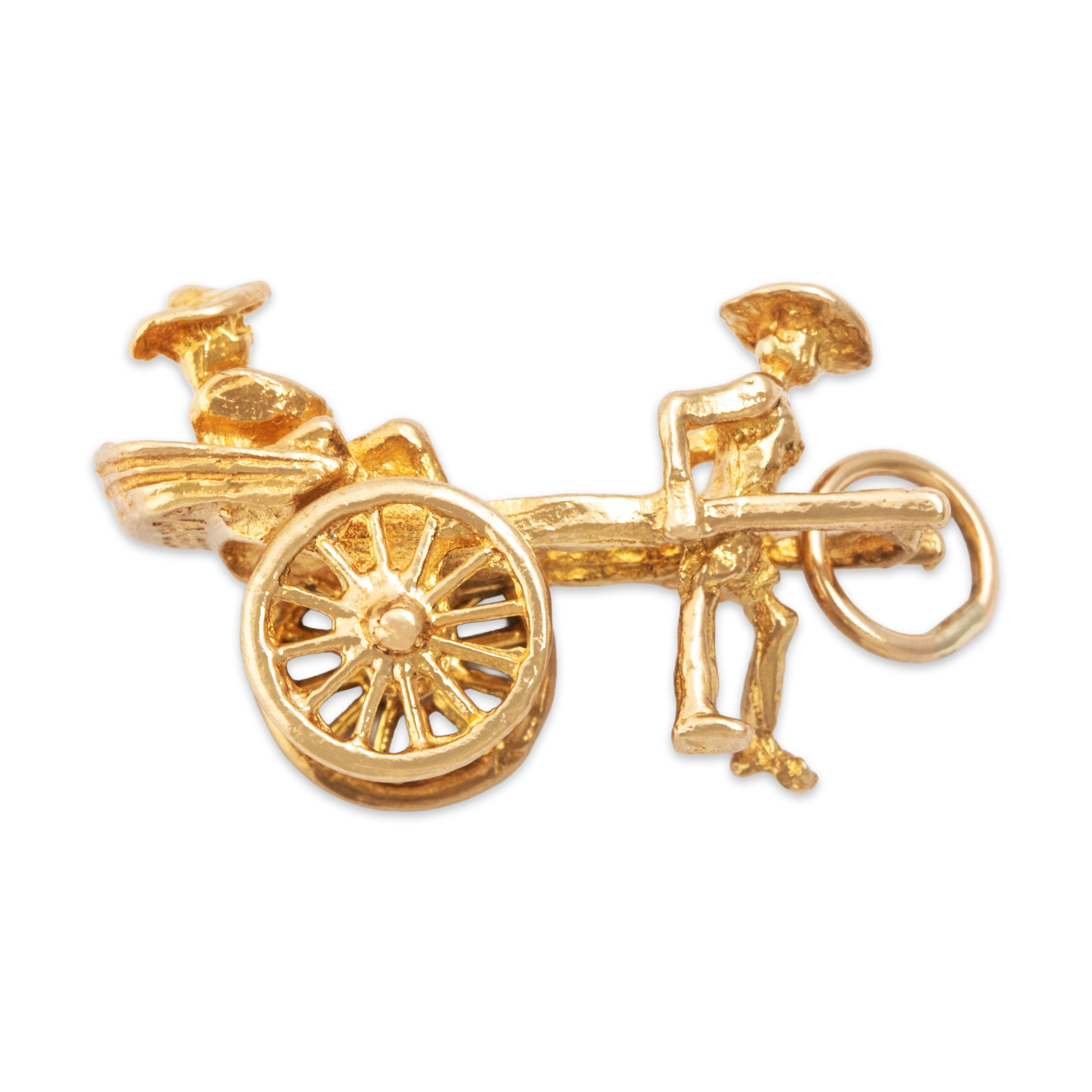 Discover this 14k yellow gold charm / pendant crafted by a vintage maker in a wonderful articulated rickshaw design.