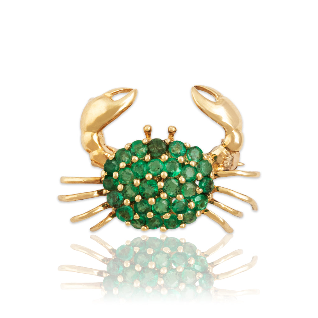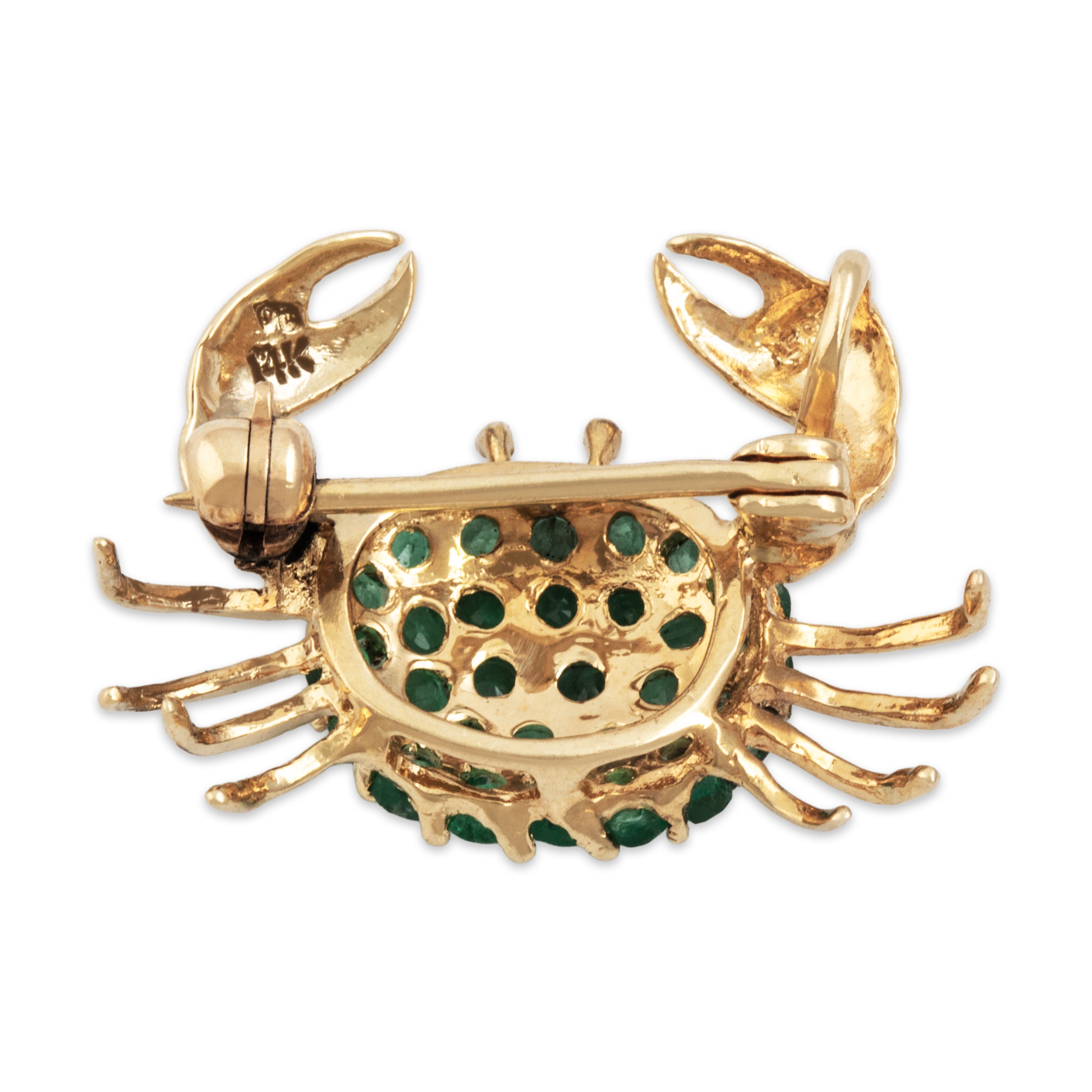 Discover this 14k yellow gold pin / pendant crafted by a vintage maker in a wonderful jaunty figural crab design featuring emerald. All gemstones are natural, earth-mined stones, unless stated otherwise.