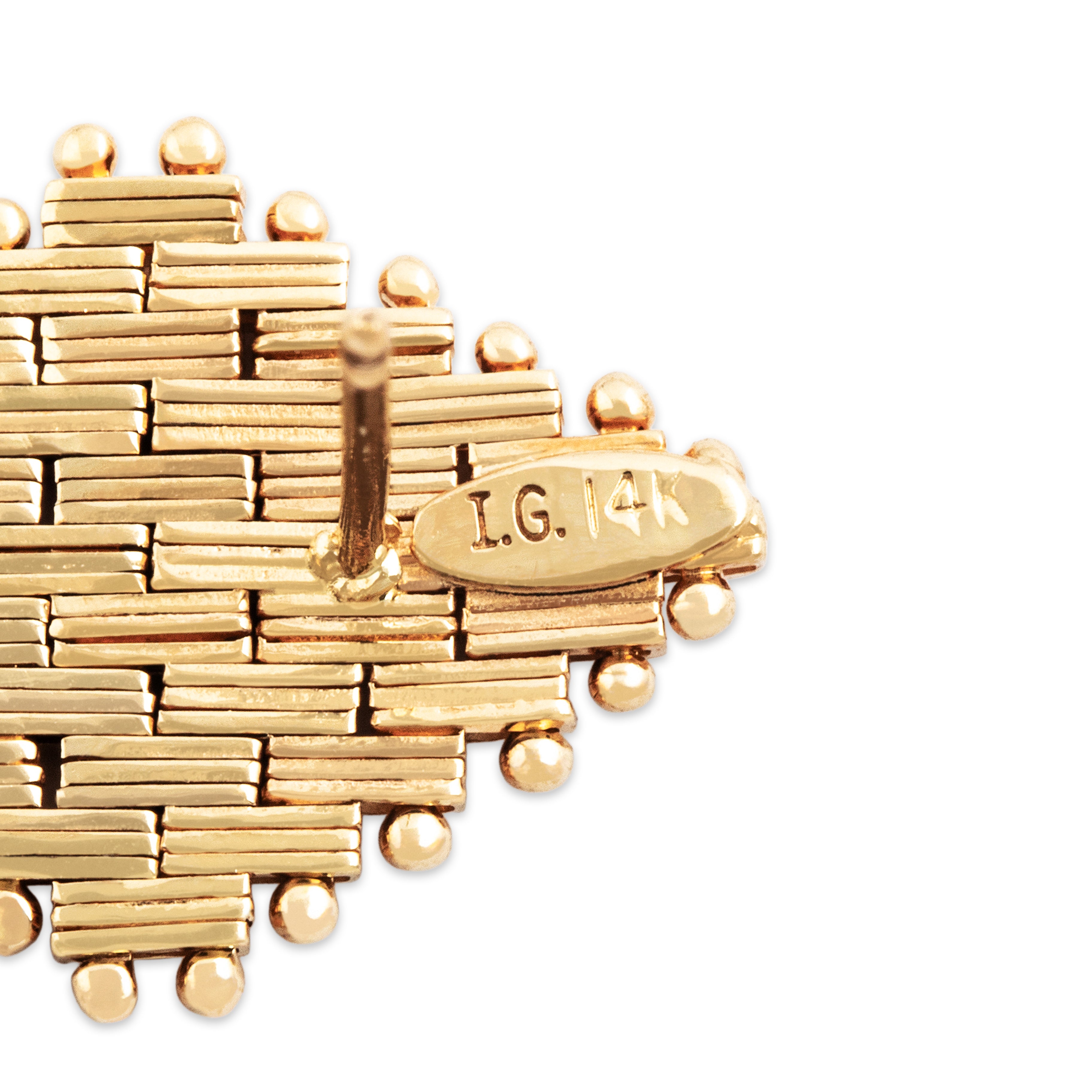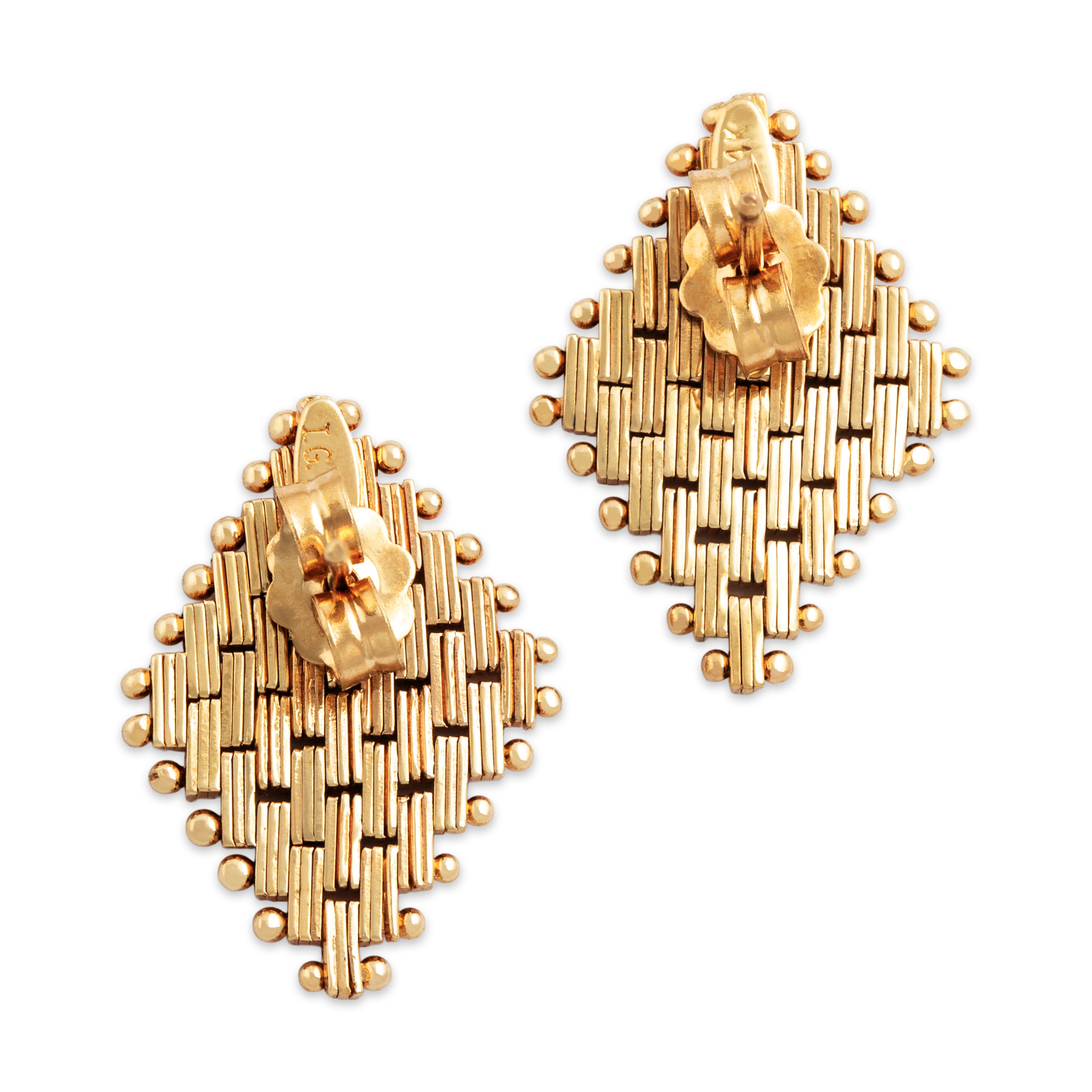 Discover a pair of 14k yellow gold stud earrings crafted by a vintage maker in a lovely woven link rhombus design.