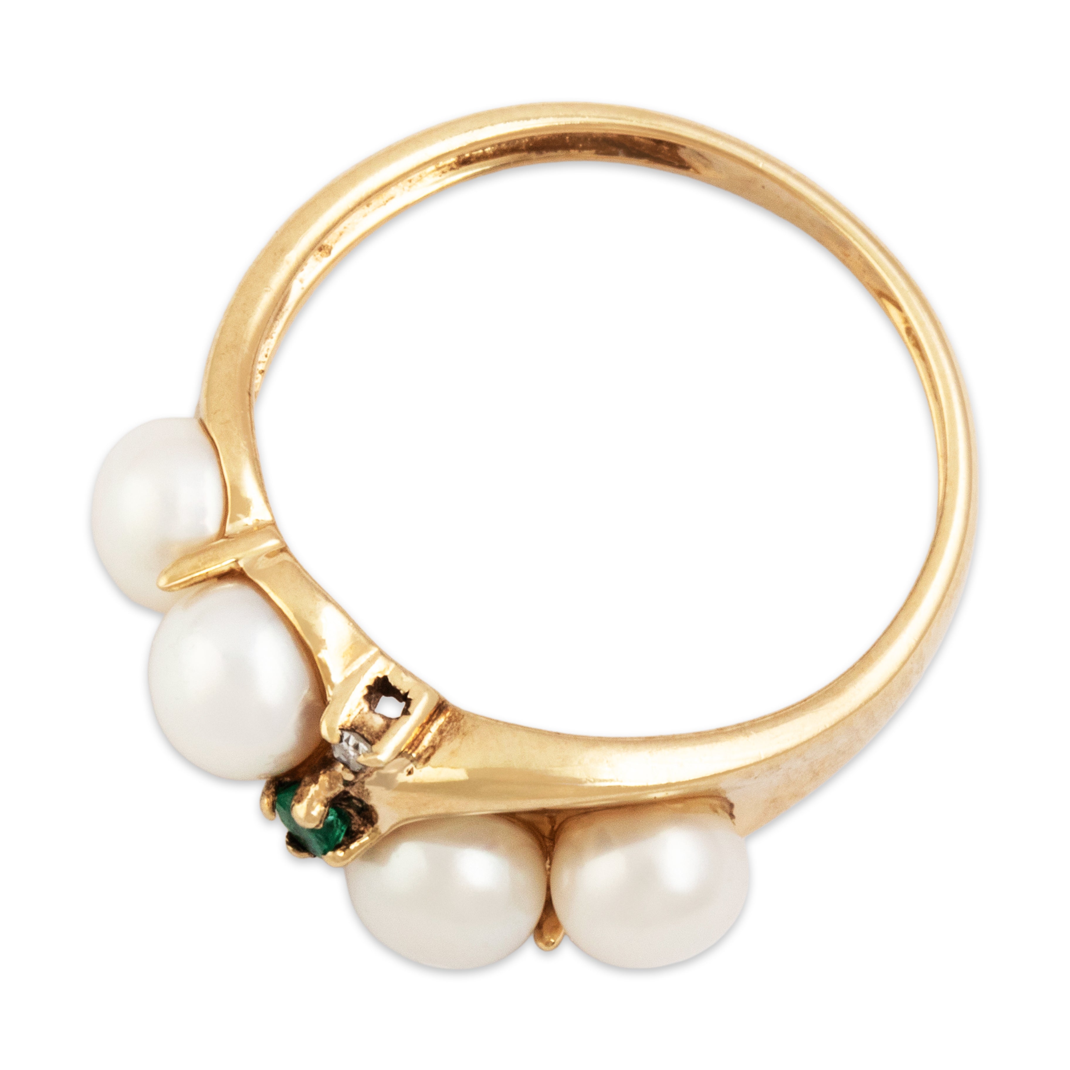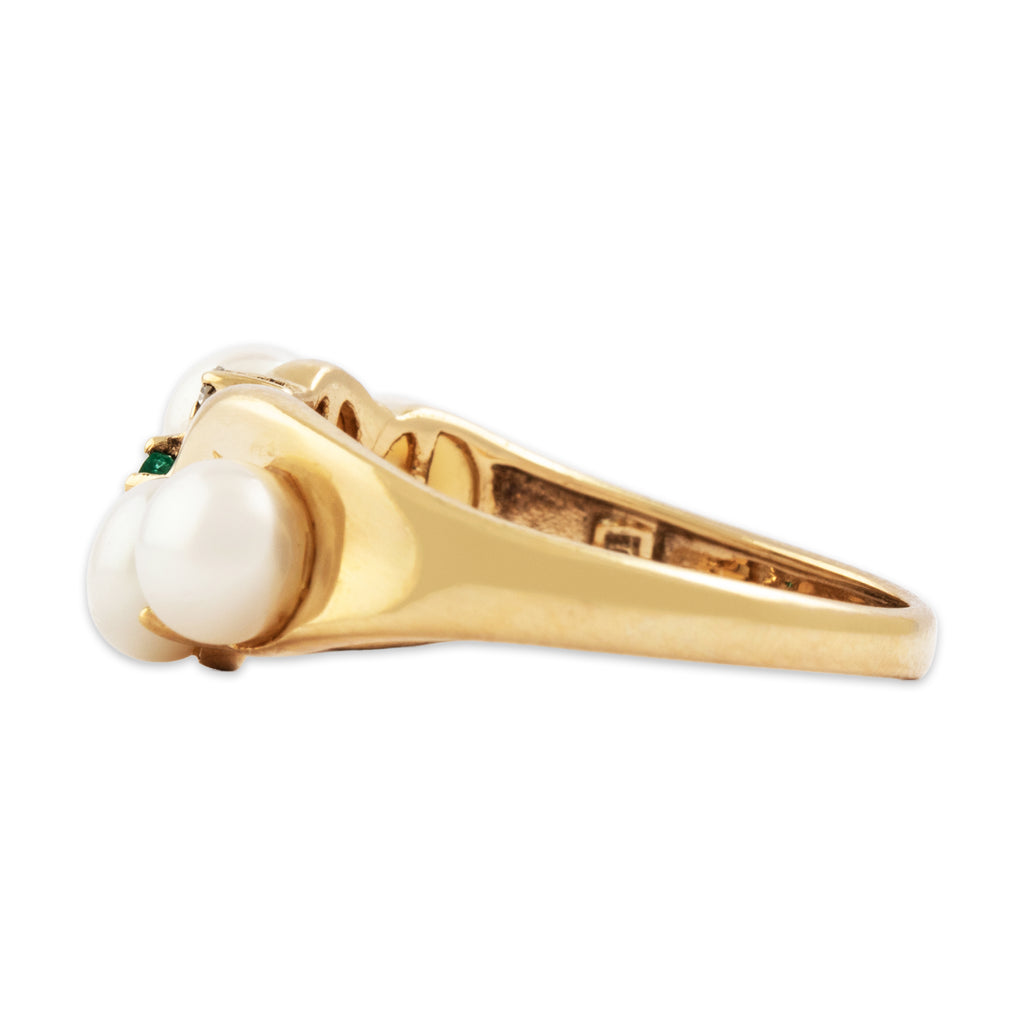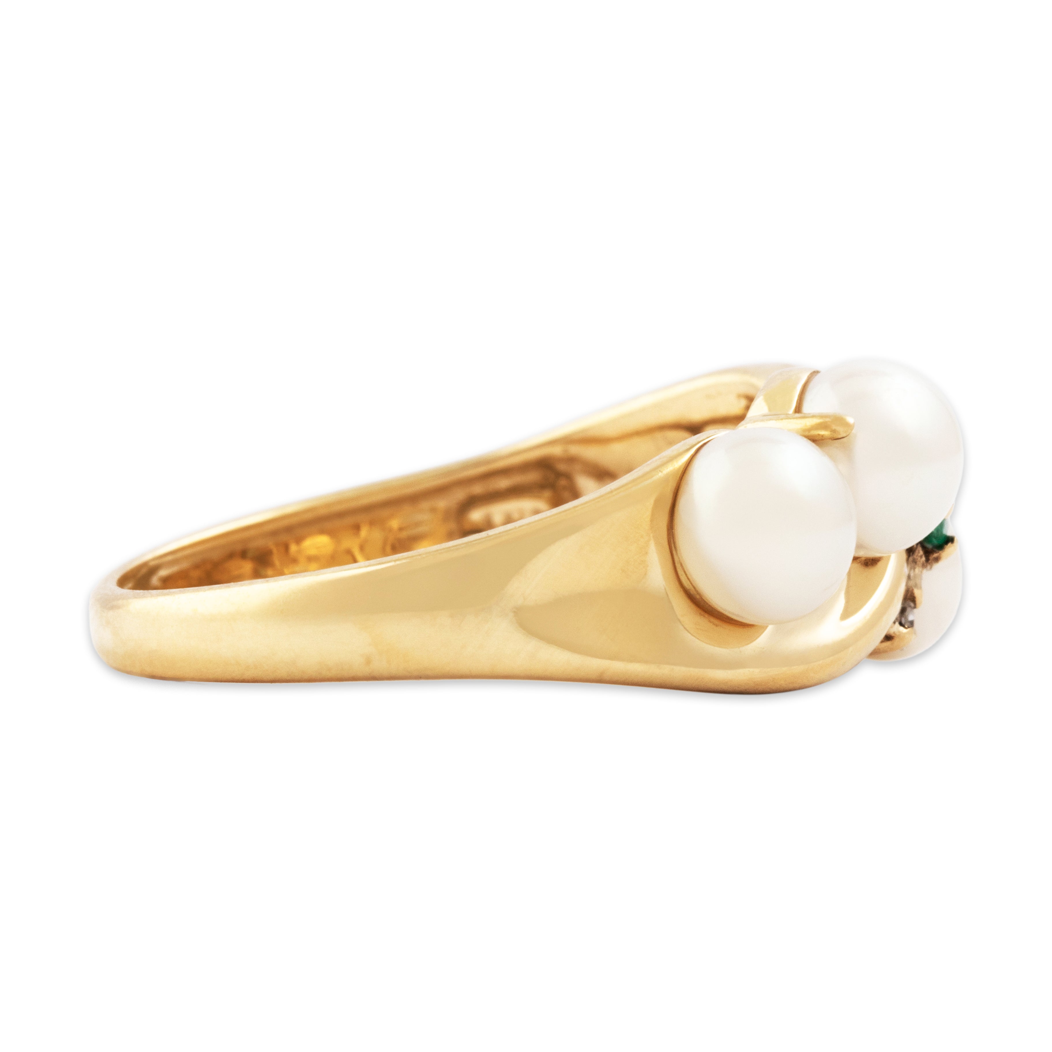 Discover this 14k yellow gold ring crafted by vintage maker in this wonderful lustrous quartet design featuring pearl, emerald, and diamond. All gemstones are natural, earth mined stones, unless stated otherwise.