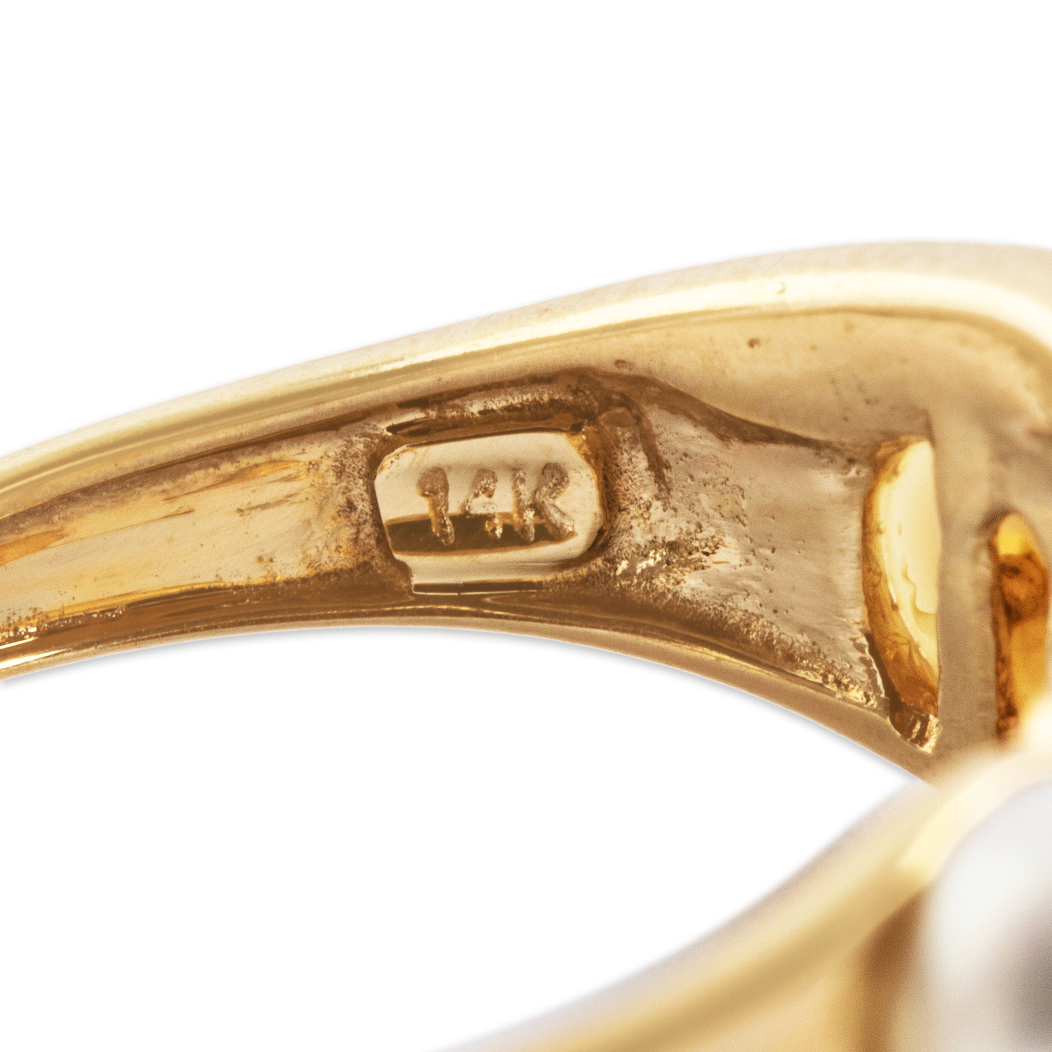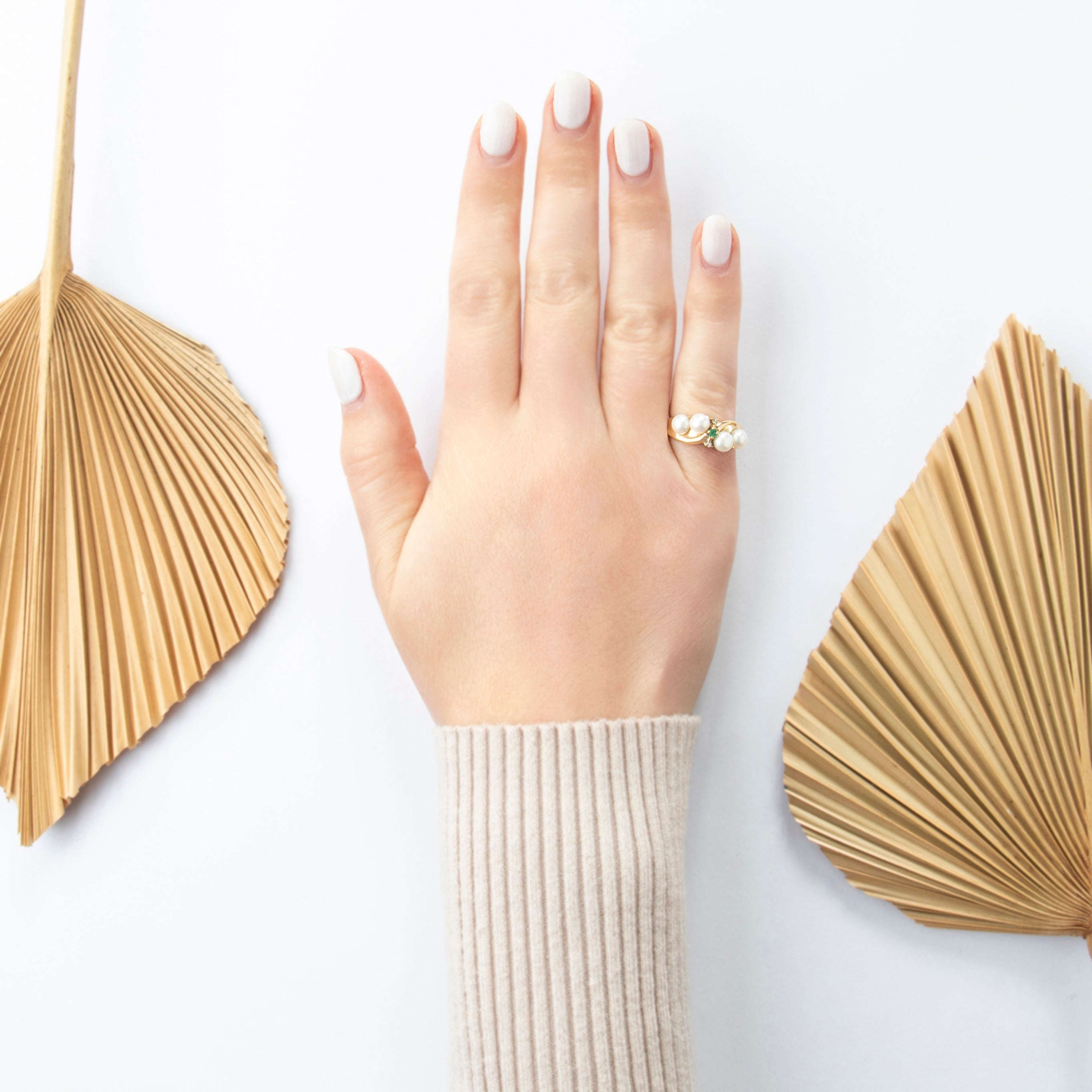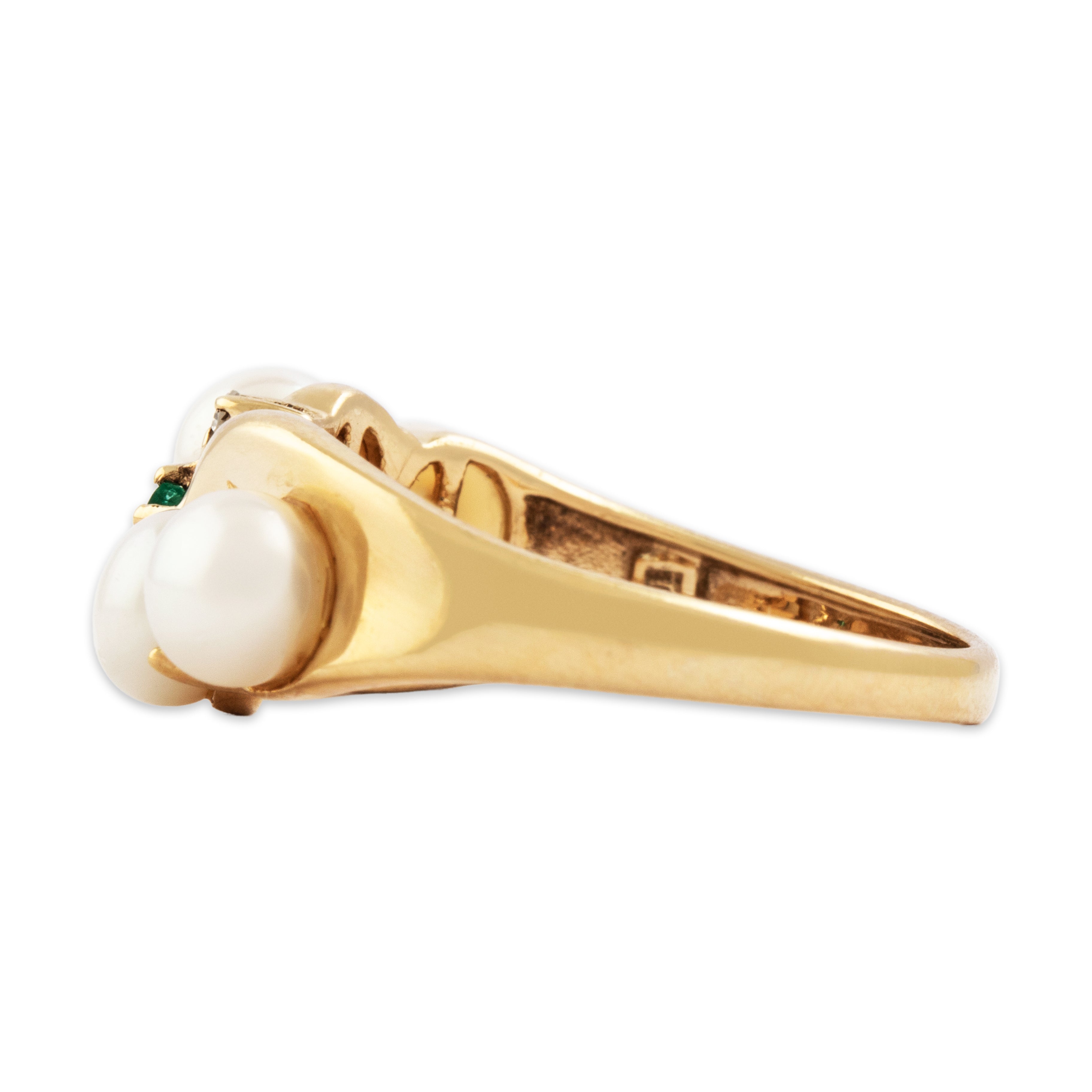 Discover this 14k yellow gold ring crafted by vintage maker in this wonderful lustrous quartet design featuring pearl, emerald, and diamond. All gemstones are natural, earth mined stones, unless stated otherwise.
