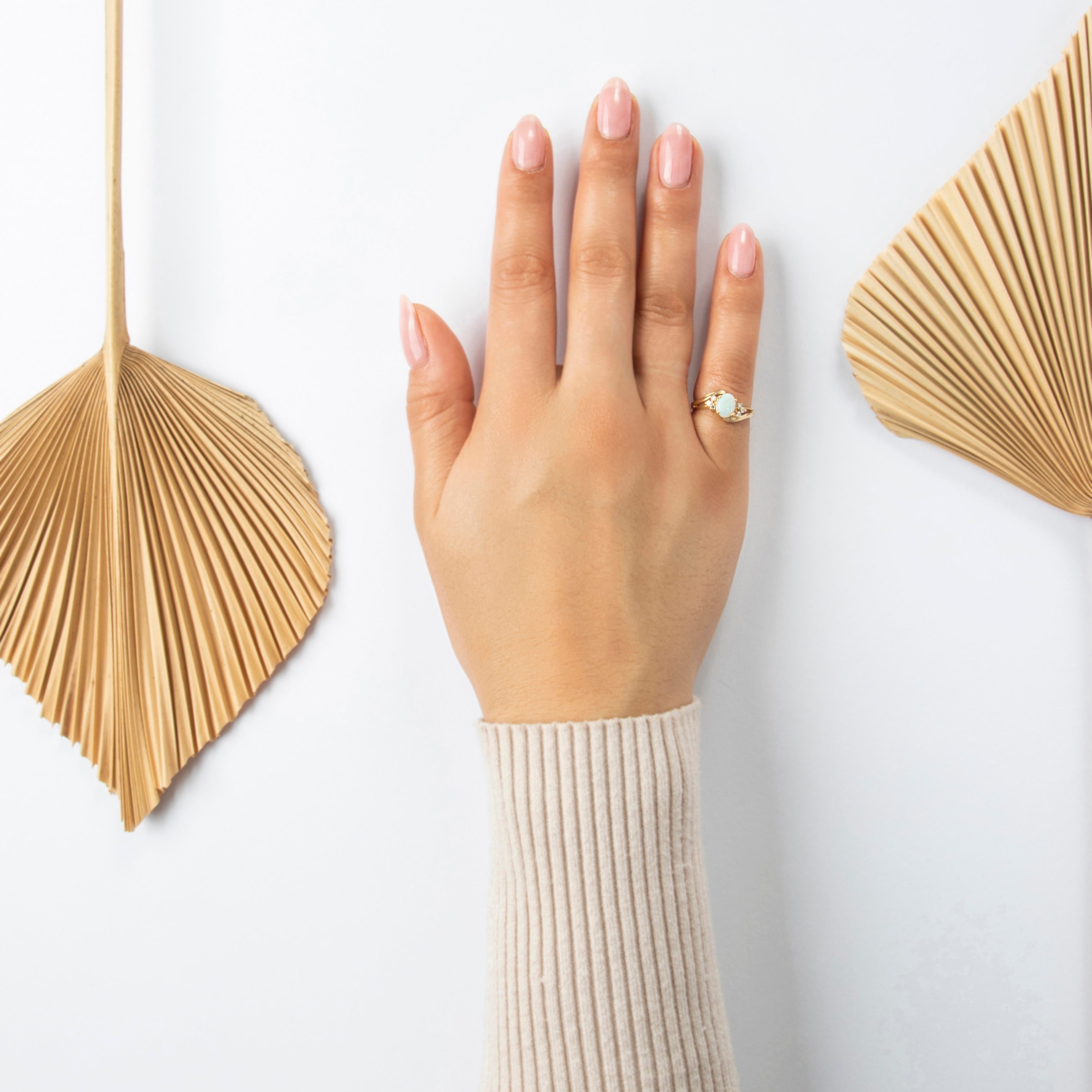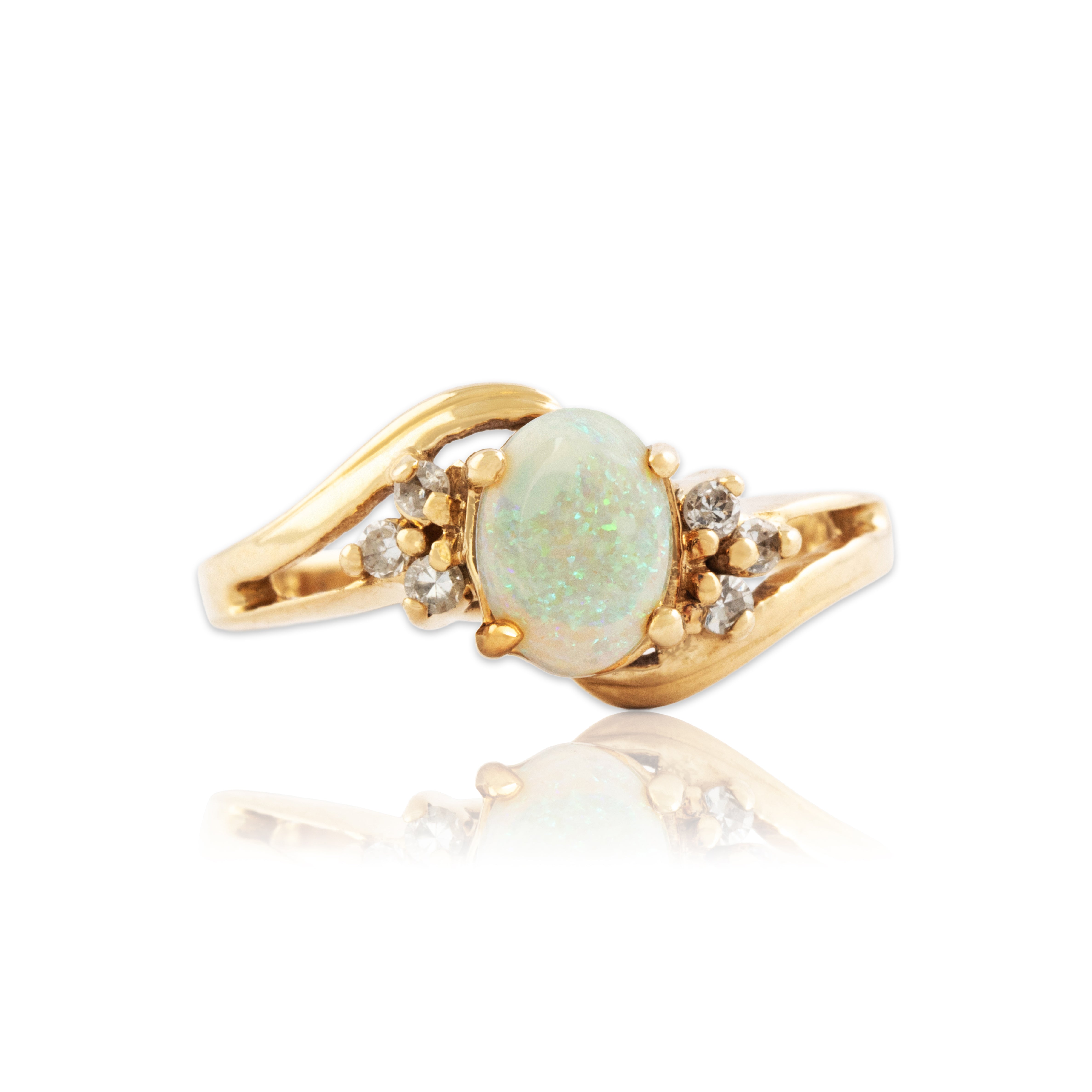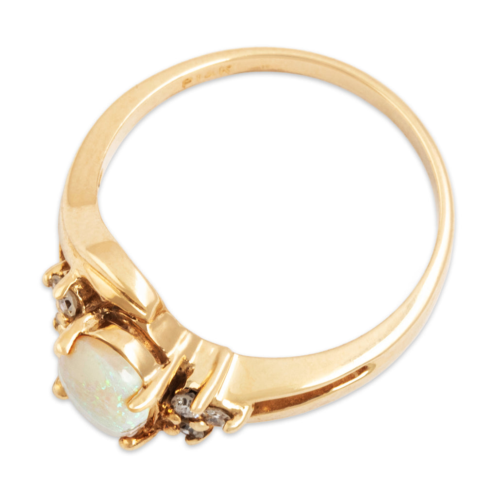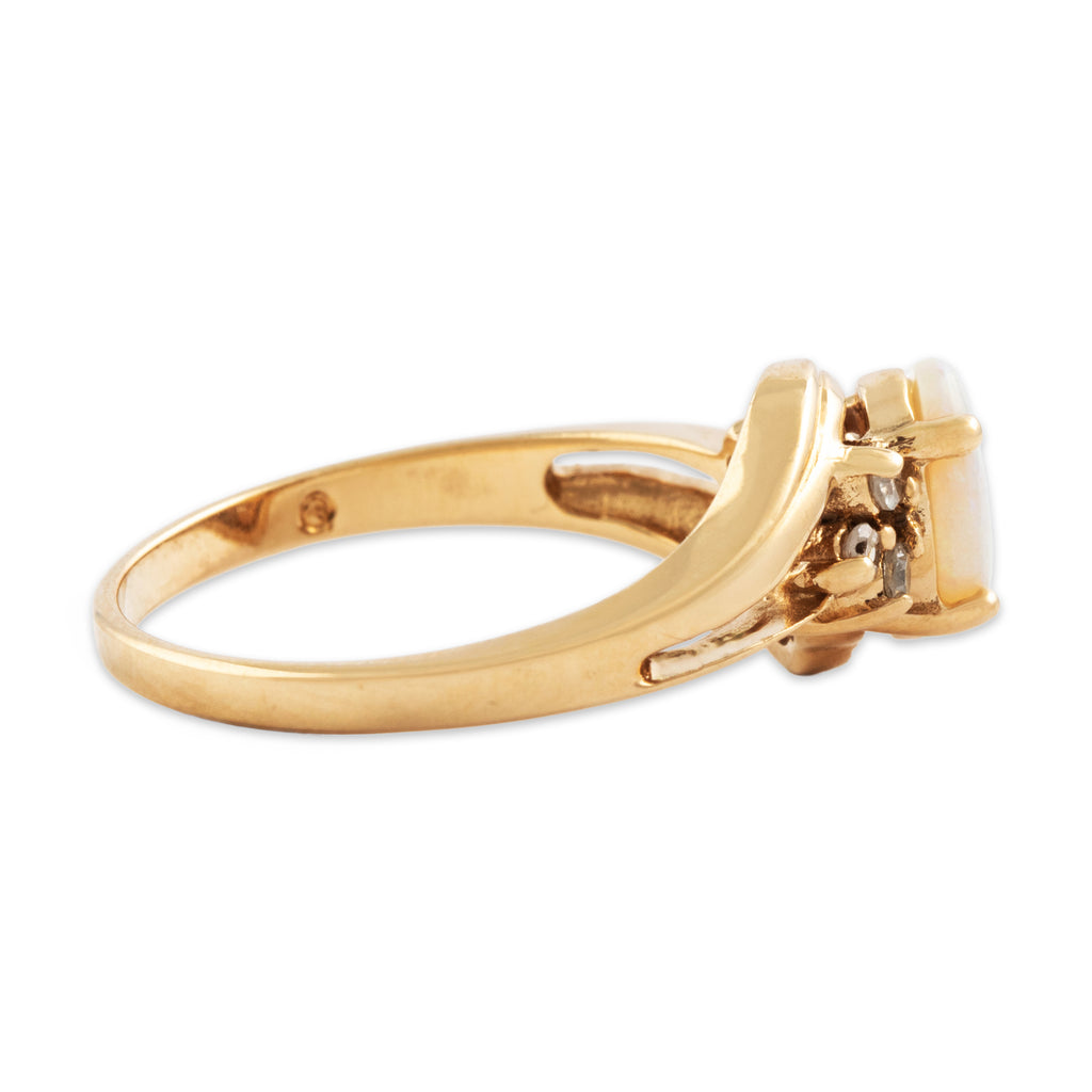 Discover this 14k yellow gold ring crafted by a vintage maker in this wonderful pretty trio shoulder design featuring white opal and diamond. All gemstones are natural, earth mined stones, unless stated otherwise.