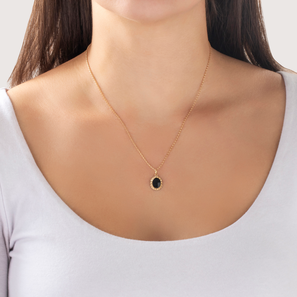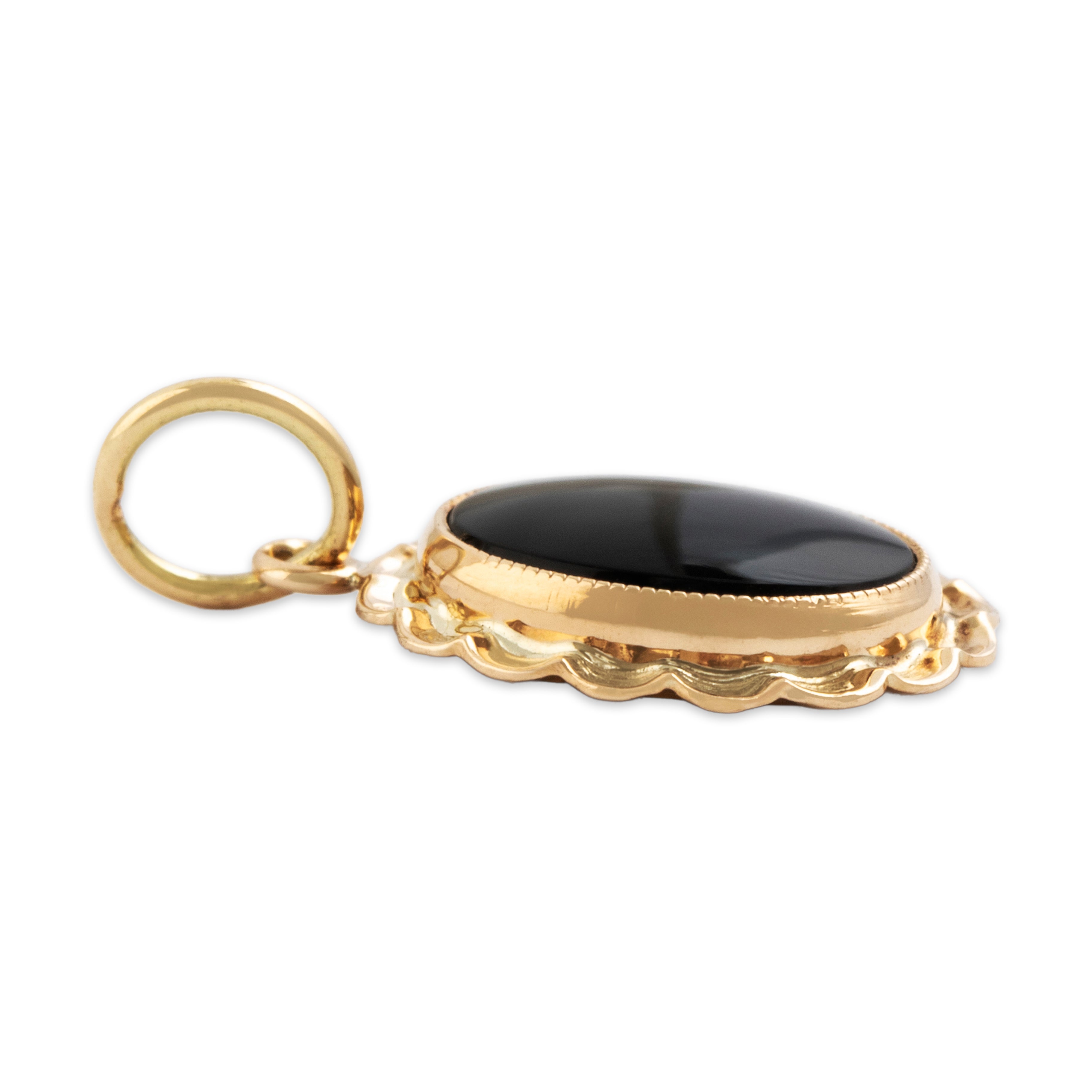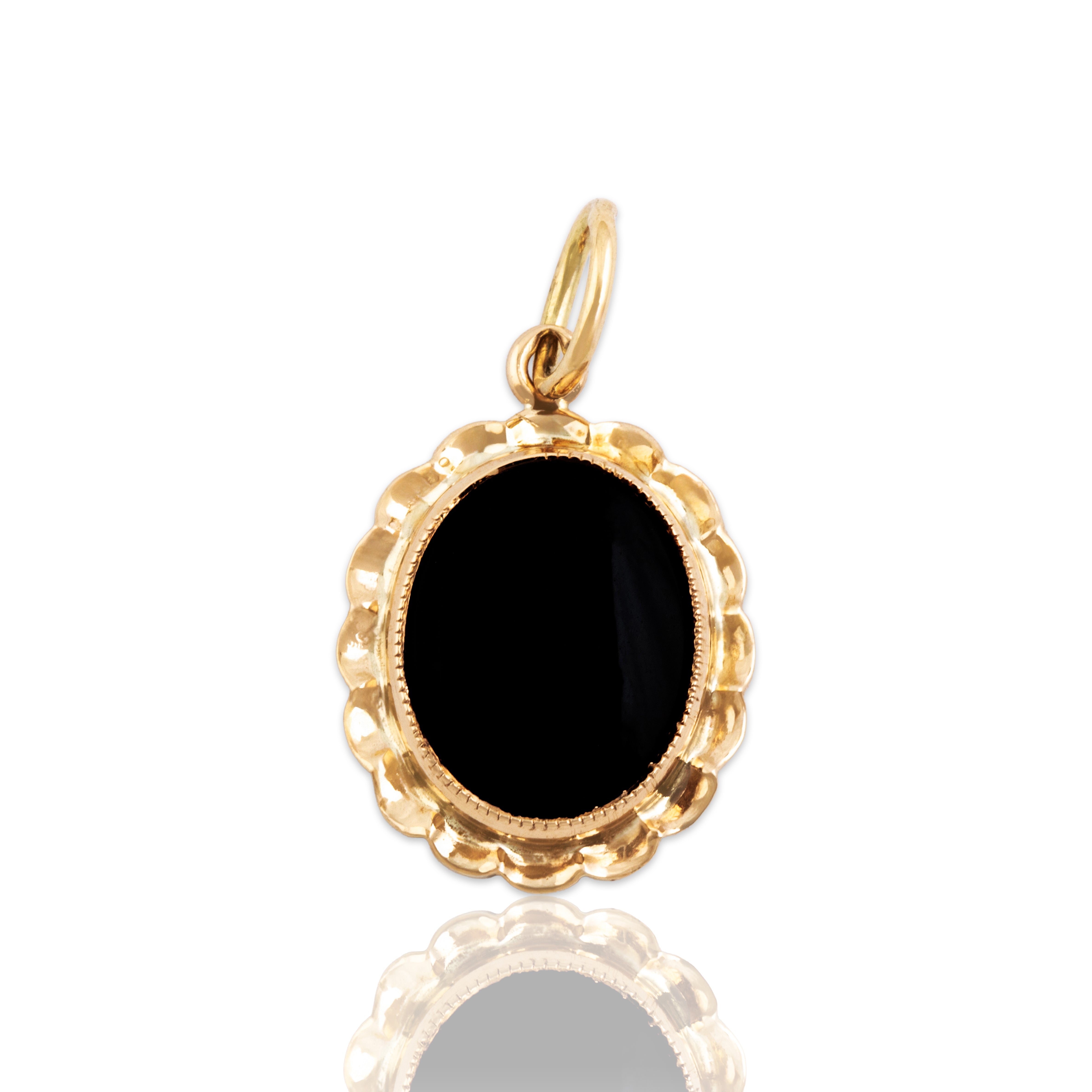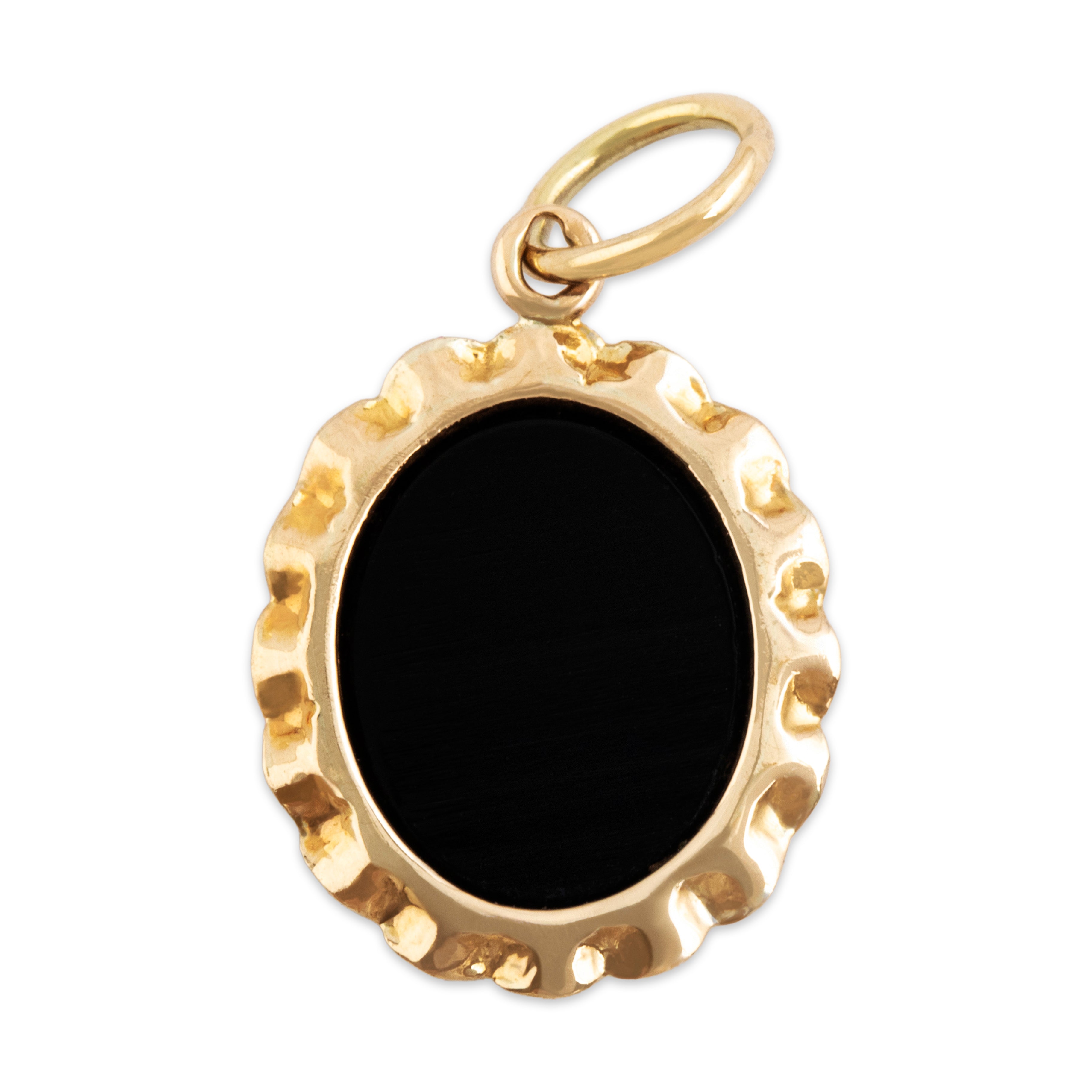 Discover this 10k yellow gold charm / pendant crafted by a vintage maker in a frilly bezel design featuring onyx. All gemstones are natural, earth mined stones, unless stated otherwise.