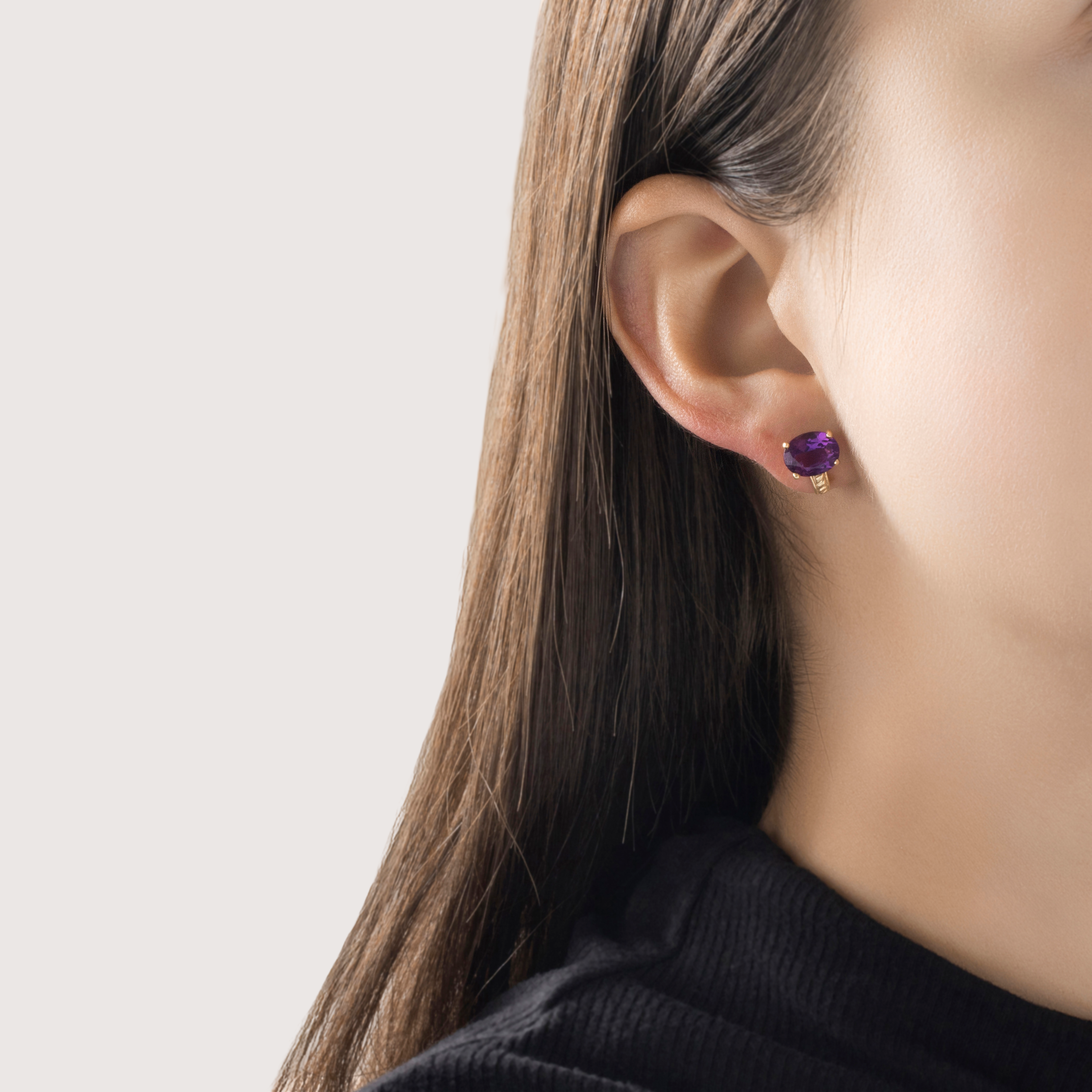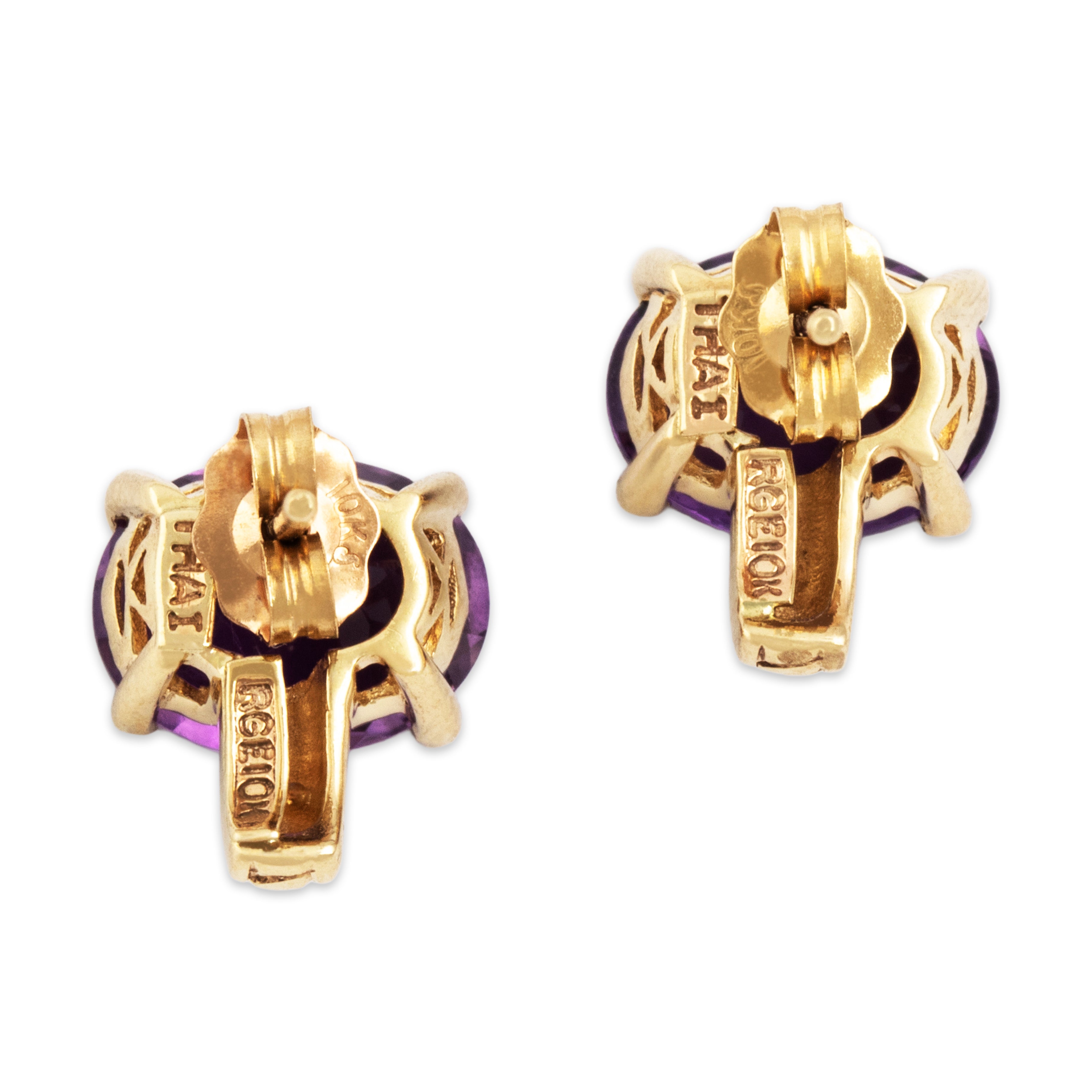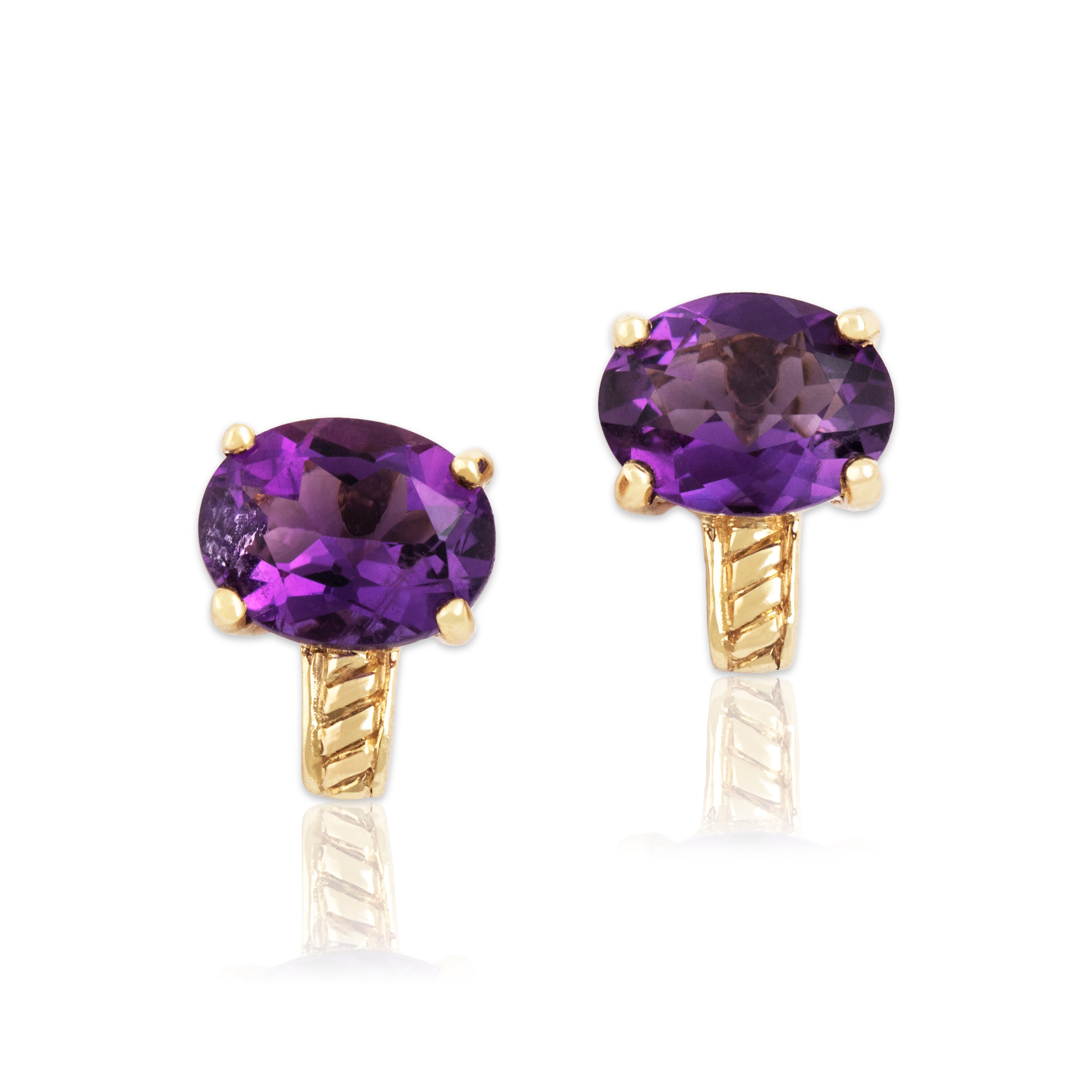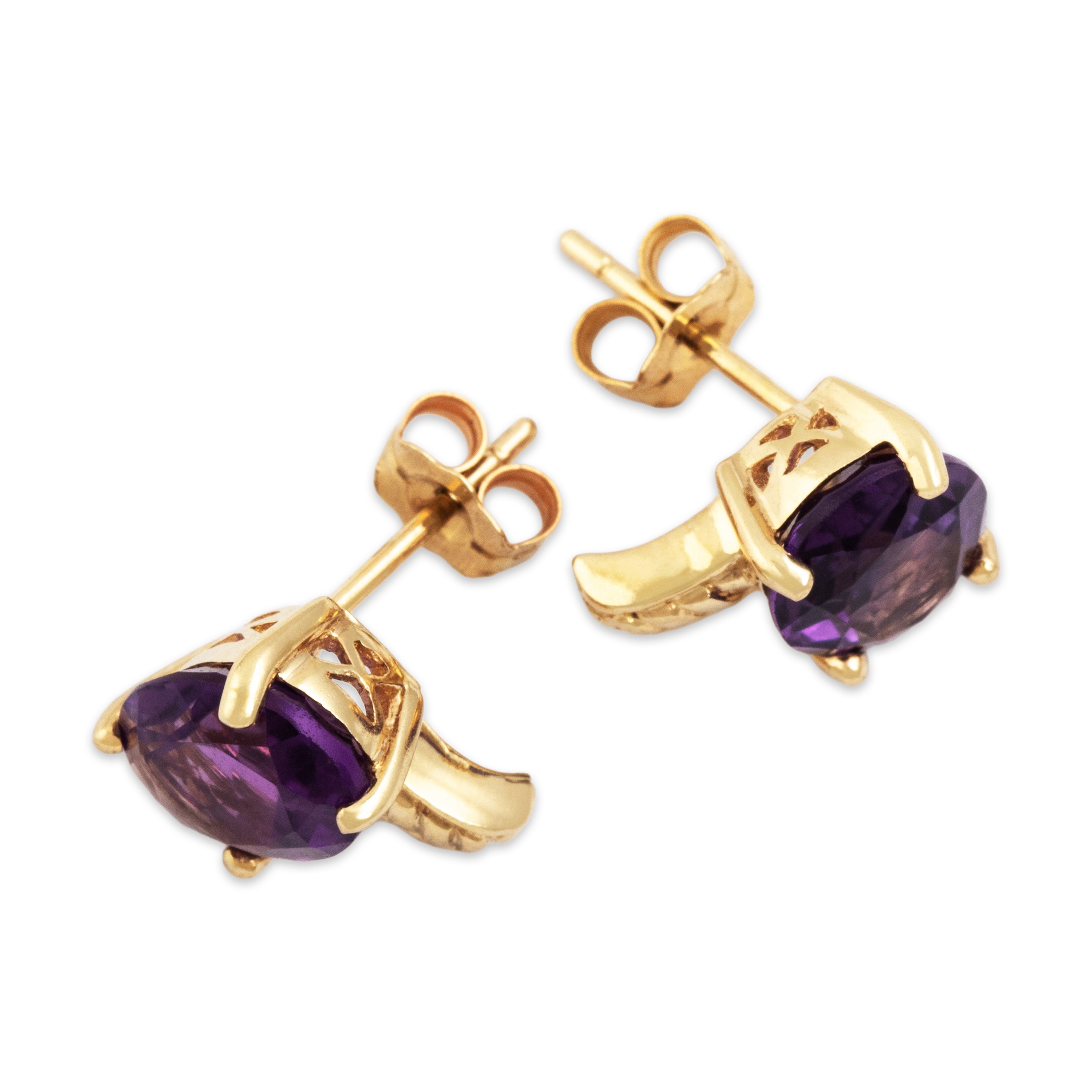 Discover this pair of 10k yellow gold stud earrings crafted by a vintage maker in a chic east-west design featuring amethyst. All gemstones are natural, earth mined stones, unless stated otherwise.