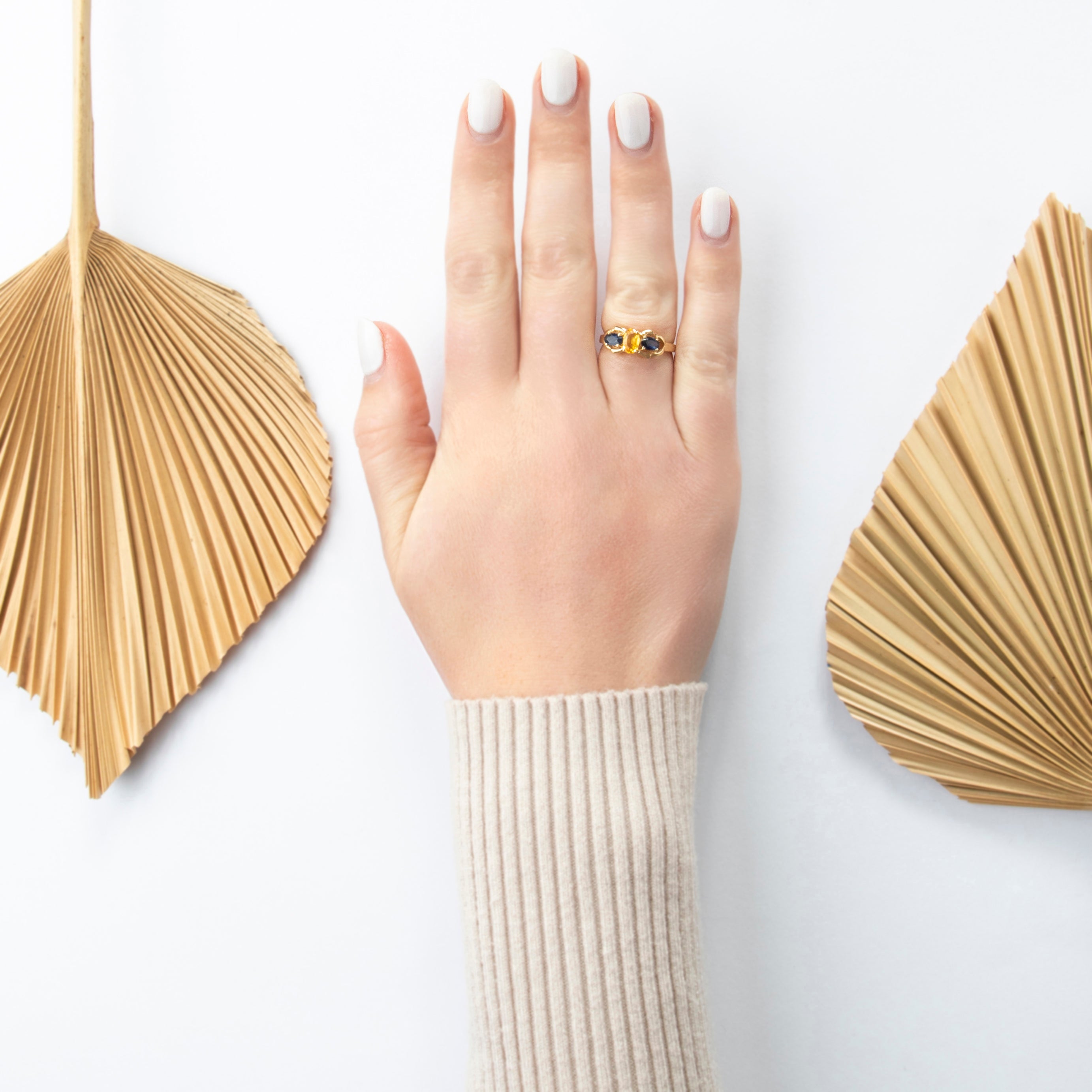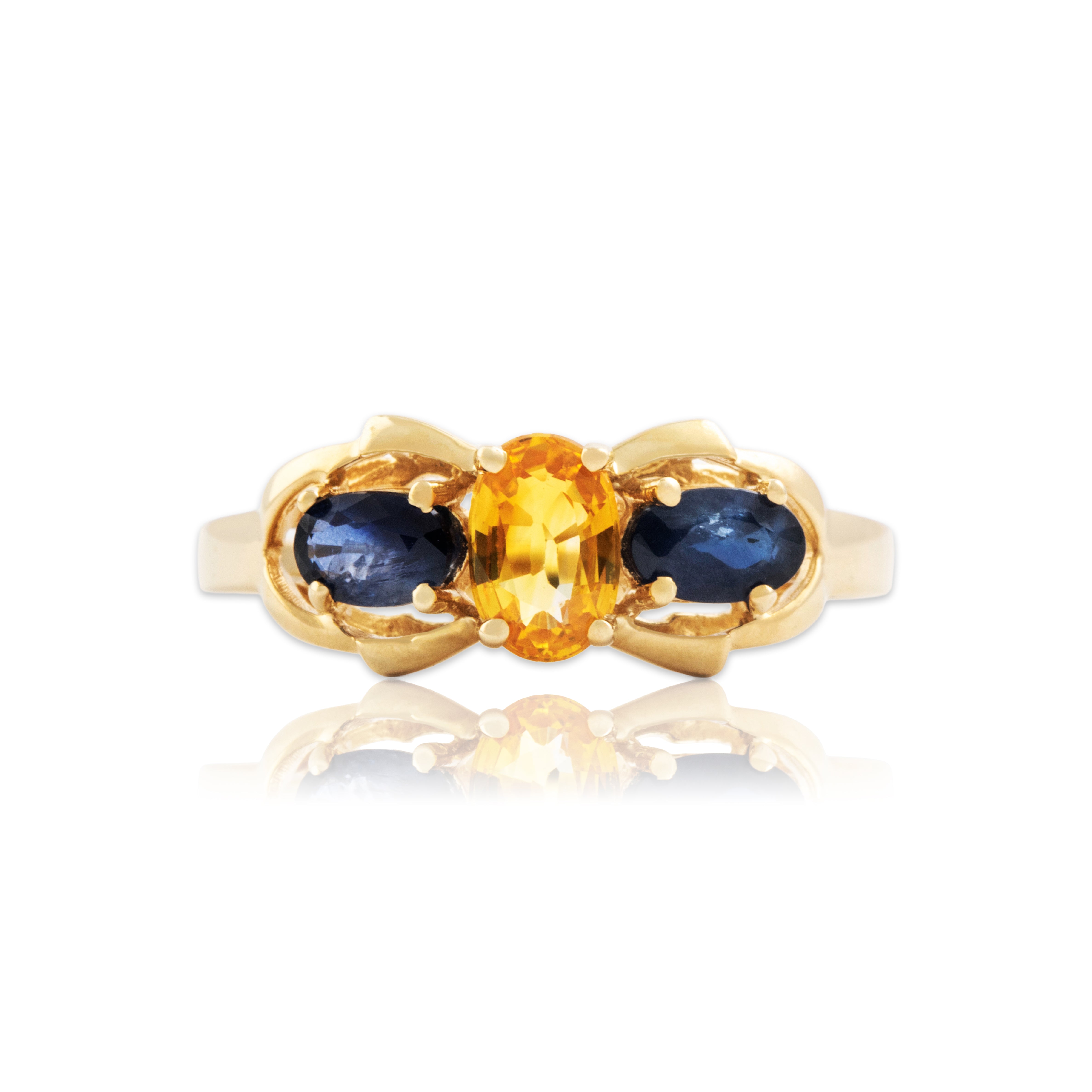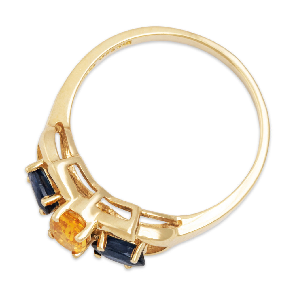 Discover this 14k yellow gold ring crafted by a vintage maker in a three-stone design featuring yellow and blue sapphire. All gemstones are natural, earth mined stones, unless stated otherwise.