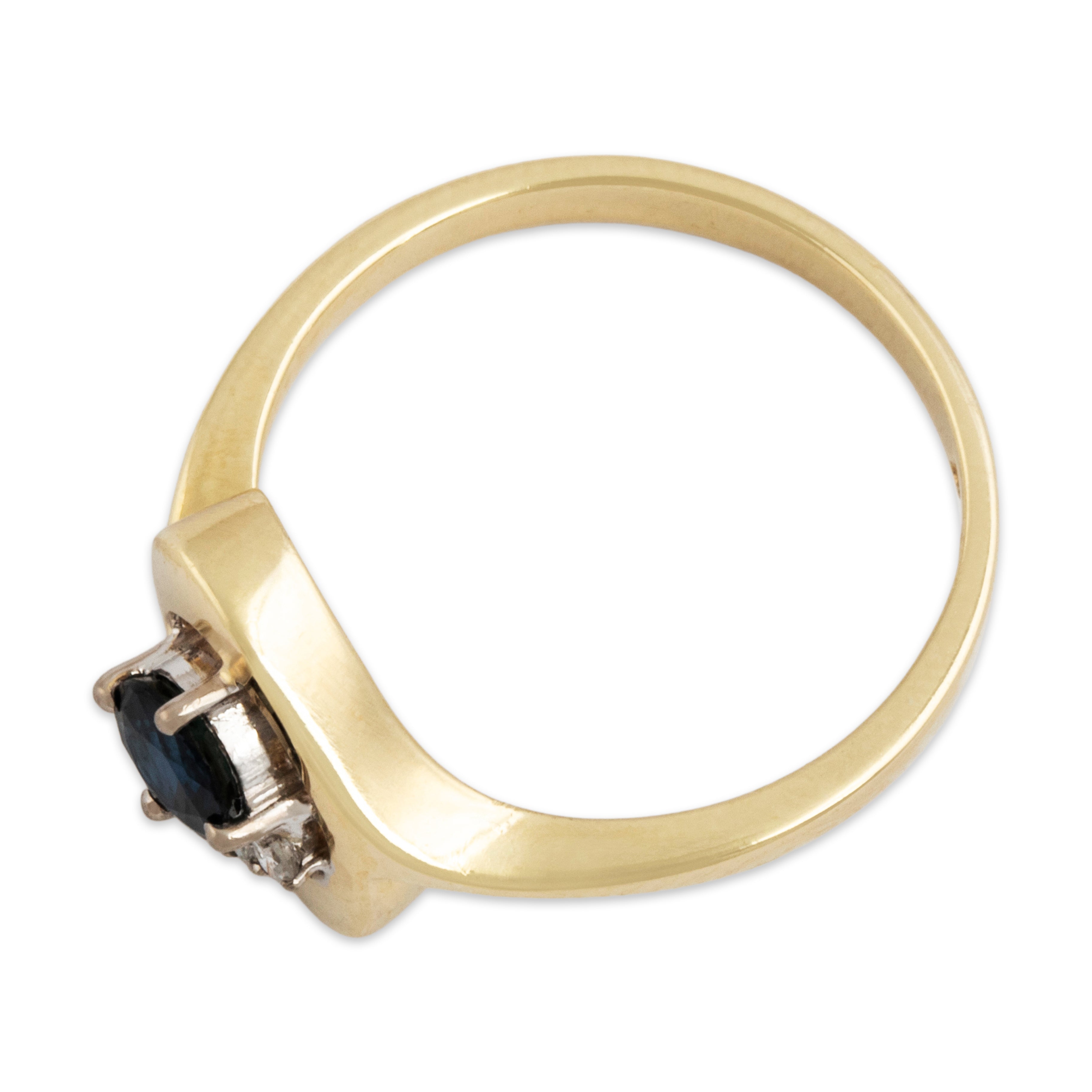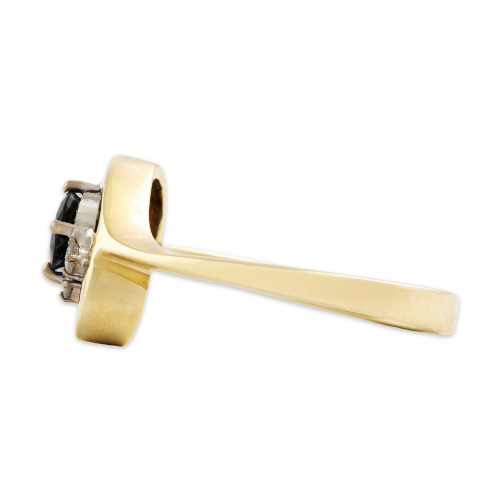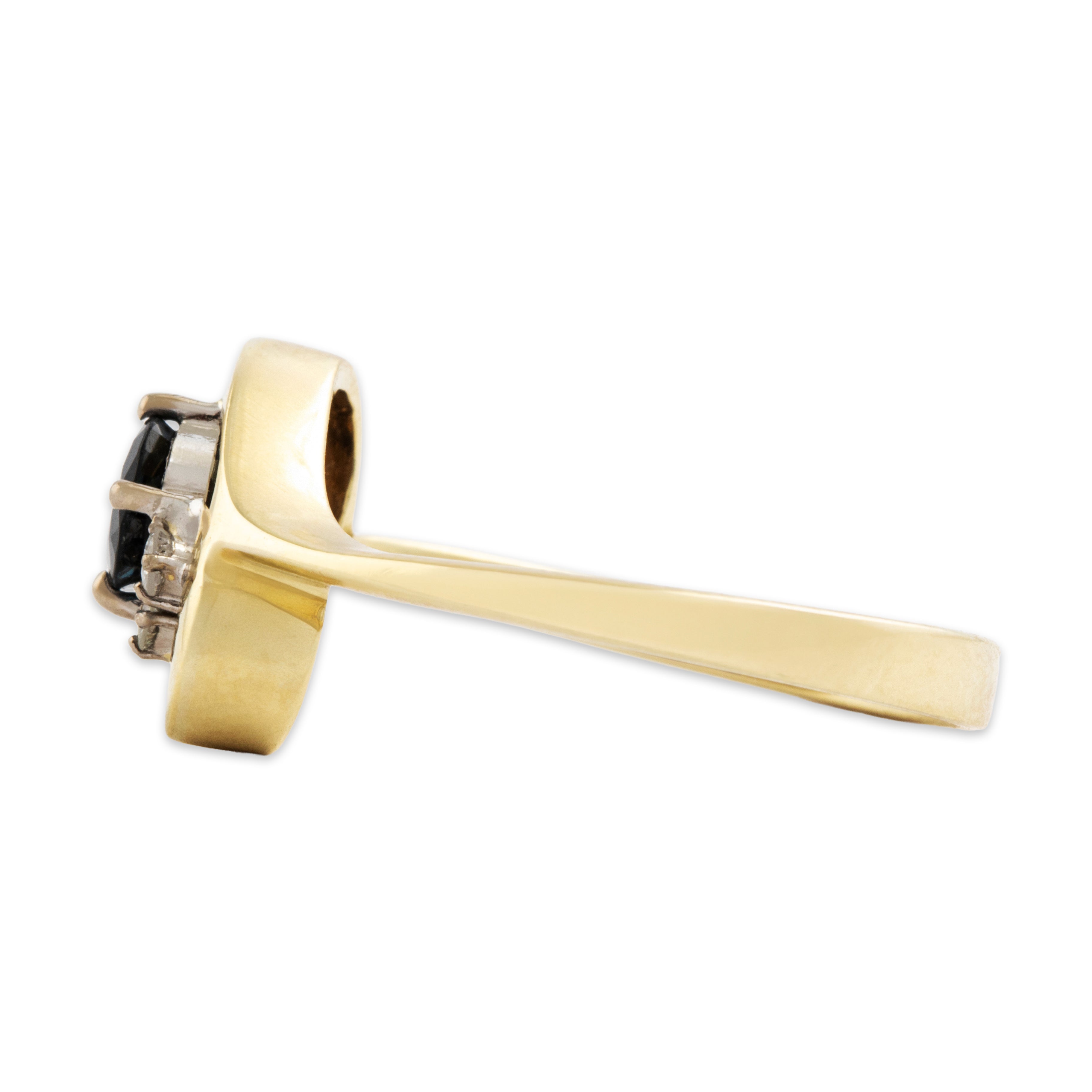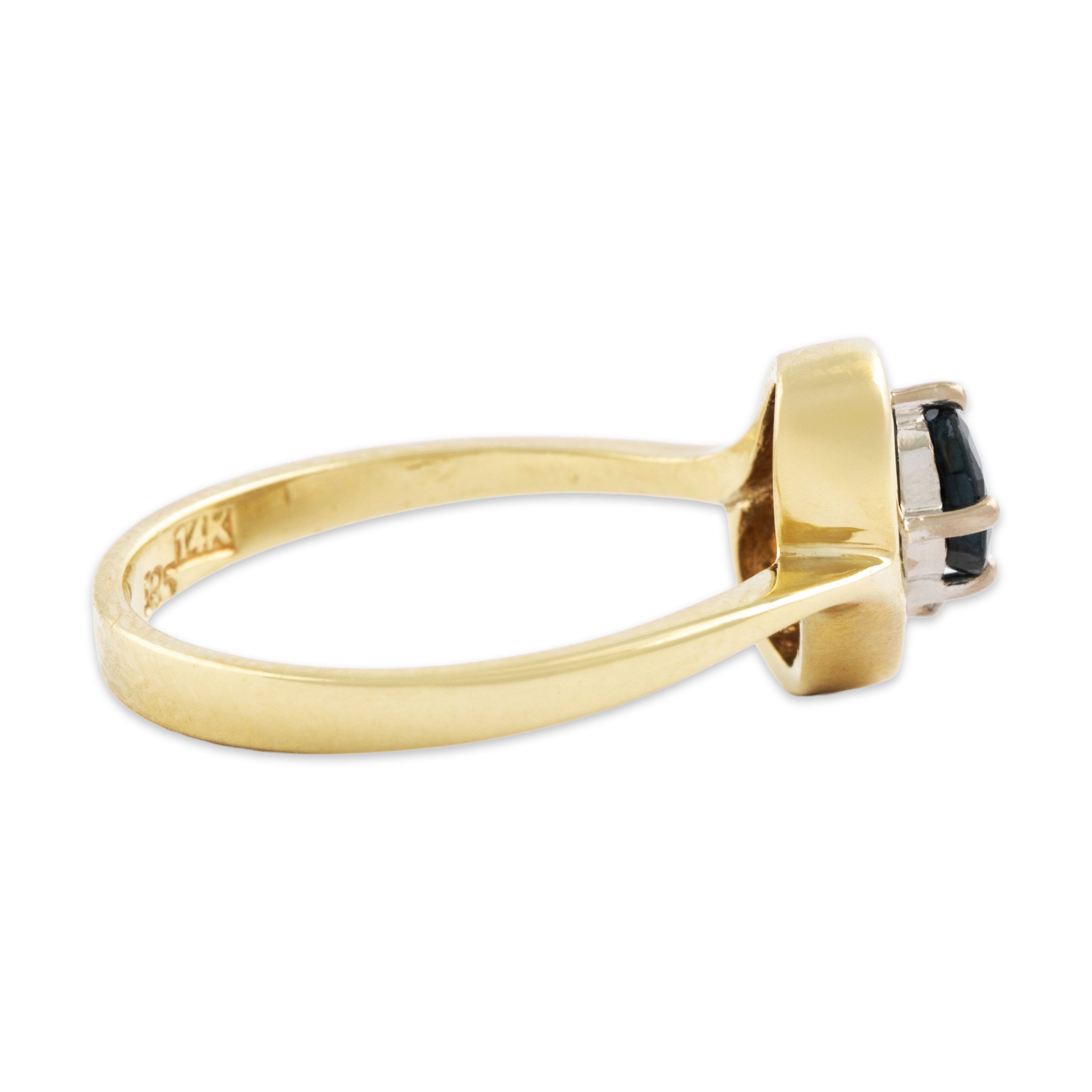 Discover this 14k yellow gold ring crafted by a vintage maker in a gleaming oblong design featuring dark blue sapphire and diamond. All gemstones are natural, earth mined stones, unless stated otherwise.