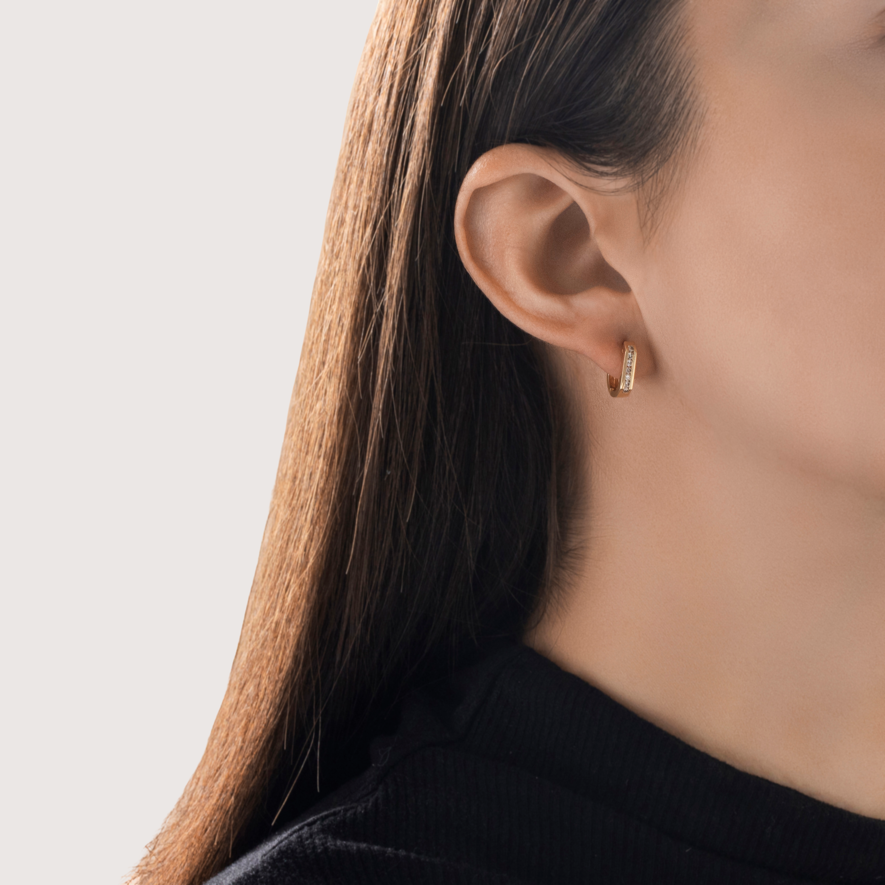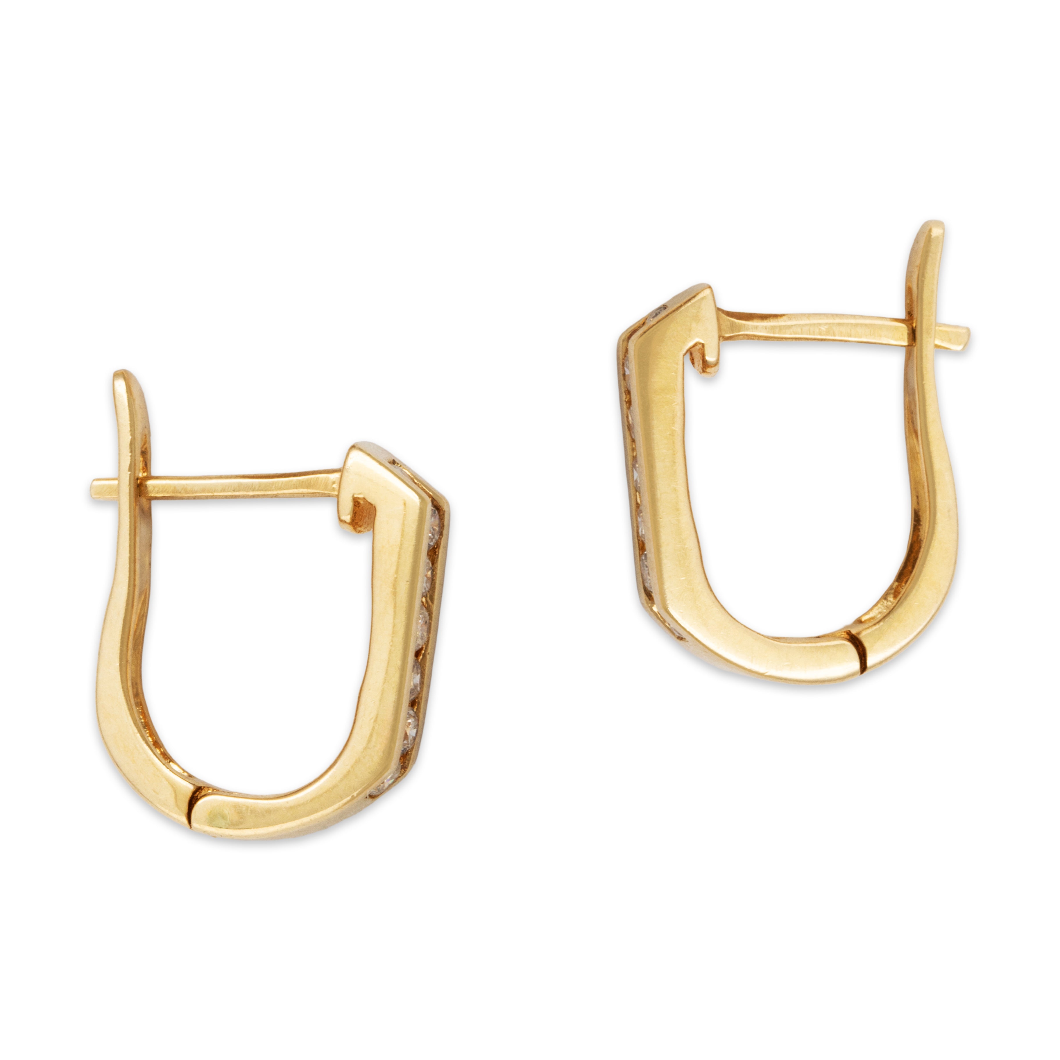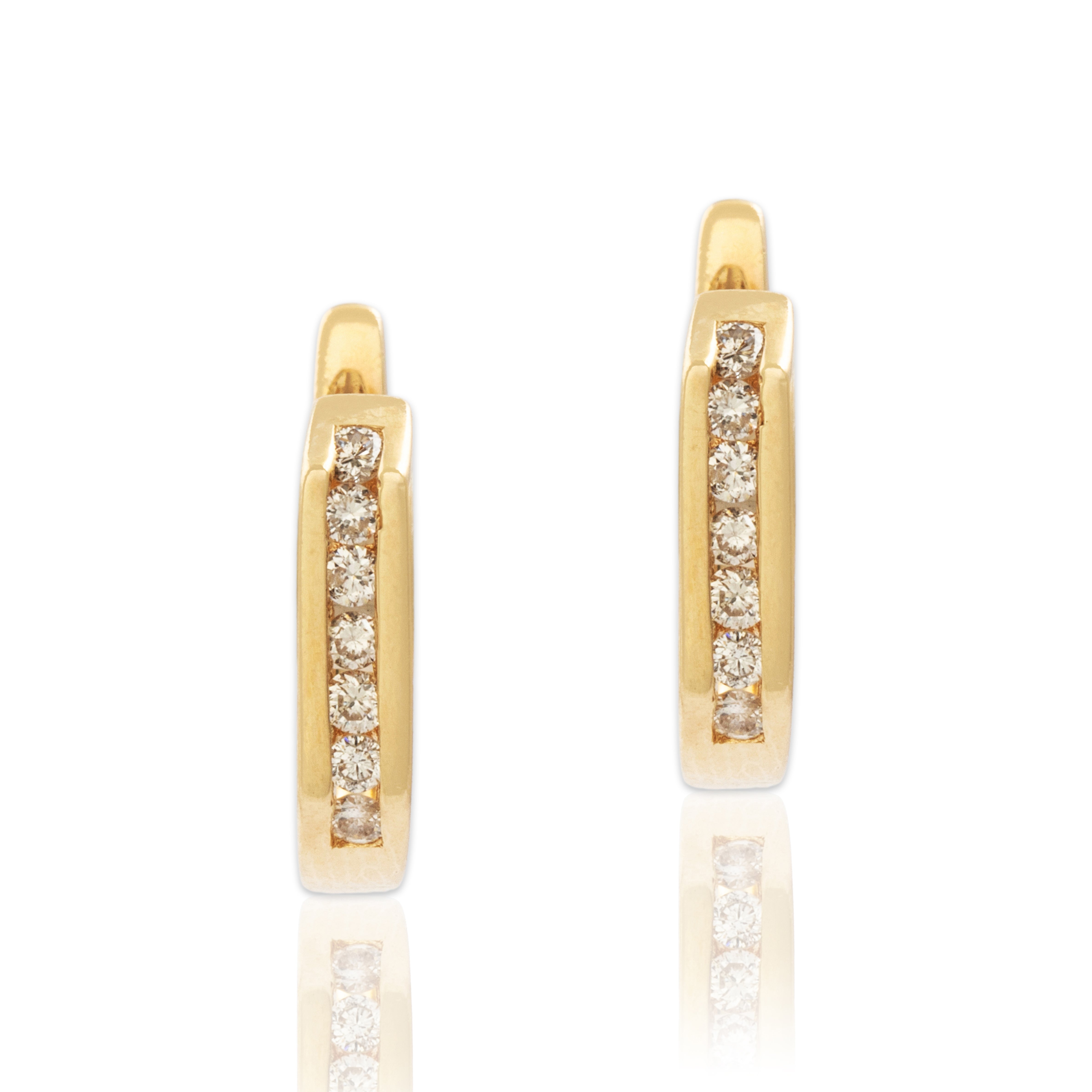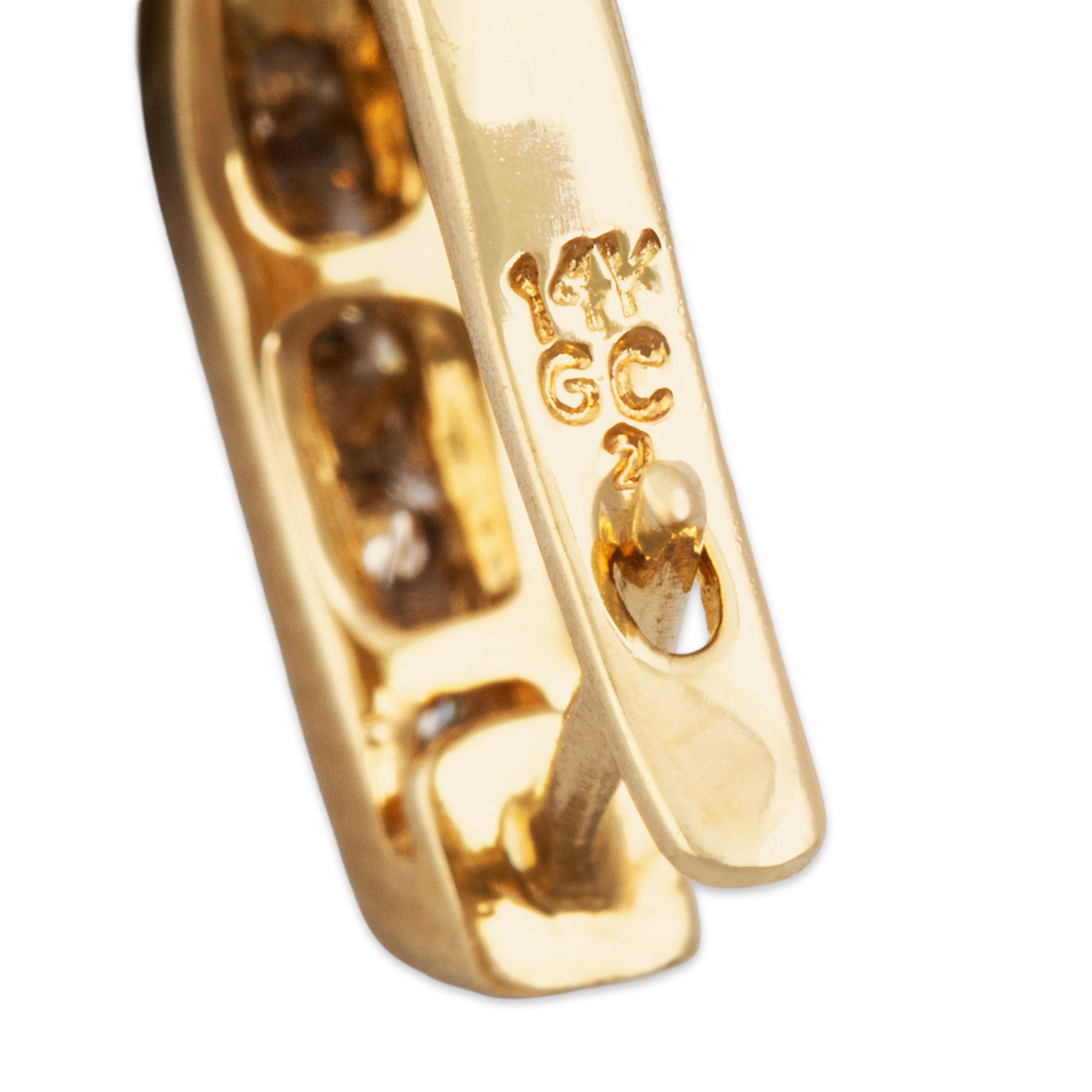 Discover a pair of 14k yellow gold huggie earrings crafted by a vintage maker in a wonderful channel set design featuring diamond. All gemstones are natural, earth mined stones, unless stated otherwise.