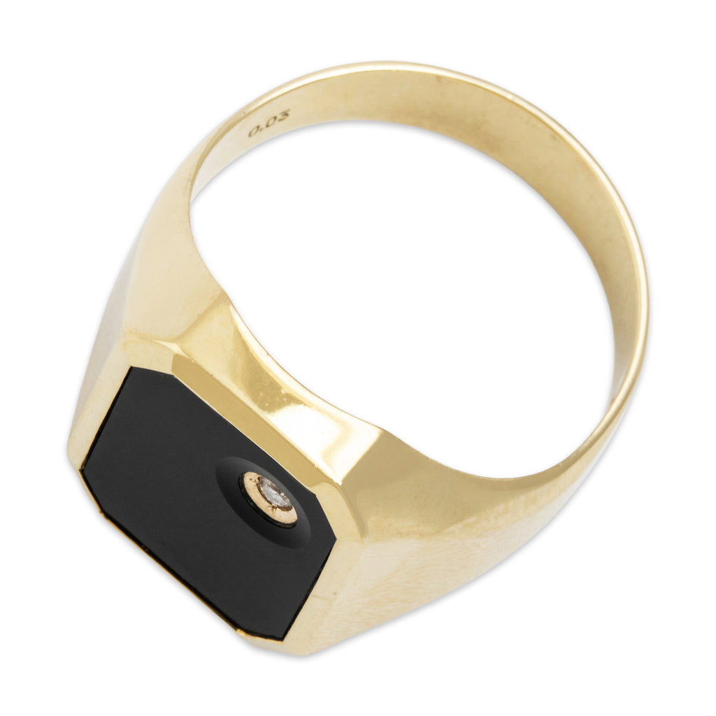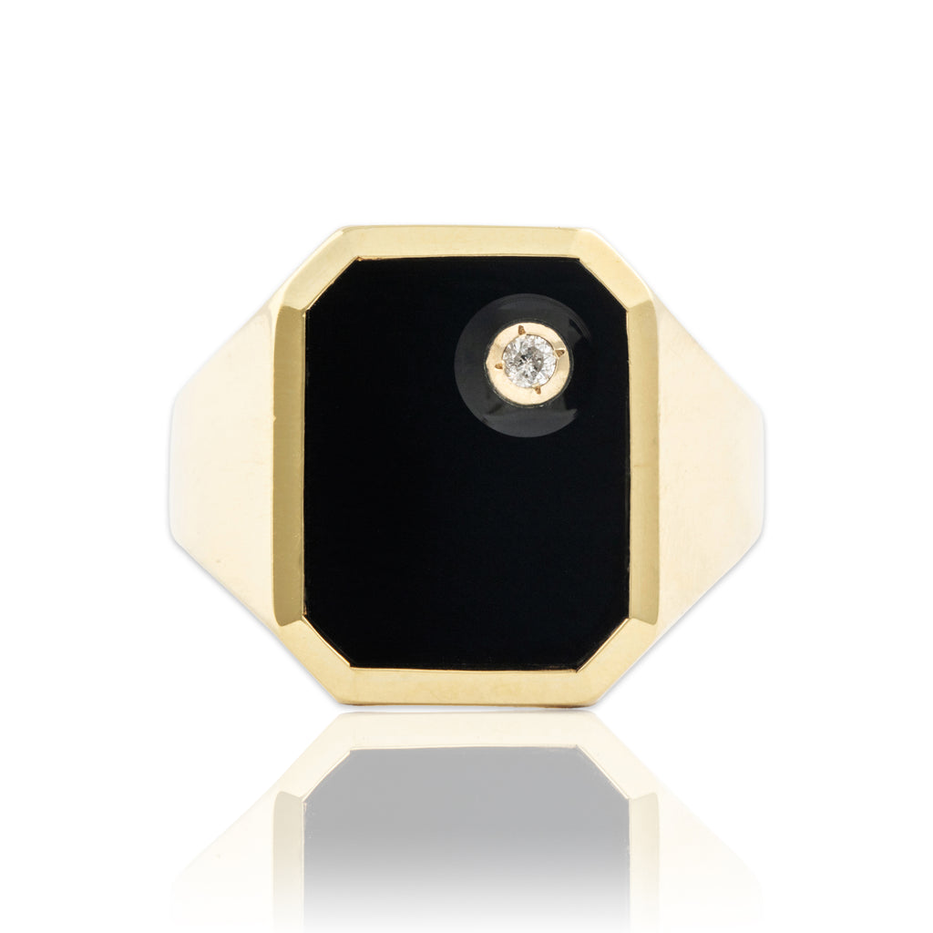 Discover this 14k yellow gold ring crafted by a vintage maker in an architectural signet design featuring onyx and diamond. All gemstones are natural, earth mined stones, unless stated otherwise.