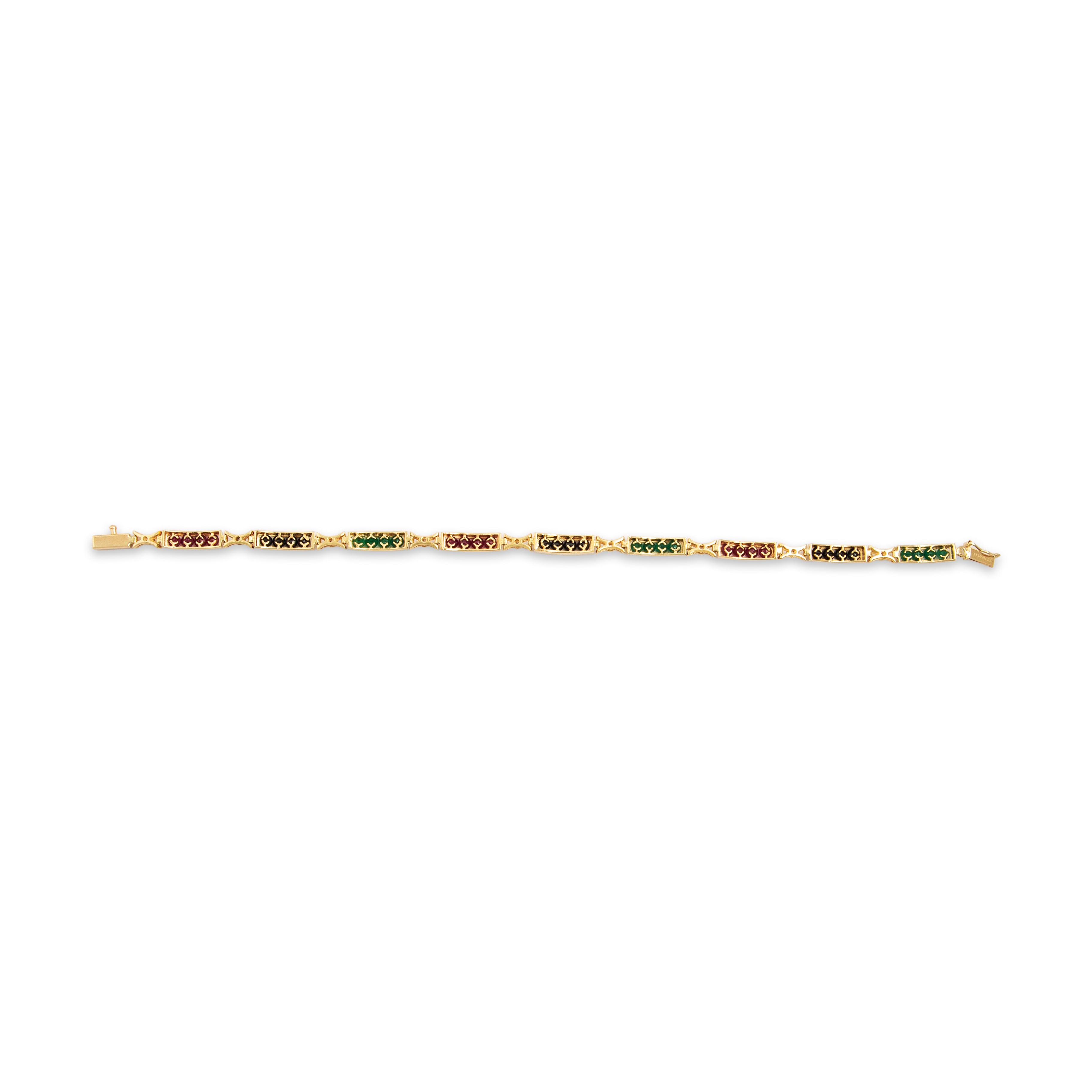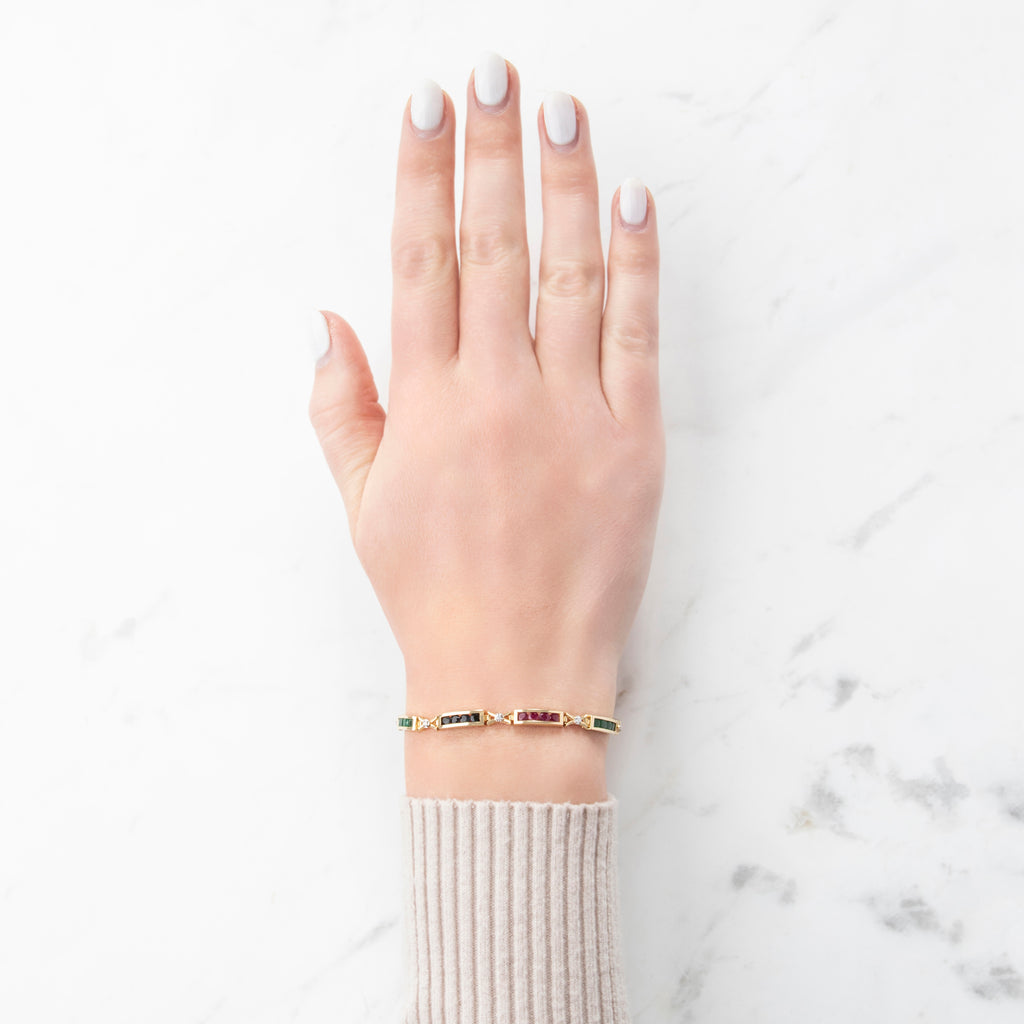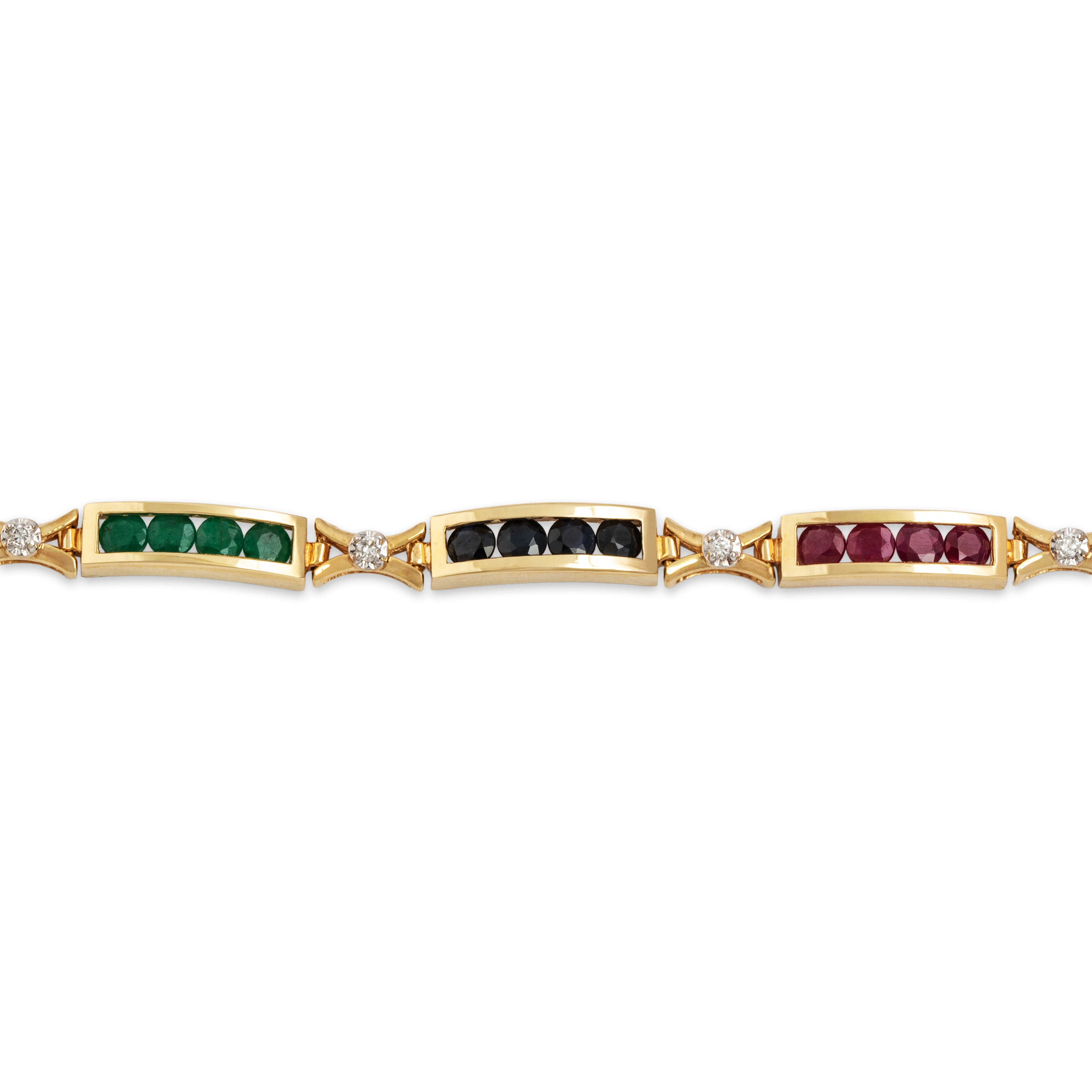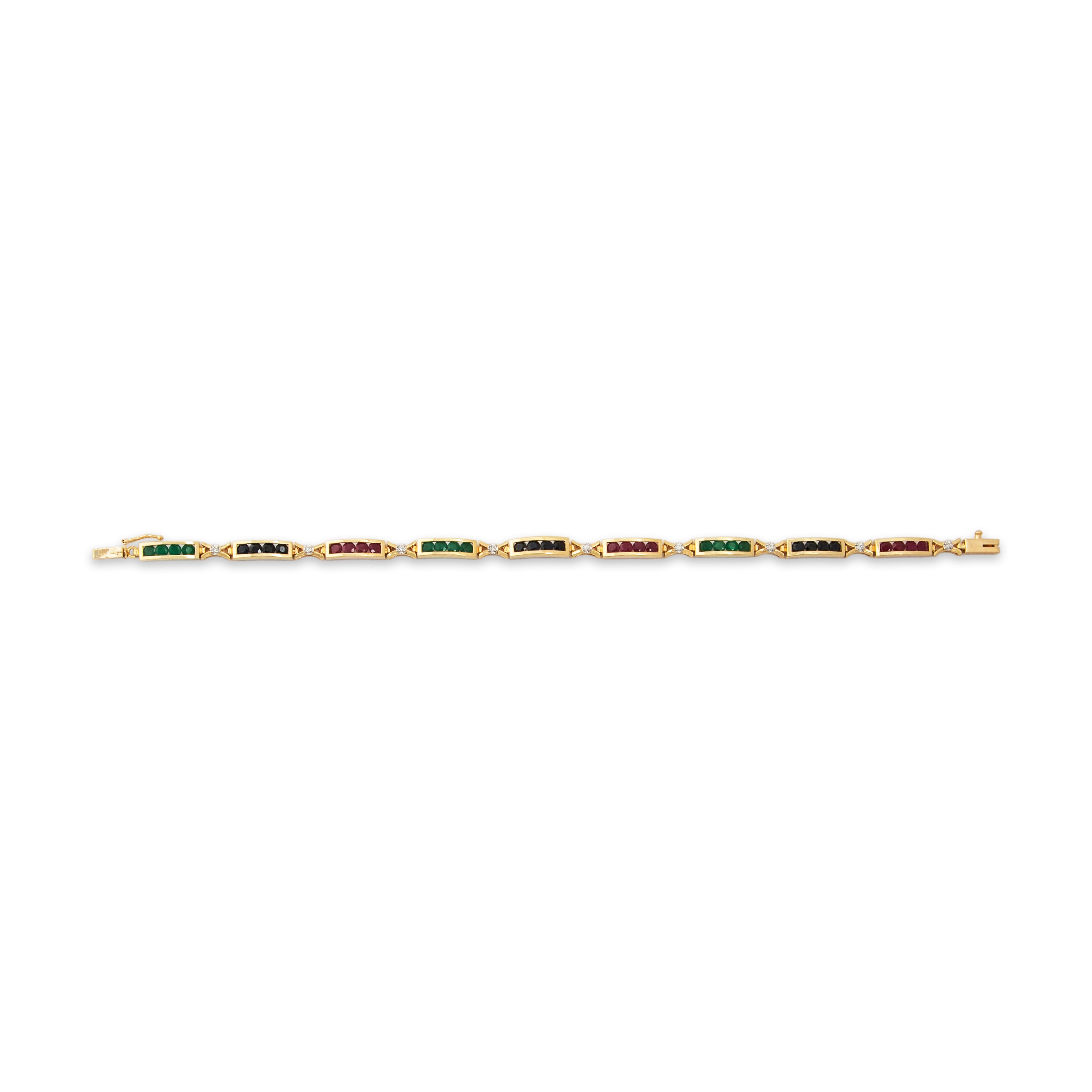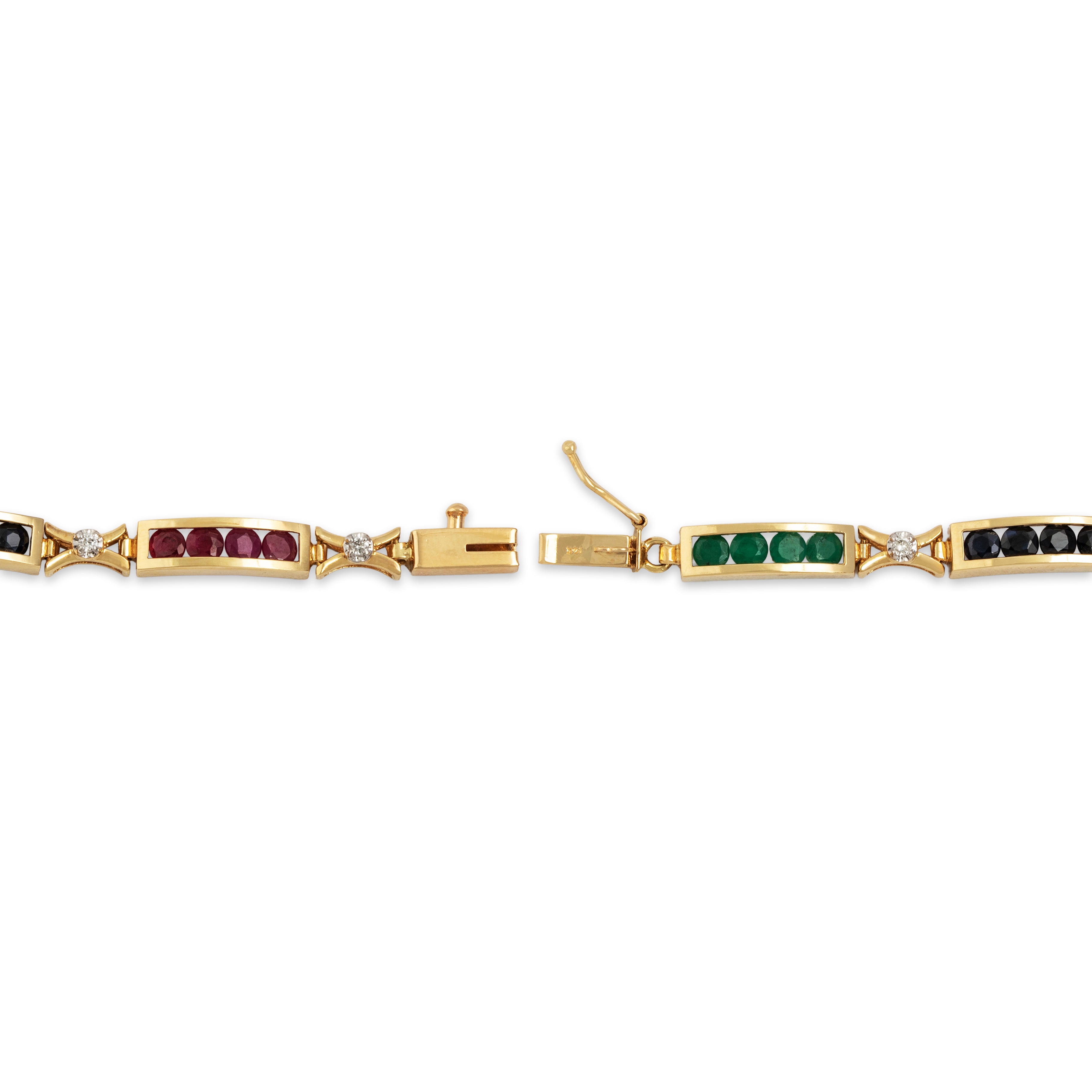 Discover this 14k yellow gold bracelet crafted by a vintage maker in a multicolor line link  design featuring ruby, blue sapphire, emerald, and diamond. All gemstones are natural, earth mined stones, unless stated otherwise.