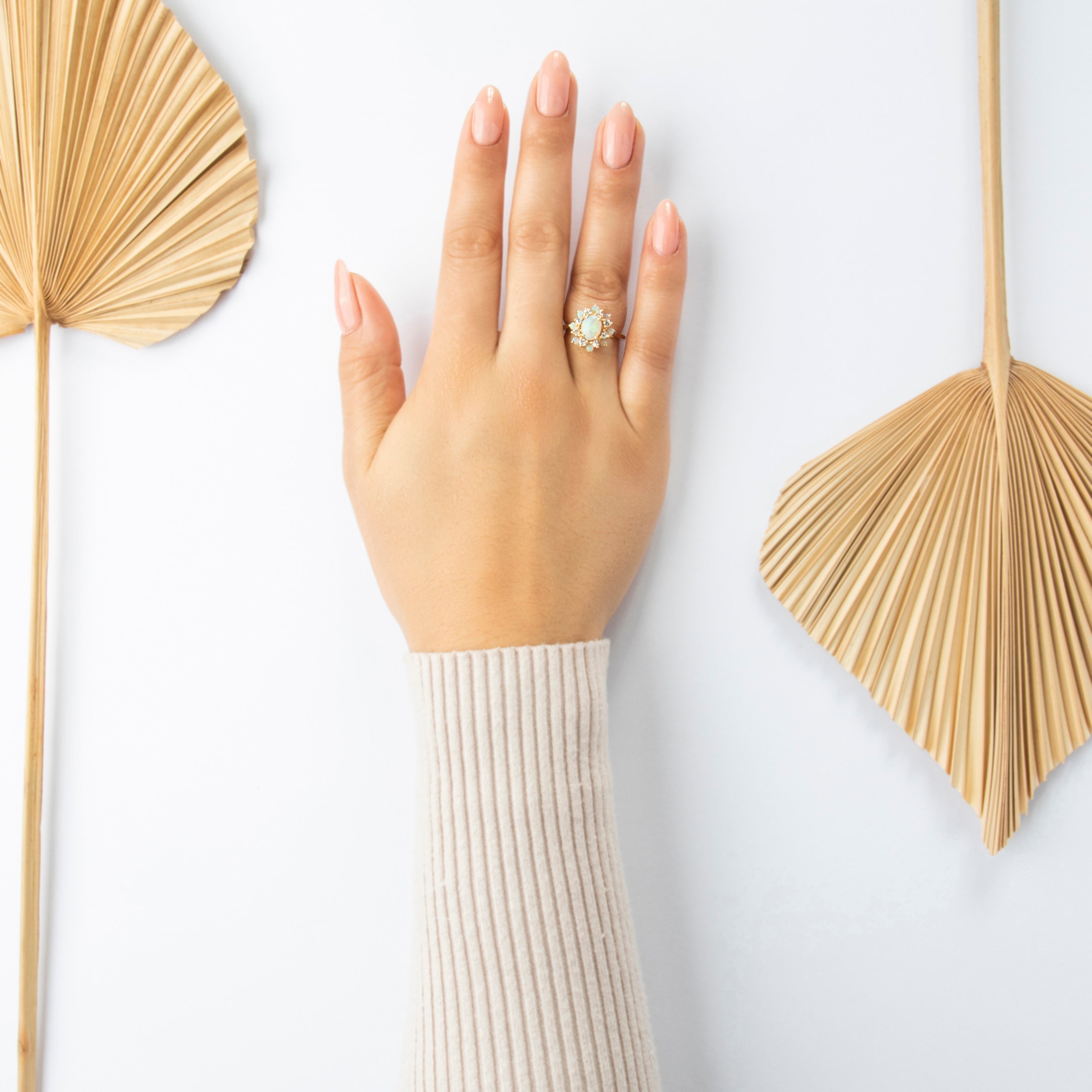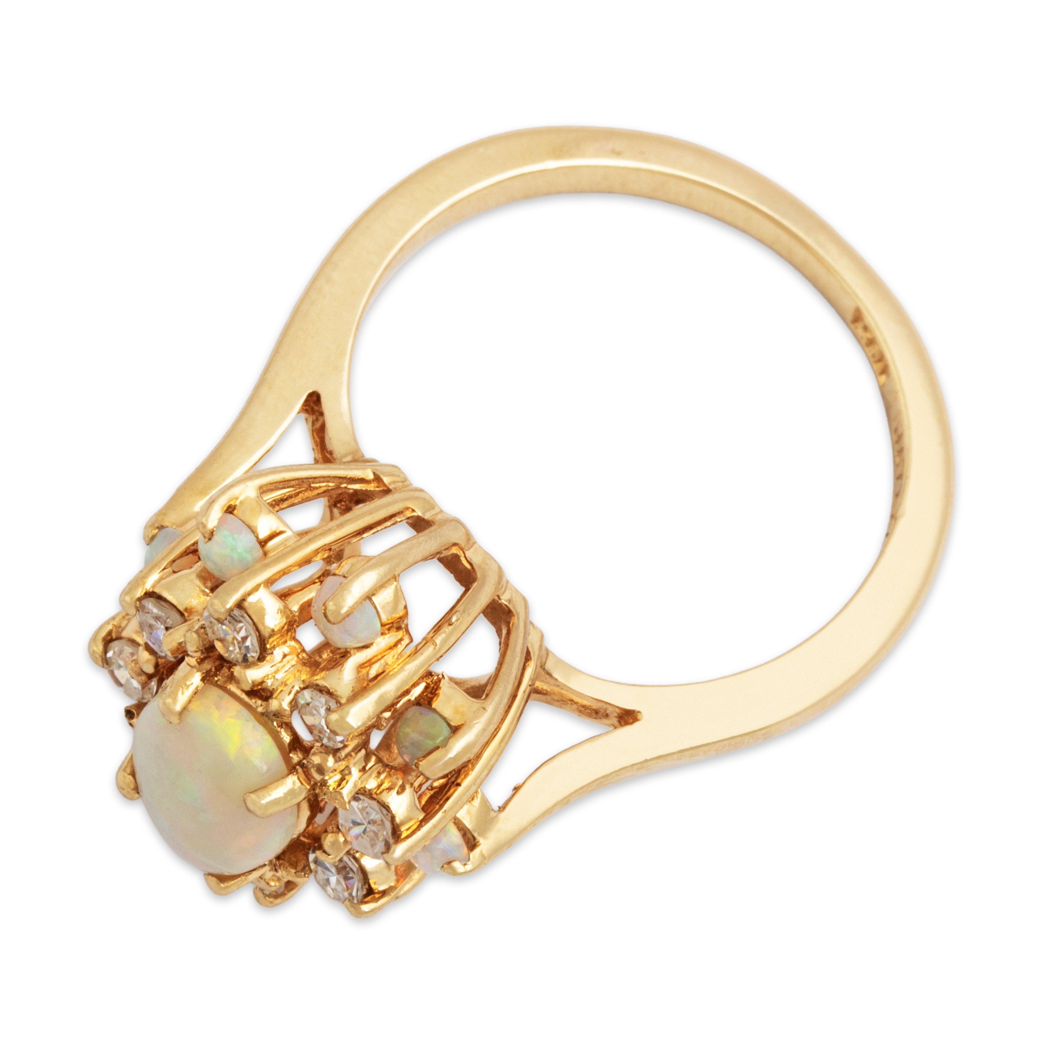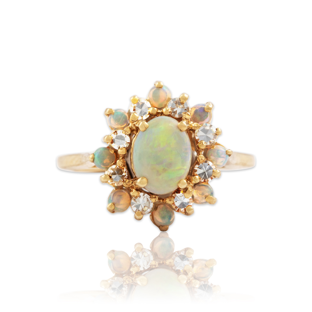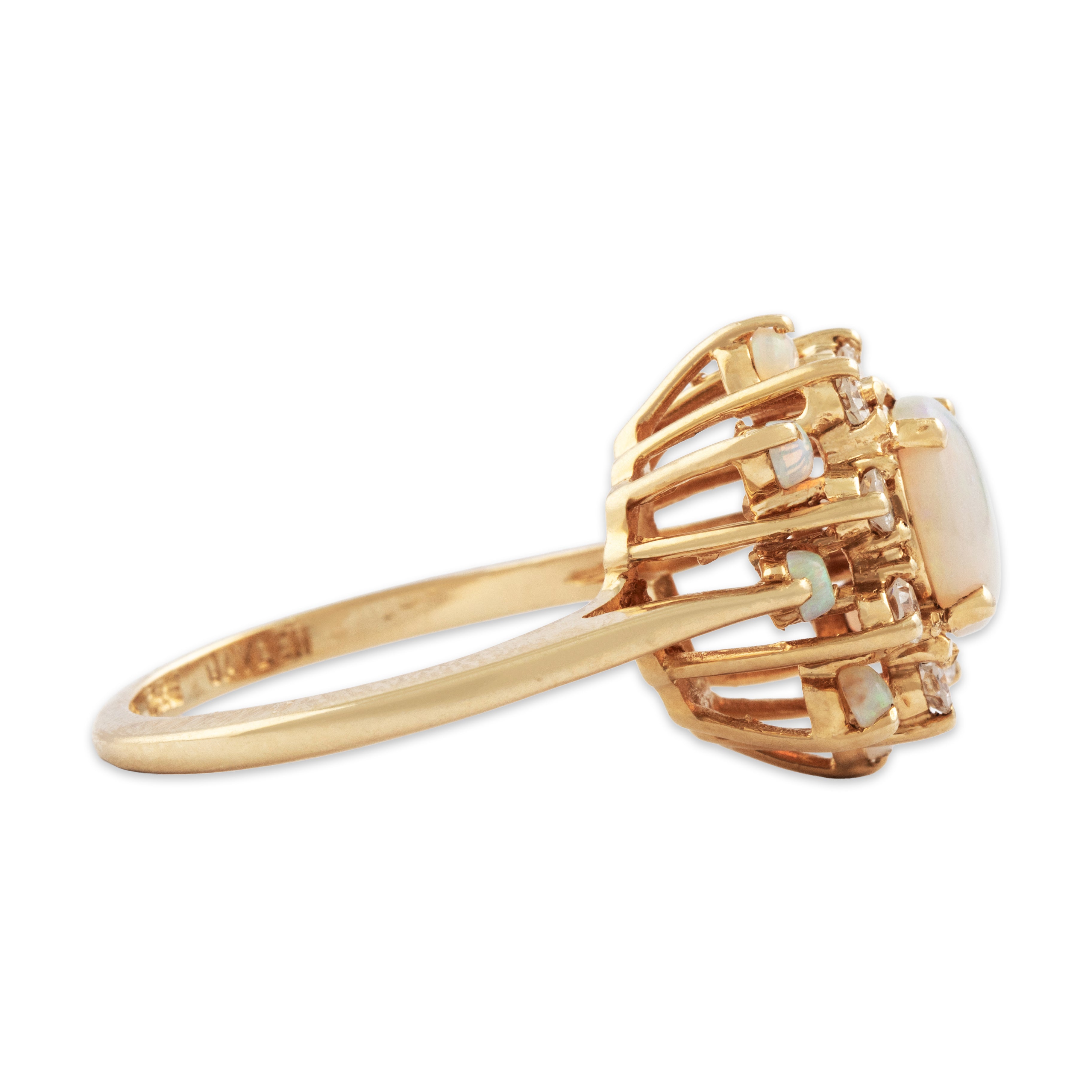 Discover this 14k yellow gold ring crafted by a vintage maker in a wonderful dazzling double layer halo design featuring white opal and diamond. All gemstones are natural, earth mined stones, unless stated otherwise.