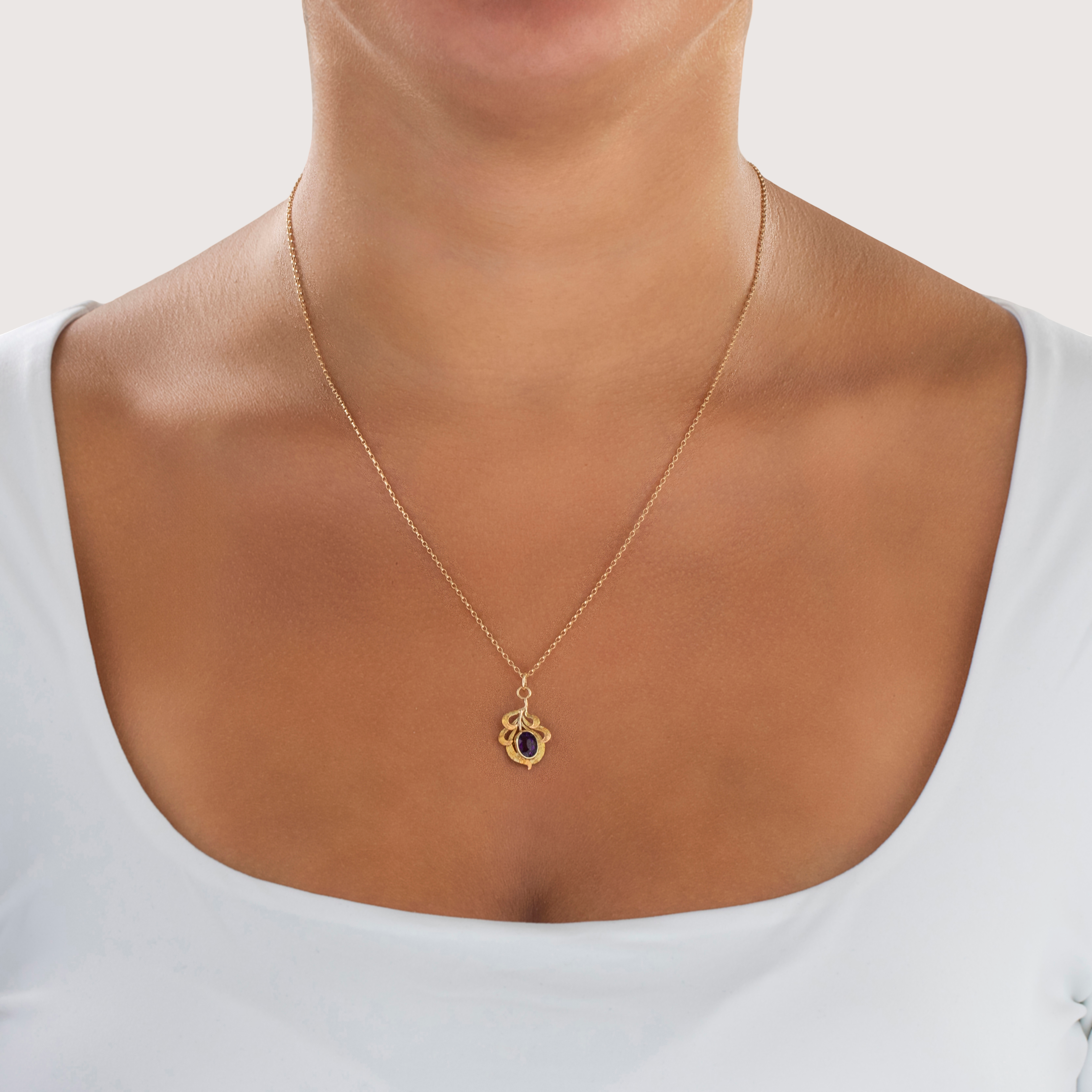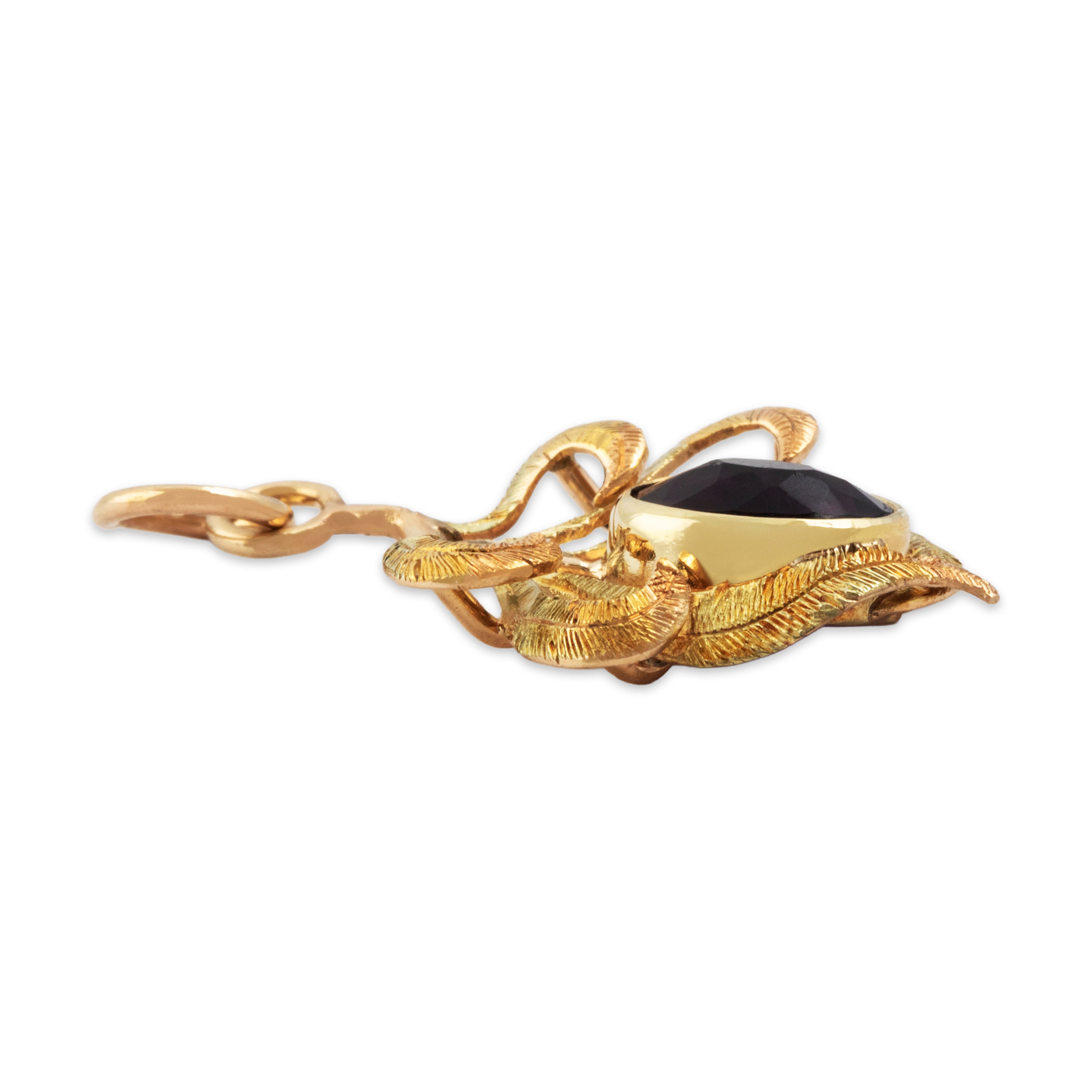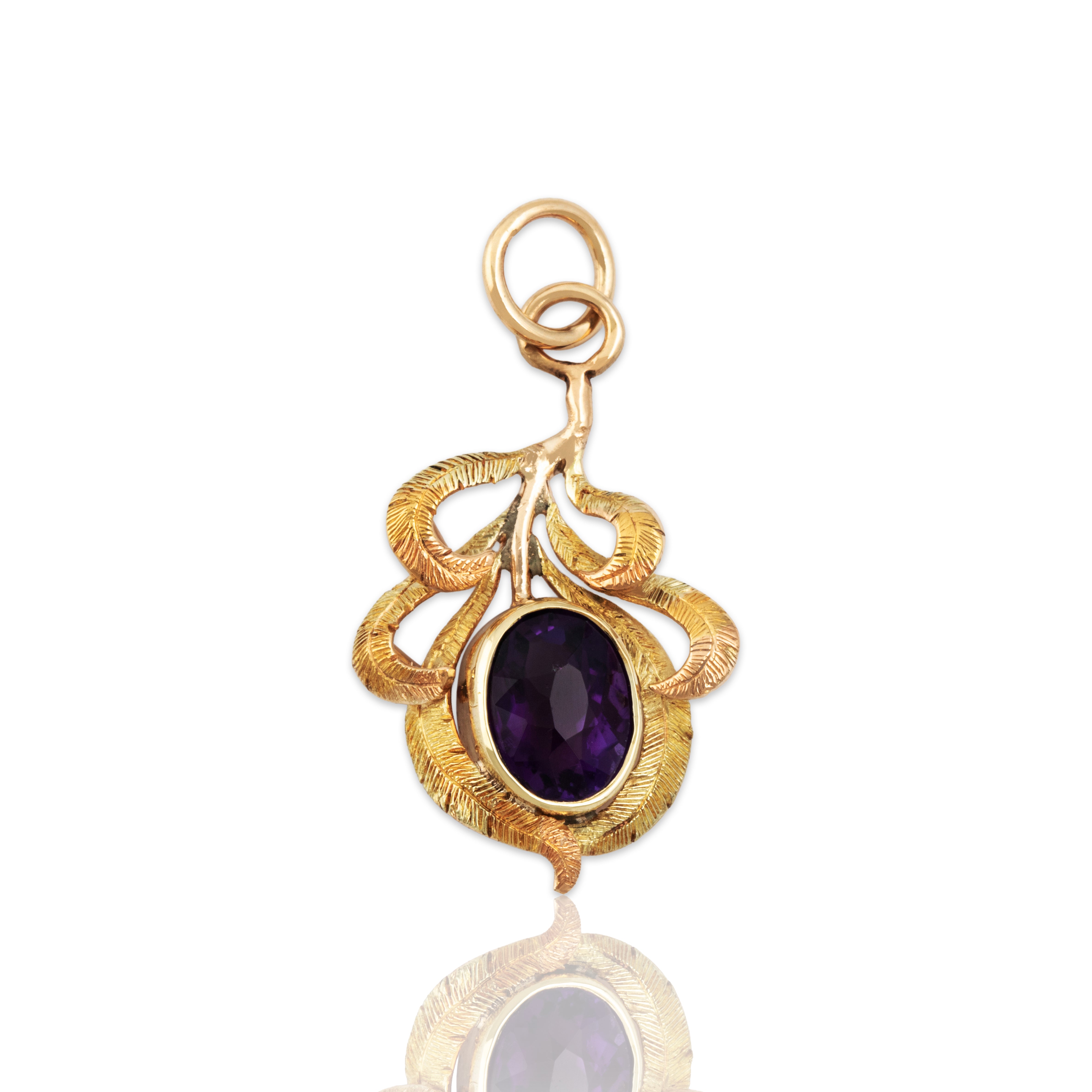 Discover this 14k yellow and rose gold charm/pendant crafted by an antique maker in an incredibly detailed leafy tendrils design featuring amethyst. All gemstones are natural, earth-mined stones, unless stated otherwise.