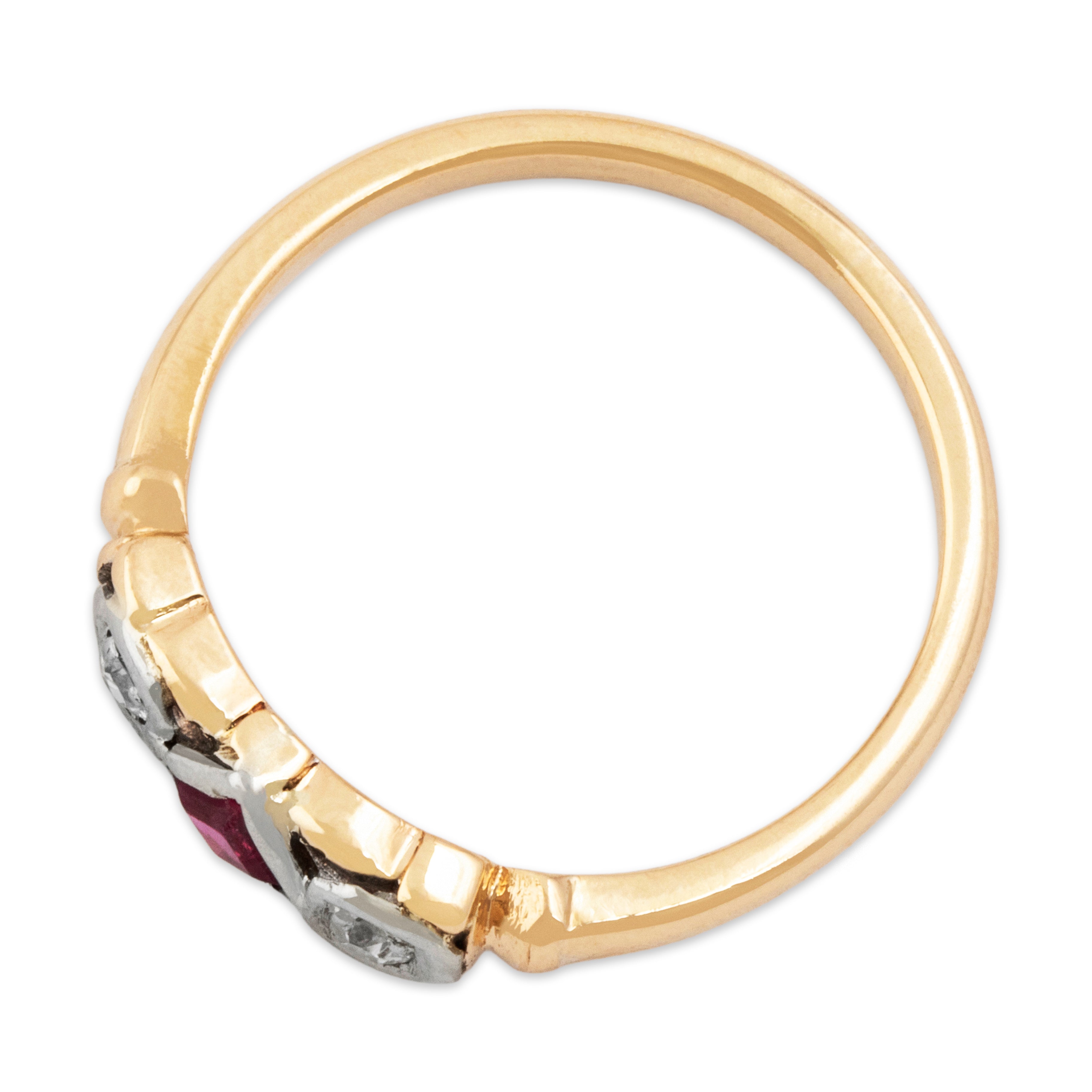 Condition: Very good condition, not eye-visible, seen under 10x magnification: minor nicks, surface wear to synthetic ruby, very minor nick to one diamond; minor wear to bezel, gold surface