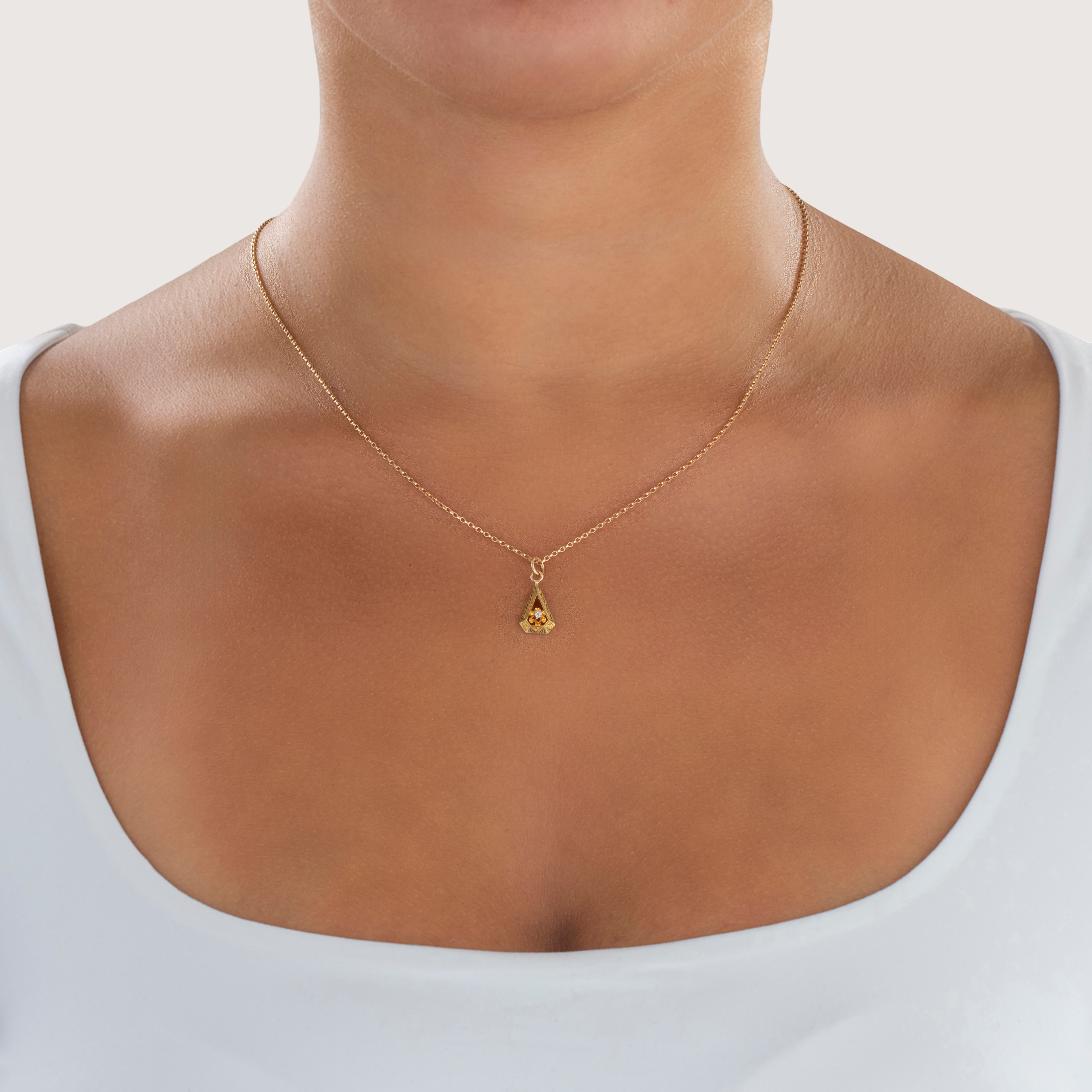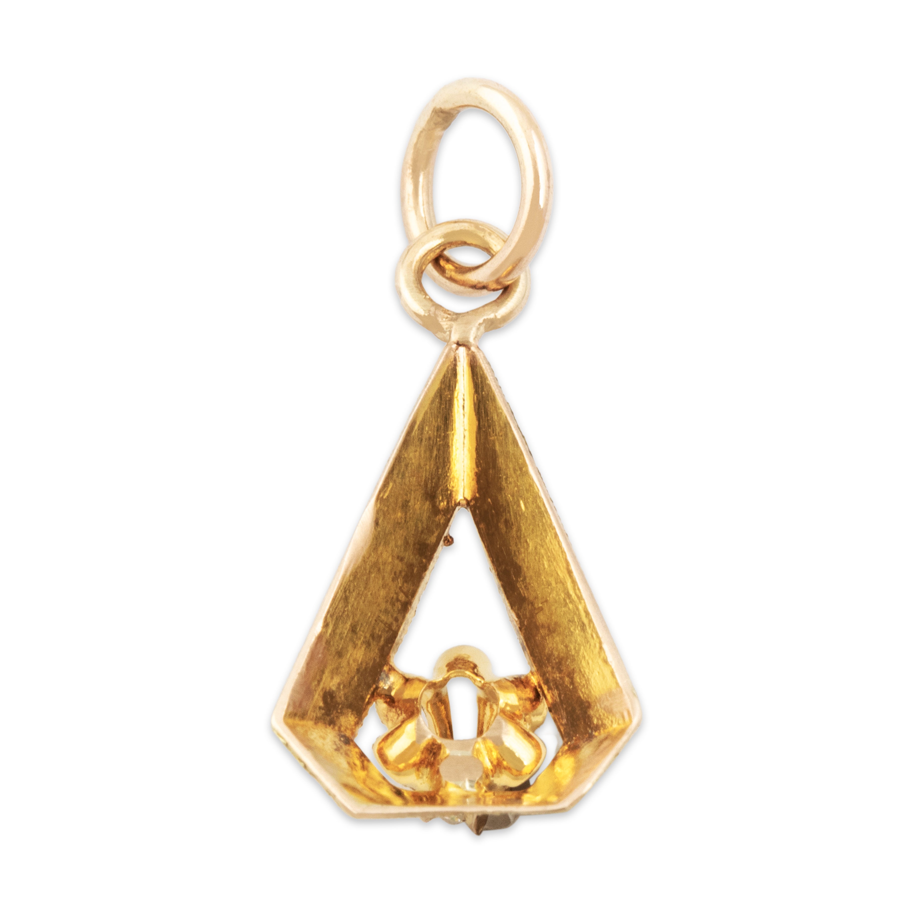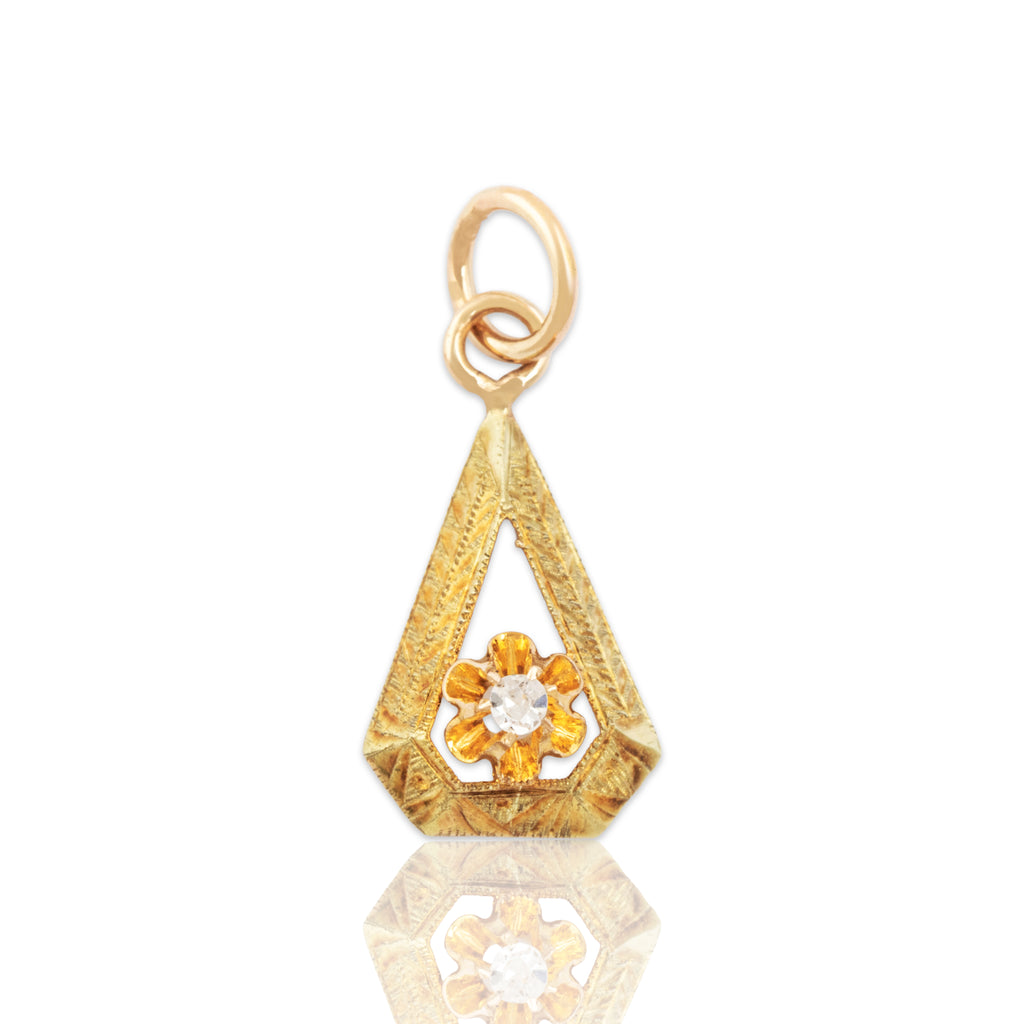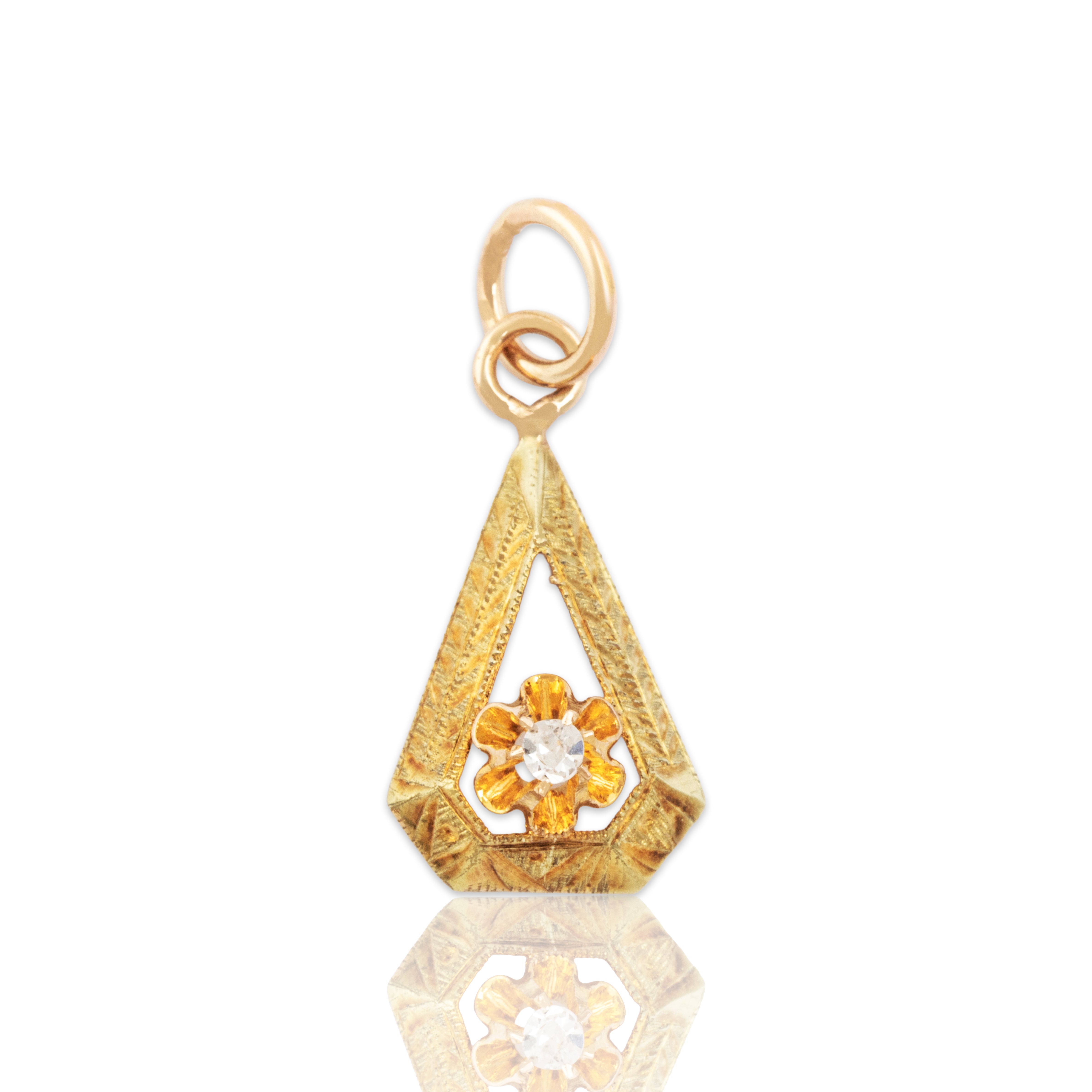 Discover this lightweight 14k yellow gold charm/pendant crafted by an antique maker in an engraved border buttercup design featuring diamond. All gemstones are natural, earth-mined stones, unless stated otherwise.
