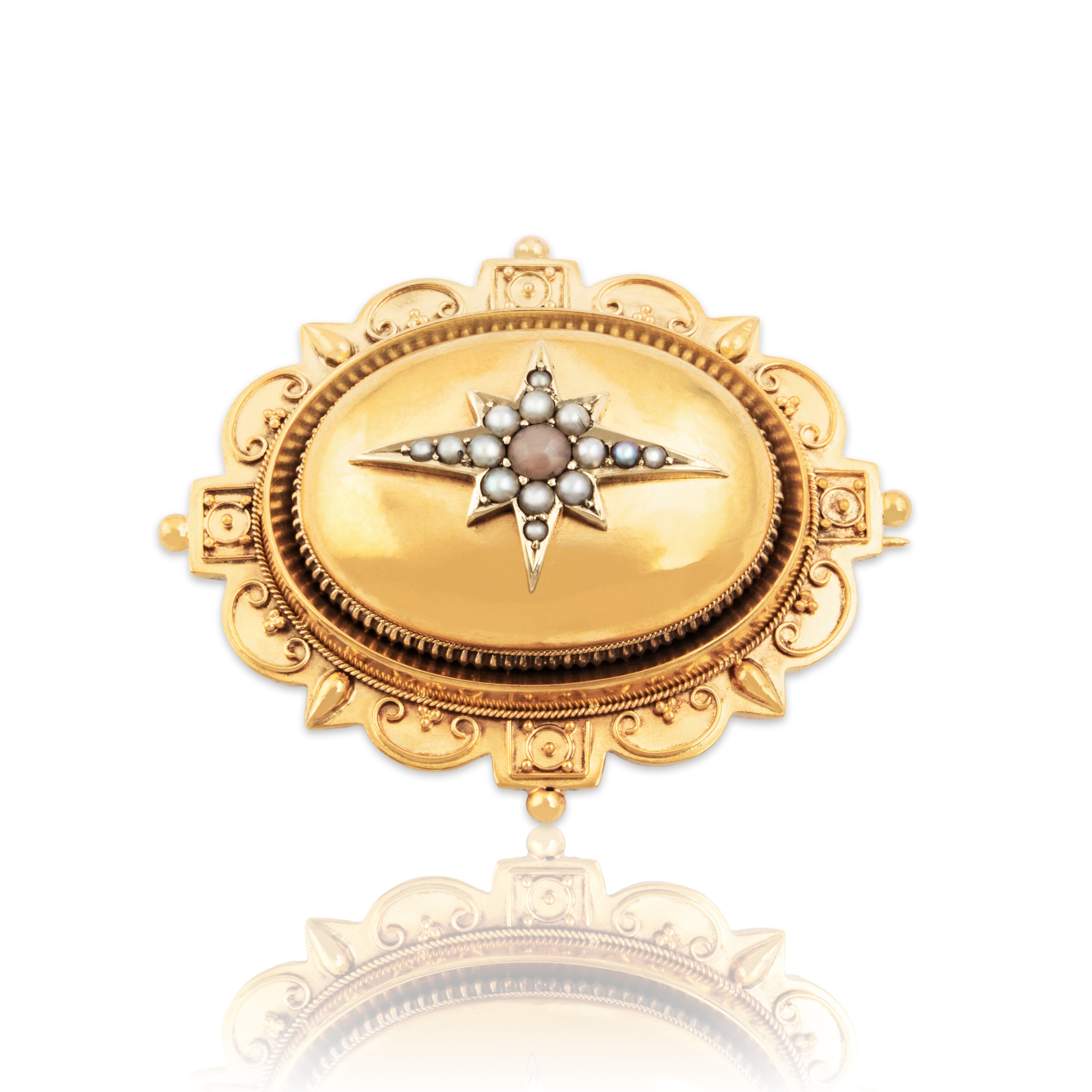 Discover this large 14k yellow gold pin / pendant crafted by an antique maker in a wonderful Victorian decorated design featuring angel skin coral and pearl. All gemstones are natural, earth mined stones, unless stated otherwise.