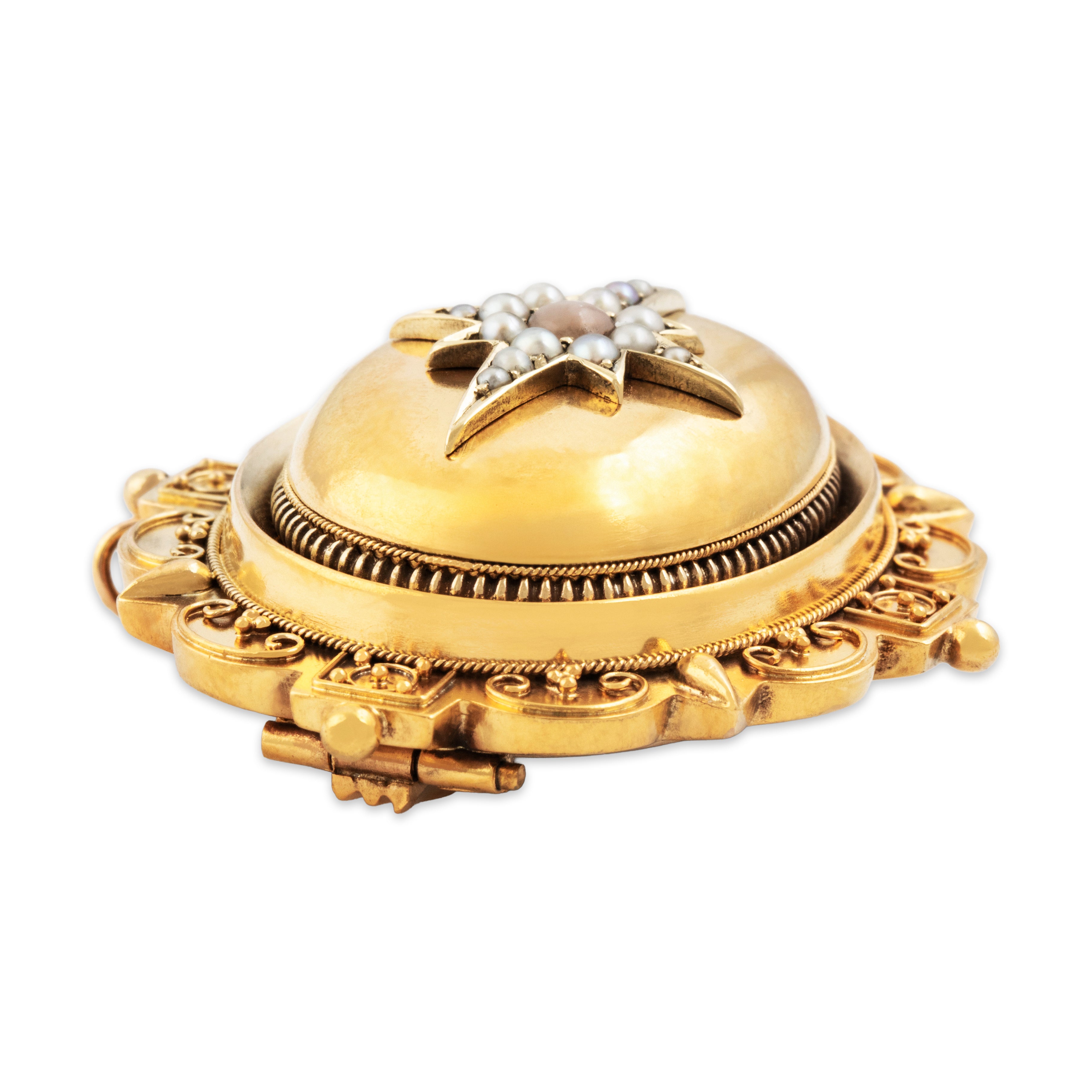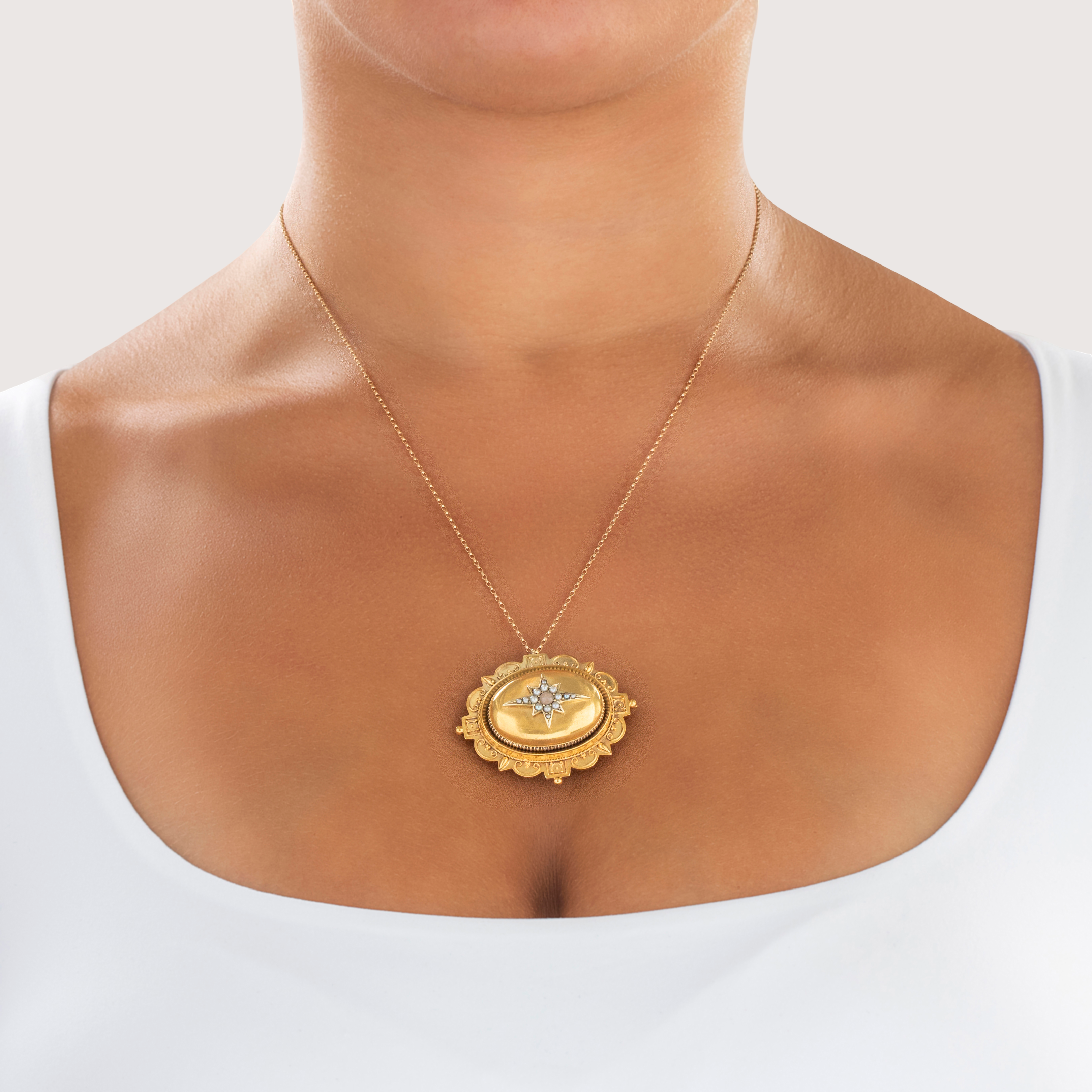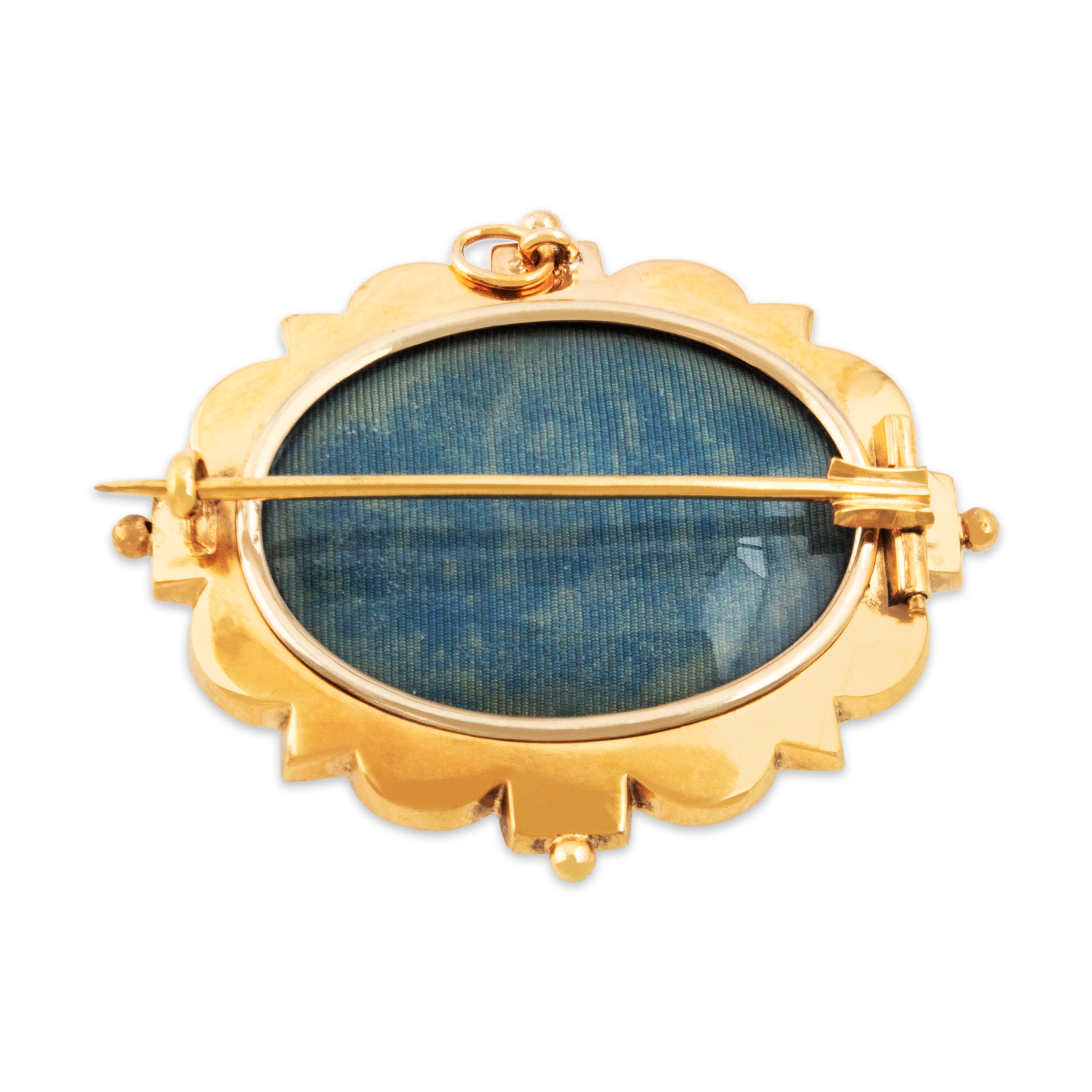 Appraiser Notes: Please note that the reverse of this pendant has a glass window revealing a blue ribbon. Additionally, the pin portion of this piece is 10k gold.