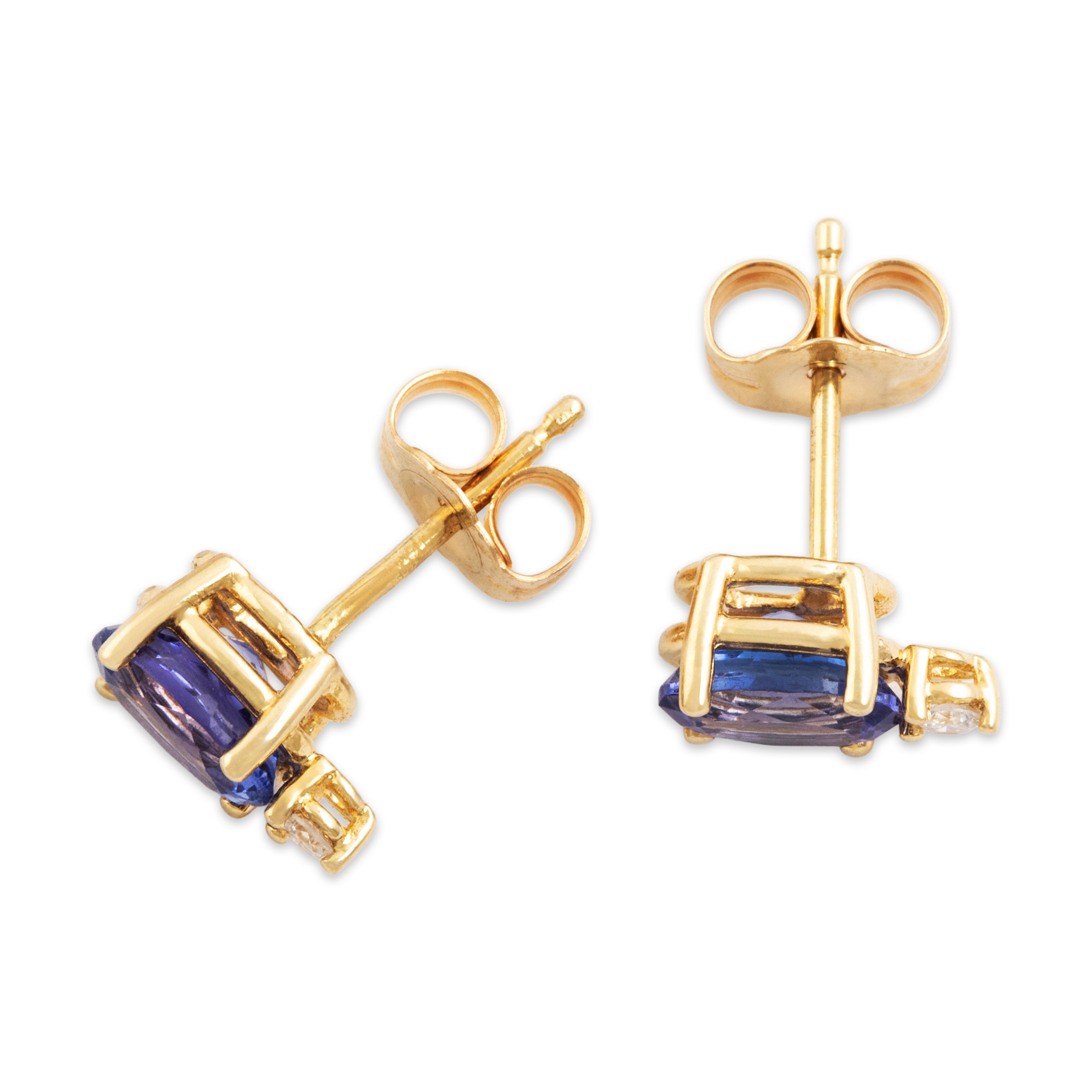 Discover a pair of 14k yellow gold stud earrings crafted by a vintage maker in this wonderful pretty oval duo design featuring tanzanite and diamond. All gemstones are natural, earth mined stones, unless stated otherwise.