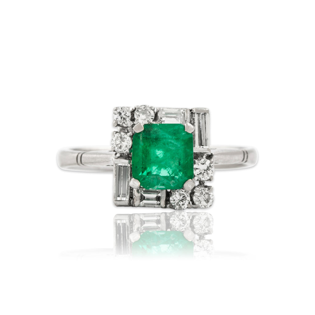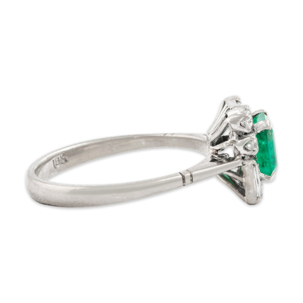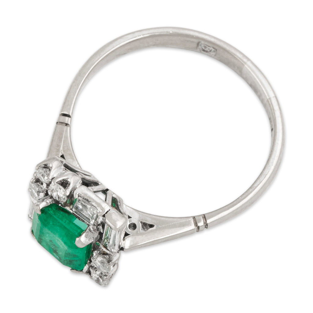 Condition: Very good condition, not eye-visible, seen under 10x magnification: minor nicks and surface wear to emerald; minor mark to shank from previous resizing, minor wear to gold