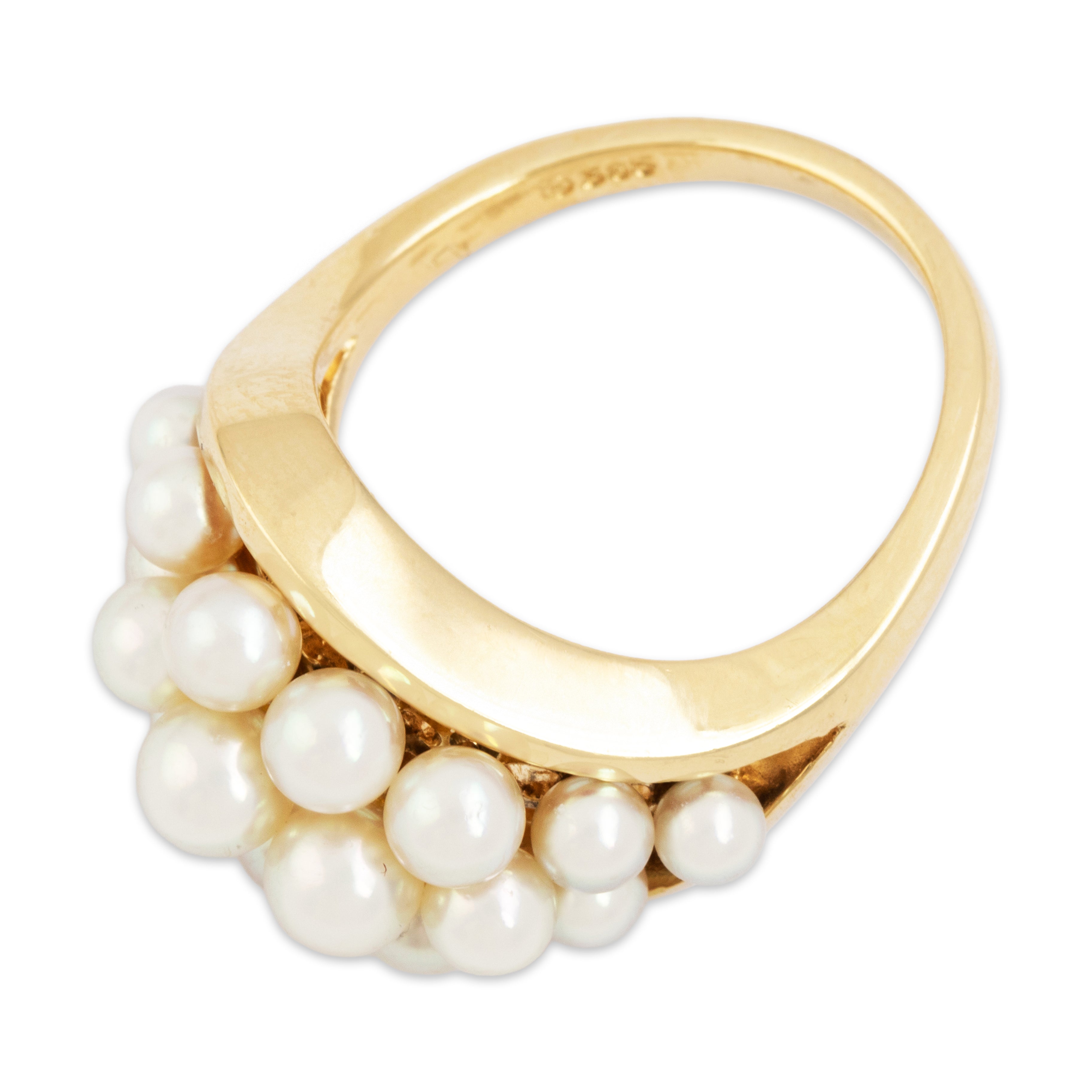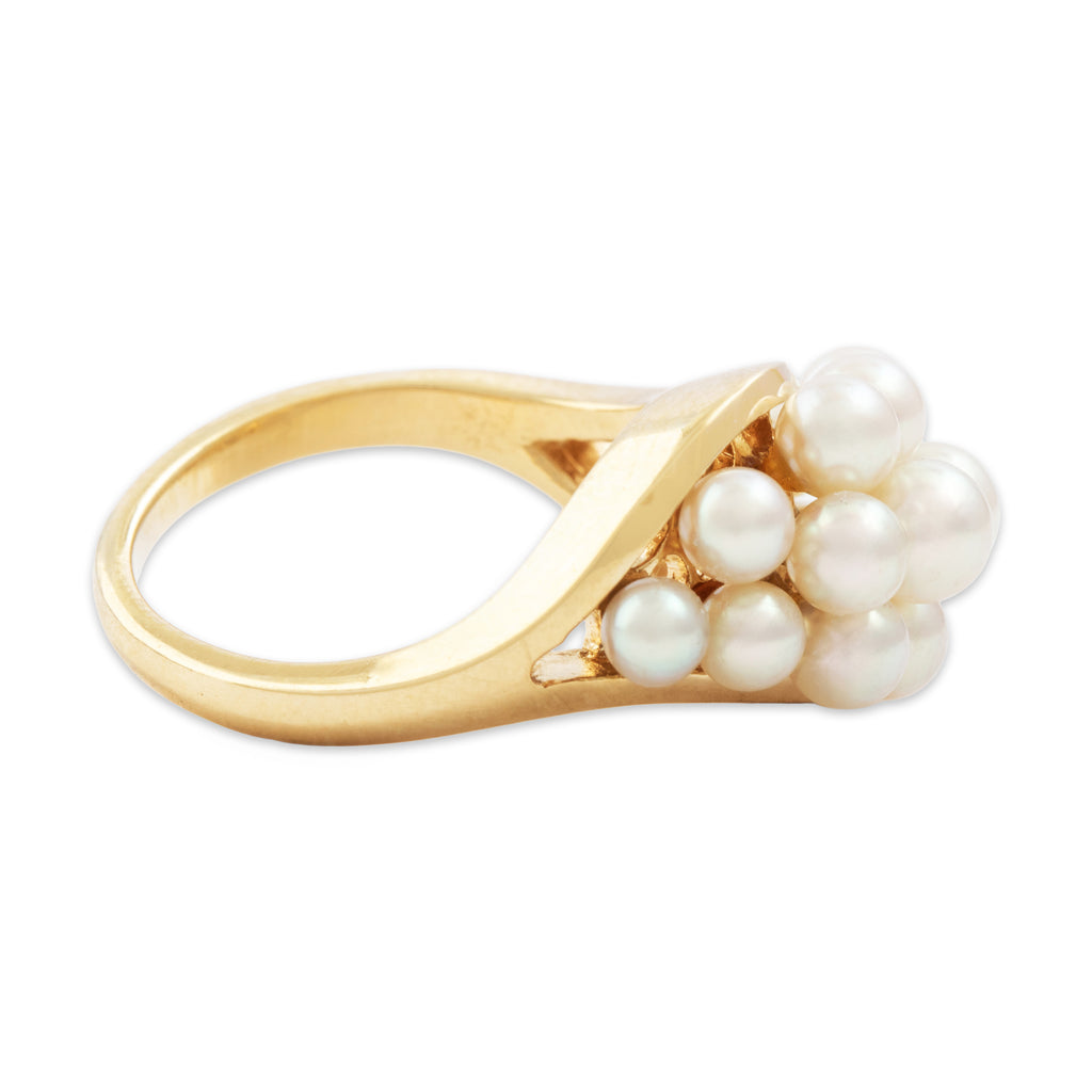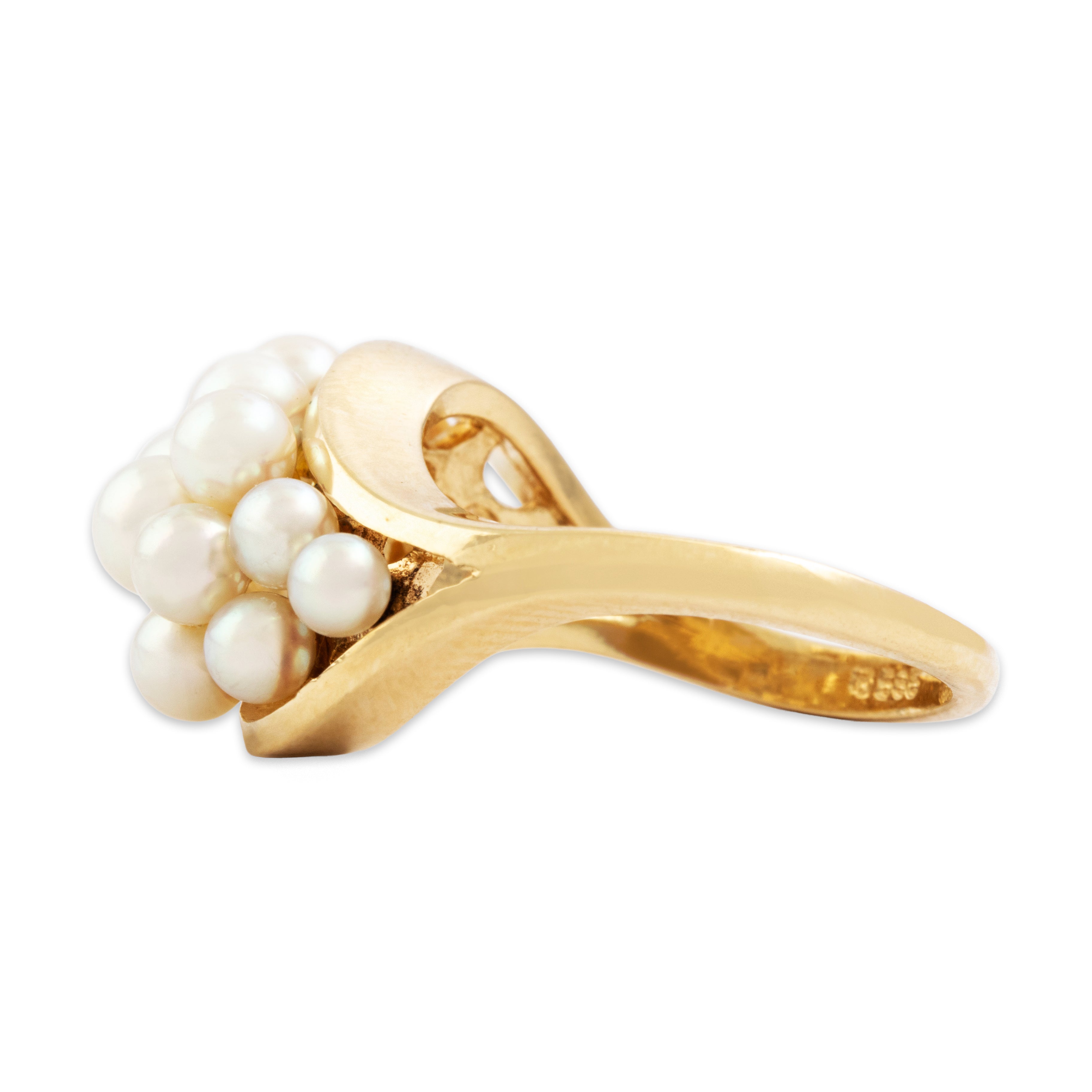 Discover this vintage 14k yellow gold ring crafted by Mikimoto in this beautiful waving cluster design featuring pearl. All gemstones are natural, earth mined stones, unless stated otherwise.