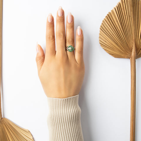 Vintage 14k Yellow Gold 2.05ct Jade Tall Geometric Flower Cabochon Ring 6.75