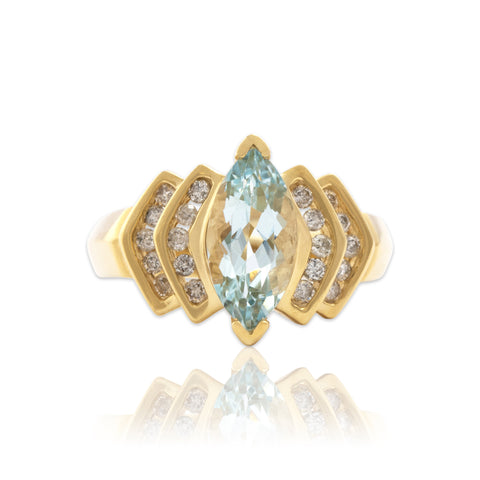 Vintage 14k Yellow Gold 1.49ct Aquamarine Diamond Dynamic Step Shoulder Ring 7.75