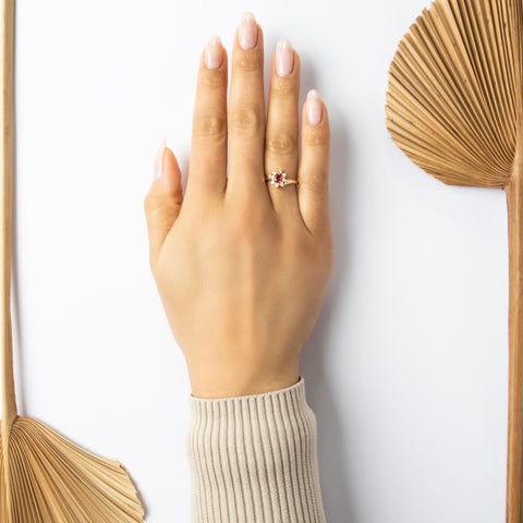 Vintage 14k Yellow Gold Ruby Diamond Pretty Floral Bypass Ring 6.50