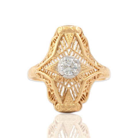 Vintage 14k Yellow Gold .18ct Diamond Ornate Open Shield Ring 6.50
