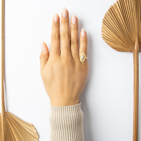 Vintage 14k Yellow Gold Pearl Diamond Sparkling Halo Ring 5.75