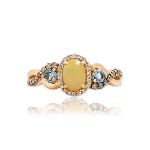 Estate 14k Rose Gold Jelly Opal Blue Topaz Champagne & White Diamond Ring 7.00
