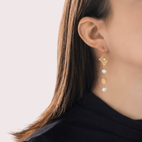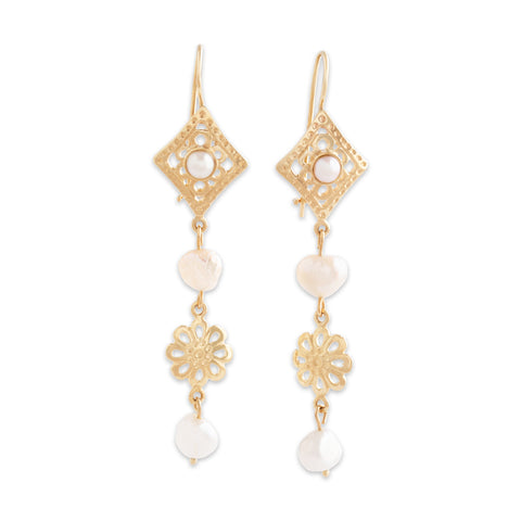 Vintage Long 14k Yellow Gold Baroque Pearl Floral Cutout Dangle Earrings