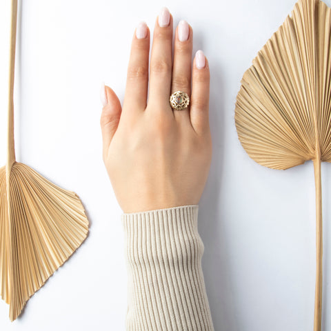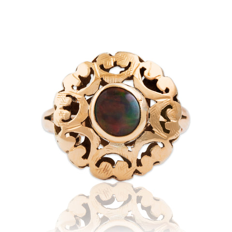 Vintage 14k Rosy Yellow Gold Opal Doublet Openwork Orb Cocktail Ring 7.50